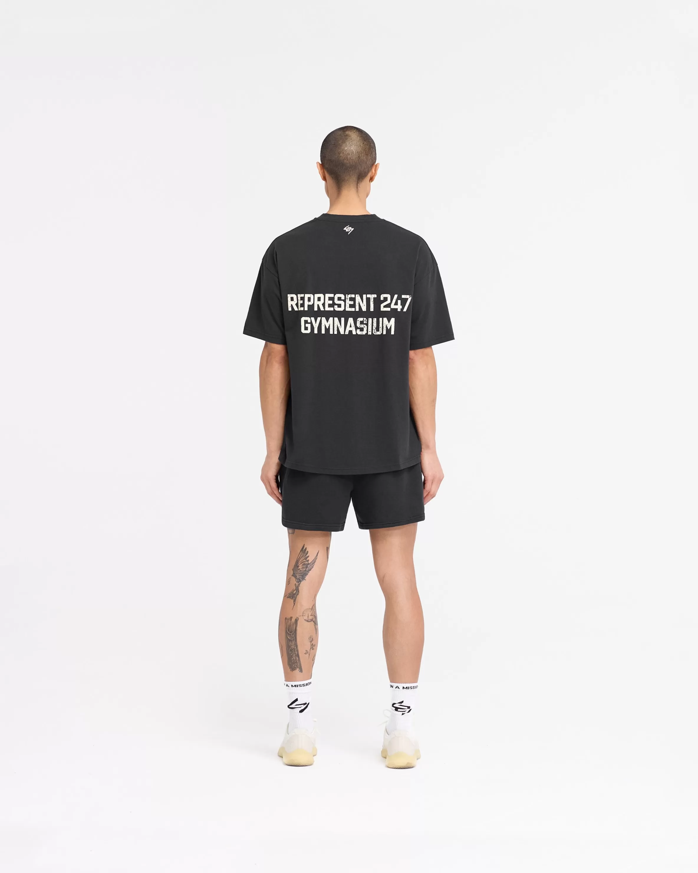 Introducing the 247 Gymnasium Jersey Shorts in Off Black, a fleece back cotton short style with a super boxy fit with short inseam. The shorts have an elasticated waistband and internal drawcord for comfort, side seam pockets, and our cracked style Represent 247 Gymnasium print to the front of the leg. 247 Gymnasium Jersey Shorts Off Black Very Boxy Fit with Short Inseam Elasticated Waistband u0026amp; Internal Drawcord Represent 247 Gymnasium Print Composition: 100% Cotton420gsm Model is 187cm and 76kg wearing size MProduct