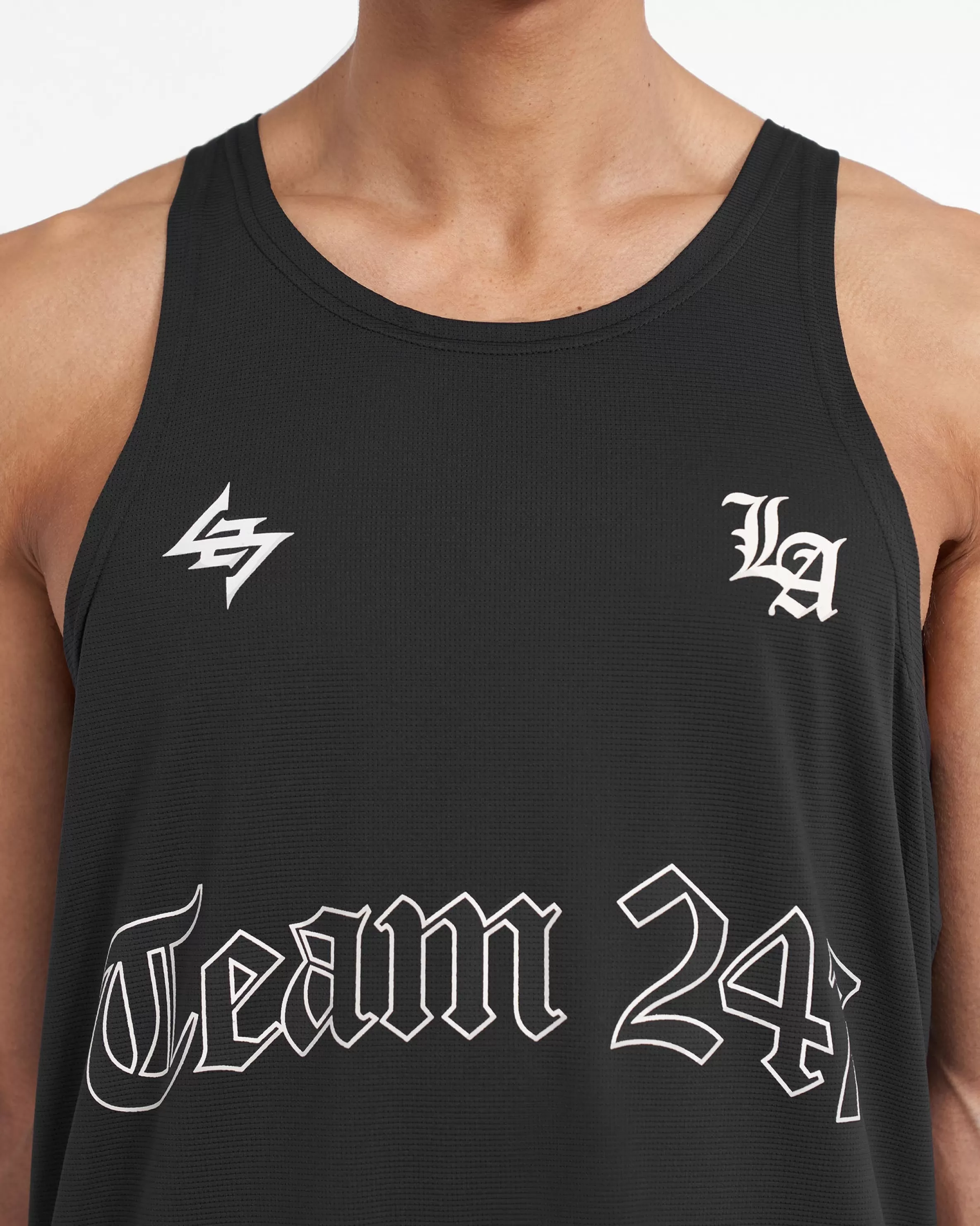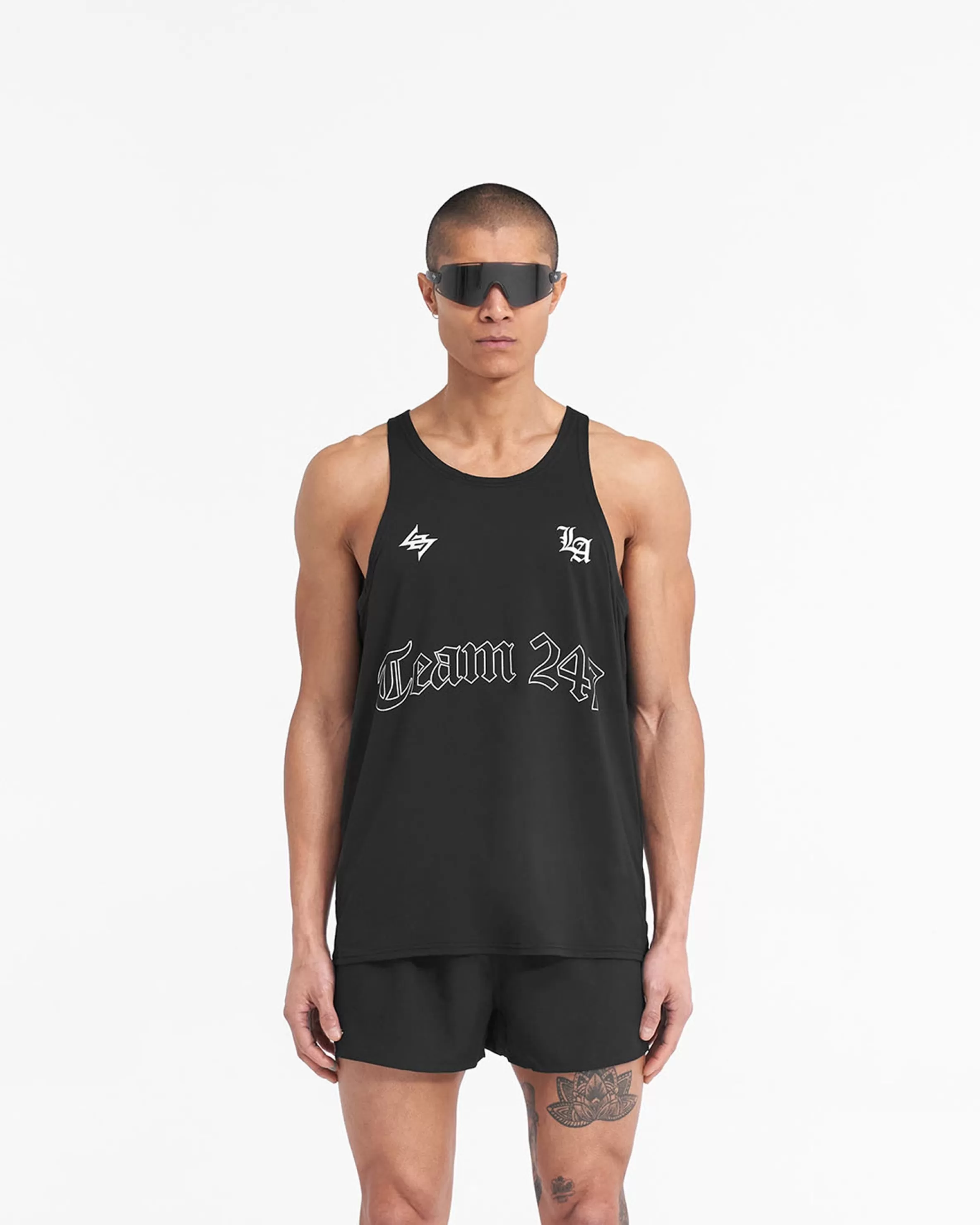 Introducing the 247 LA Marathon Singlet in Black. Featuring a quick dry, lightweight compact mesh construction, and a st…