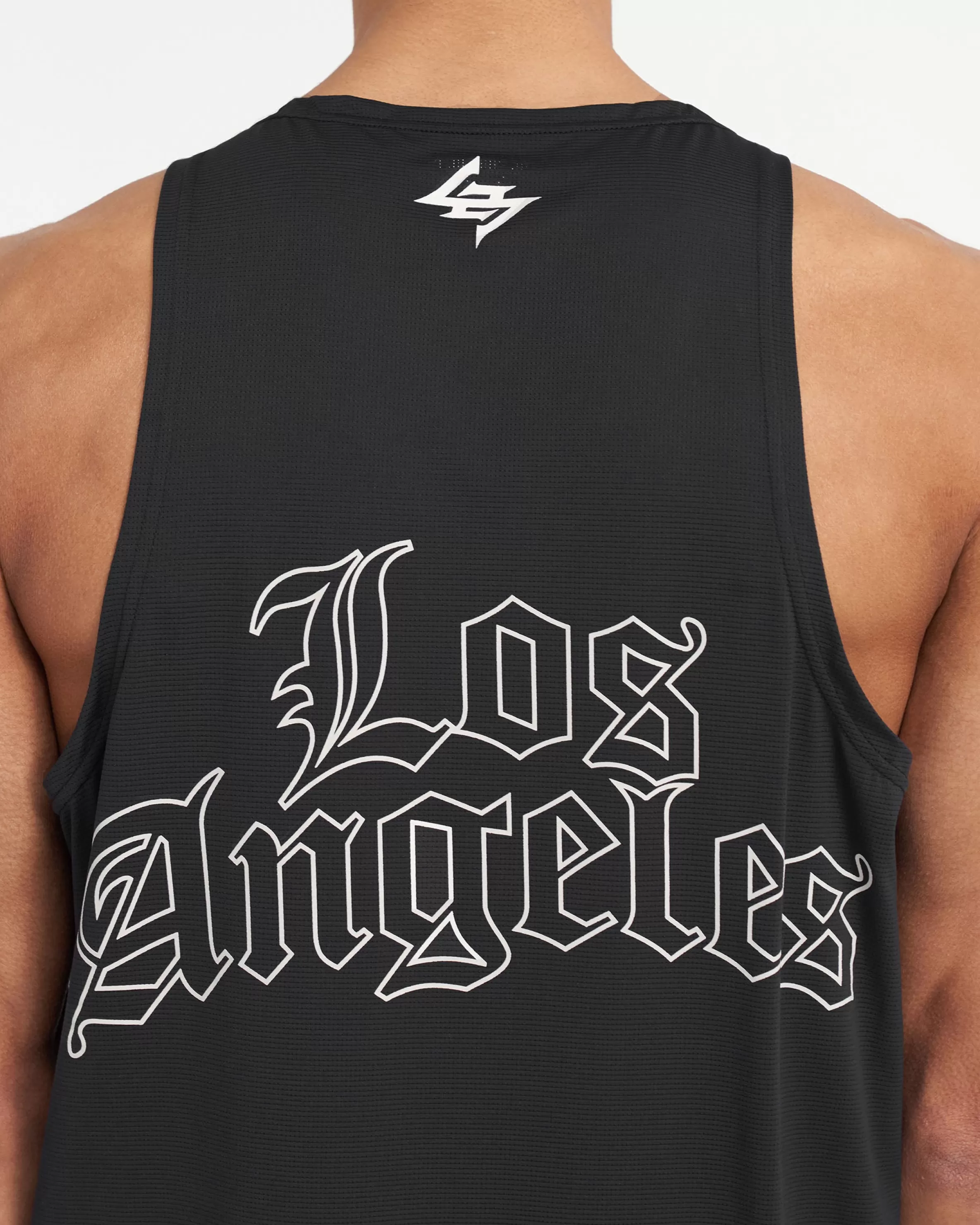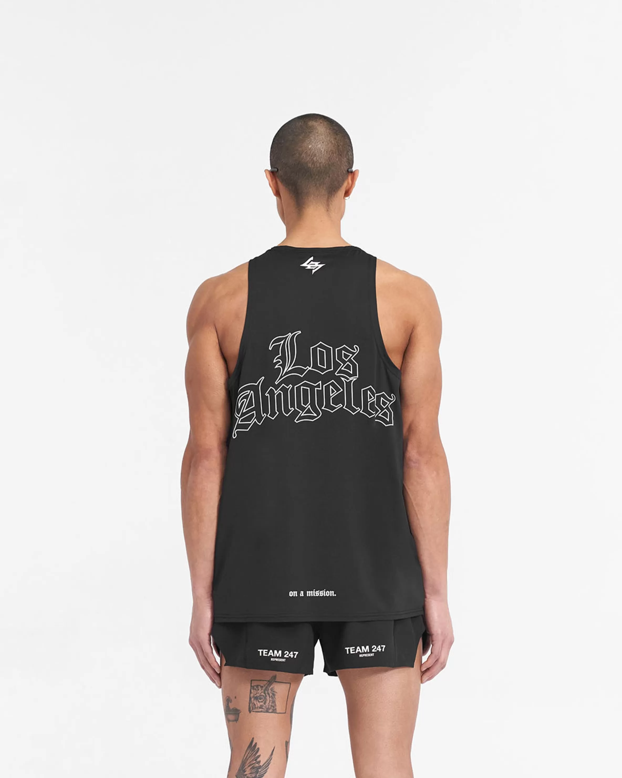 Introducing the 247 LA Marathon Singlet in Black. Featuring a quick dry, lightweight compact mesh construction, and a standard fit with 4-way stretch, this running vest offers complete freedom of movement as you train or run. The breathable and cooling fabric works with your body’s thermo-regulation mechanisms to optimise your performance over time. Sweat wicking technology absorbs and evenly re-distributes moisture into the air as you run, helping maintain freshness till the second your workout ends. It also offers UV protection for safe coverage in every climate. The LA Marathon Singlet features our screen printed gothic Team 247 graphic to the front and Los Angeles graphic to the back. It also carries our gothic 247 logo to the front and back neck, and is finished with our small LA graphic to the chest and On a Mission motif to the back. Jet Black Running Singlet Compact Mesh Fabric Standard Fit Freshfeel Cooling Technology Lightweight u0026amp; Breathable UV Protection Moisture Wicking Quick Drying Self Fabric Binding to Neck u0026amp; Arm Holes Composition: 86% Polyester, 14% Elastane Model is 187cm and 76kg wearing size MediumProduct