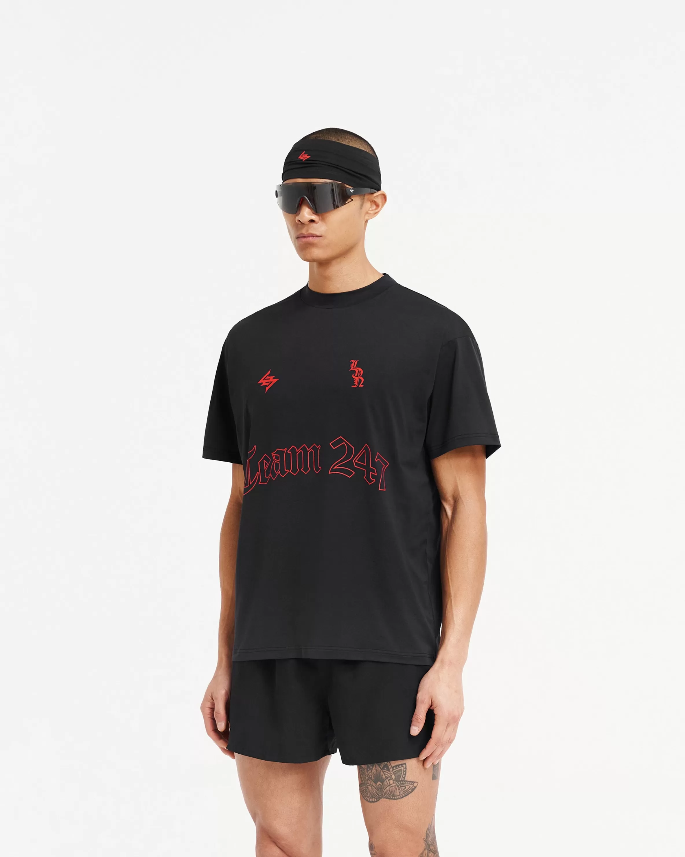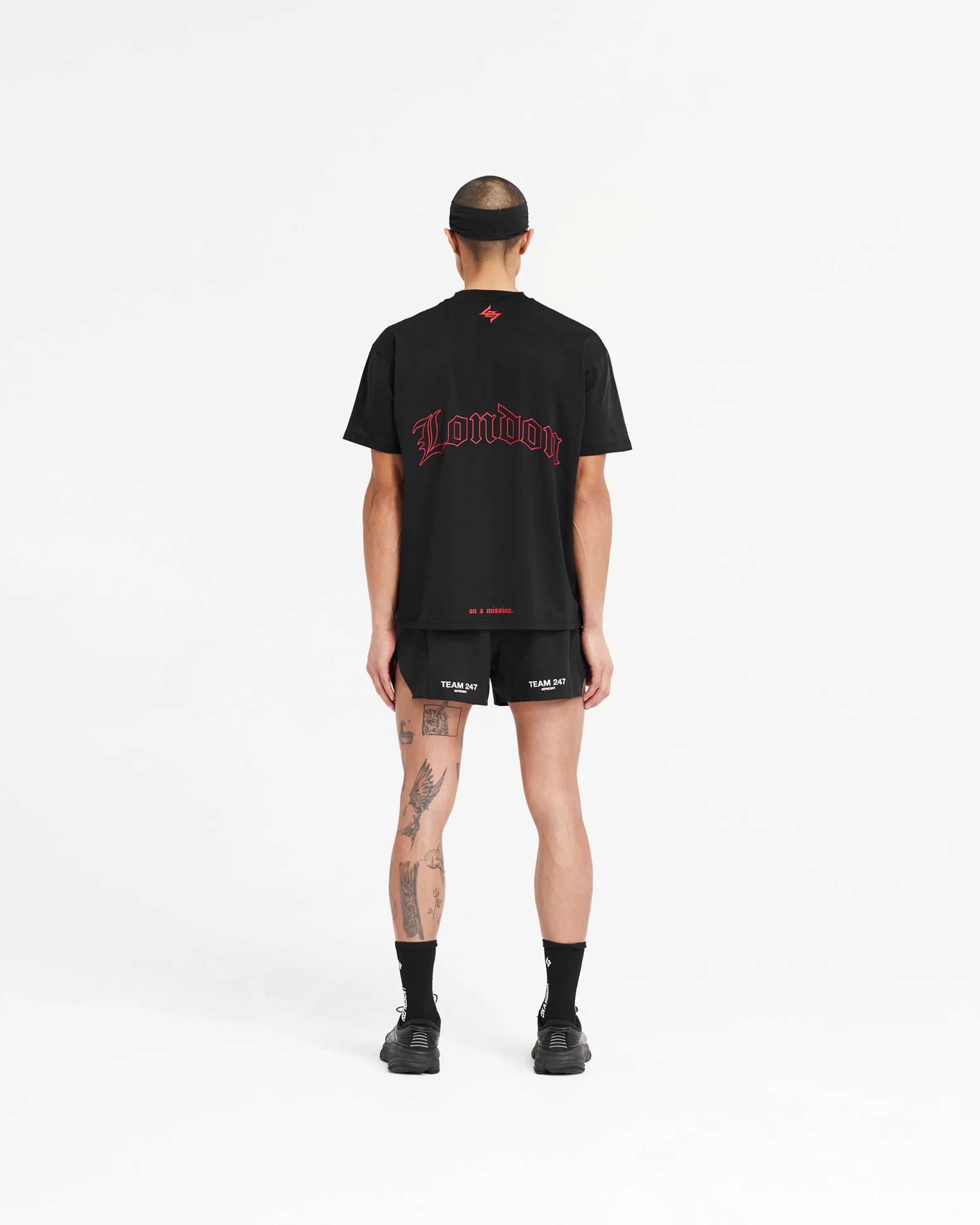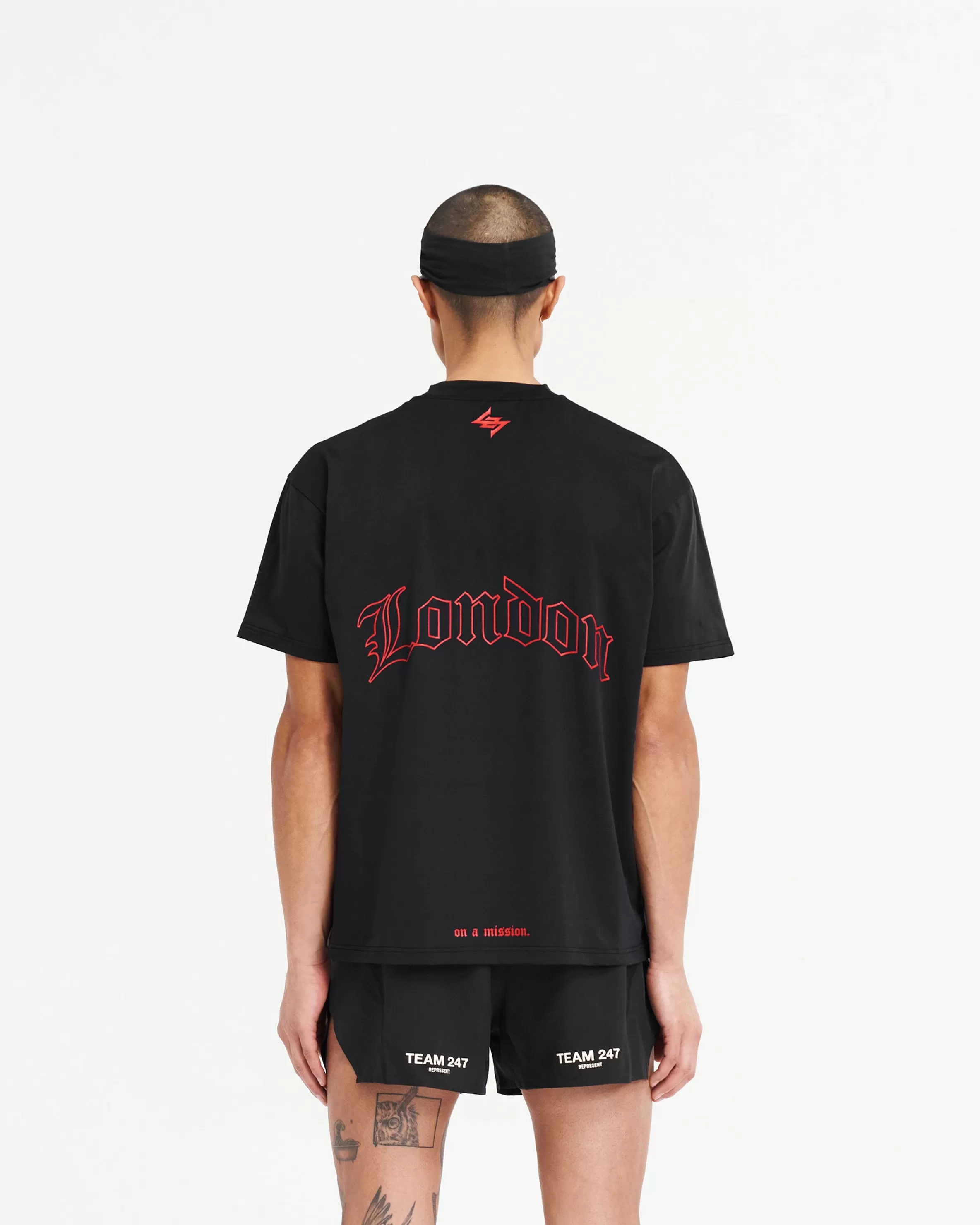 Introducing the 247 London Oversized T-Shirt in Black. Featuring a quick dry, lightweight compact mesh construction and an oversized fit with 4-way stretch, this running top offers complete freedom of movement as you train or run. The breathable and cooling fabric works with your body’s thermo-regulation mechanisms to optimise your performance over time. Sweat wicking technology absorbs and evenly re-distributes moisture into the air as you run, helping maintain freshness till the second your workout ends. It also offers UV protection for safe coverage in every climate. The London T-Shirt features our screen printed gothic Team 247 graphic to the front and London graphic to the back. It also carries our gothic 247 logo to the front and back neck, and is finished with our small LDN graphic to the chest and On a Mission motif to the back. Jet Black Running Top Compact Mesh Fabric Oversized Fit Freshfeel Cooling Technology Lightweight u0026amp; Breathable UV Protection Moisture Wicking Quick Drying Self Fabric Collar Composition: 86% Polyester, 14% ElastaneModel is 187cm and 76kg wearing size MediumProduct