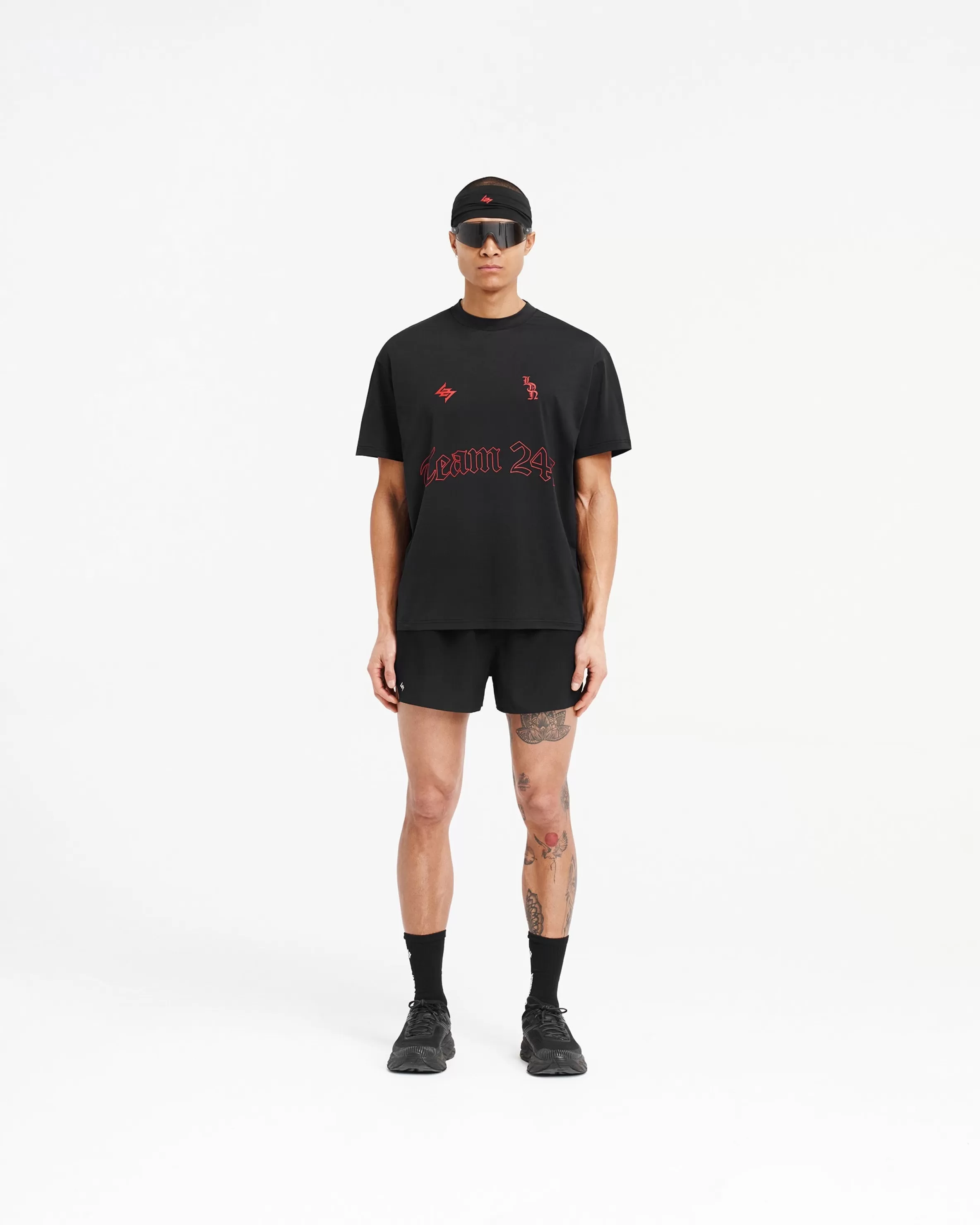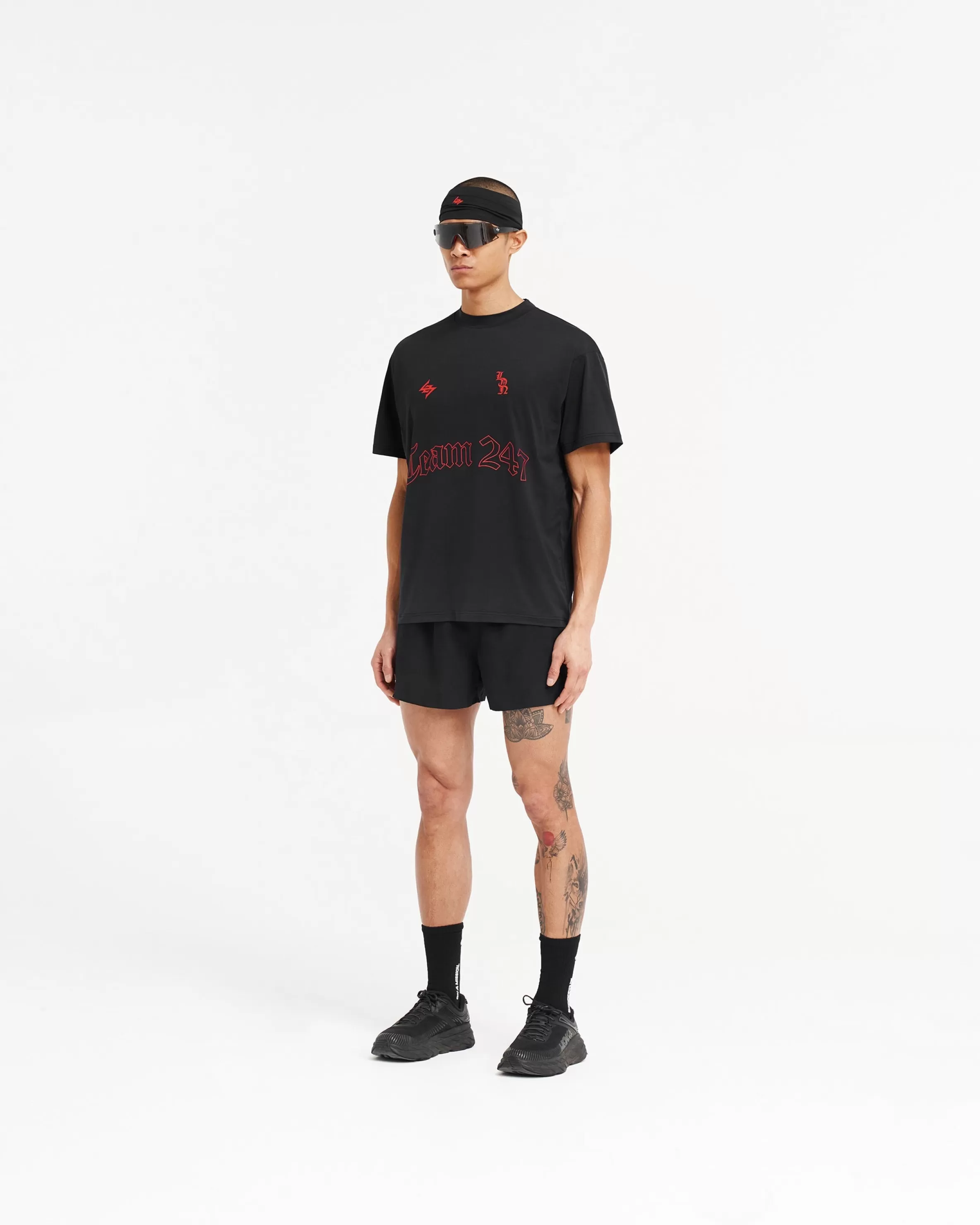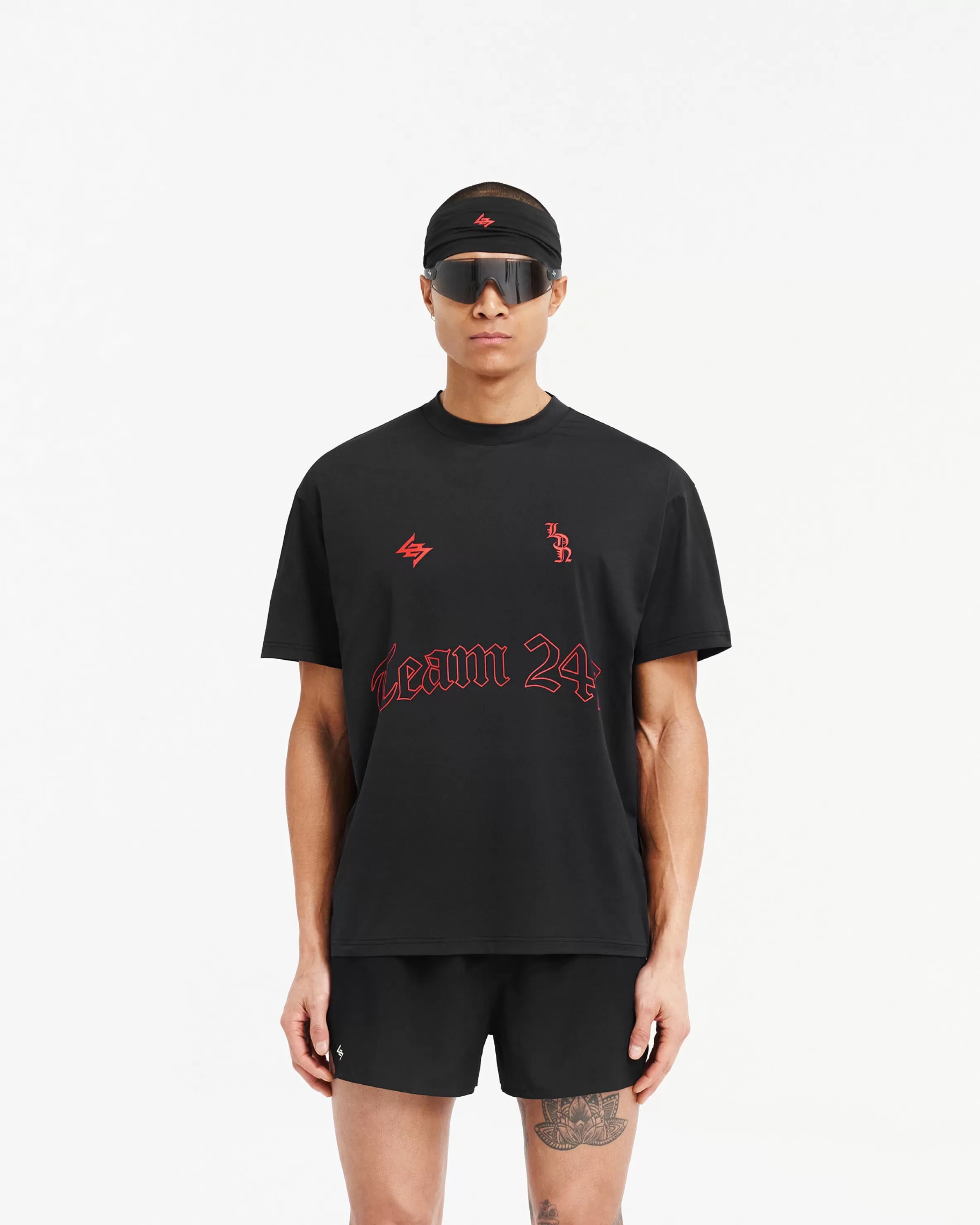 Introducing the 247 London Oversized T-Shirt in Black. Featuring a quick dry, lightweight compact mesh construction and an oversized fit with 4-way stretch, this running top offers complete freedom of movement as you train or run. The breathable and cooling fabric works with your body’s thermo-regulation mechanisms to optimise your performance over time. Sweat wicking technology absorbs and evenly re-distributes moisture into the air as you run, helping maintain freshness till the second your workout ends. It also offers UV protection for safe coverage in every climate. The London T-Shirt features our screen printed gothic Team 247 graphic to the front and London graphic to the back. It also carries our gothic 247 logo to the front and back neck, and is finished with our small LDN graphic to the chest and On a Mission motif to the back. Jet Black Running Top Compact Mesh Fabric Oversized Fit Freshfeel Cooling Technology Lightweight u0026amp; Breathable UV Protection Moisture Wicking Quick Drying Self Fabric Collar Composition: 86% Polyester, 14% ElastaneModel is 187cm and 76kg wearing size MediumProduct