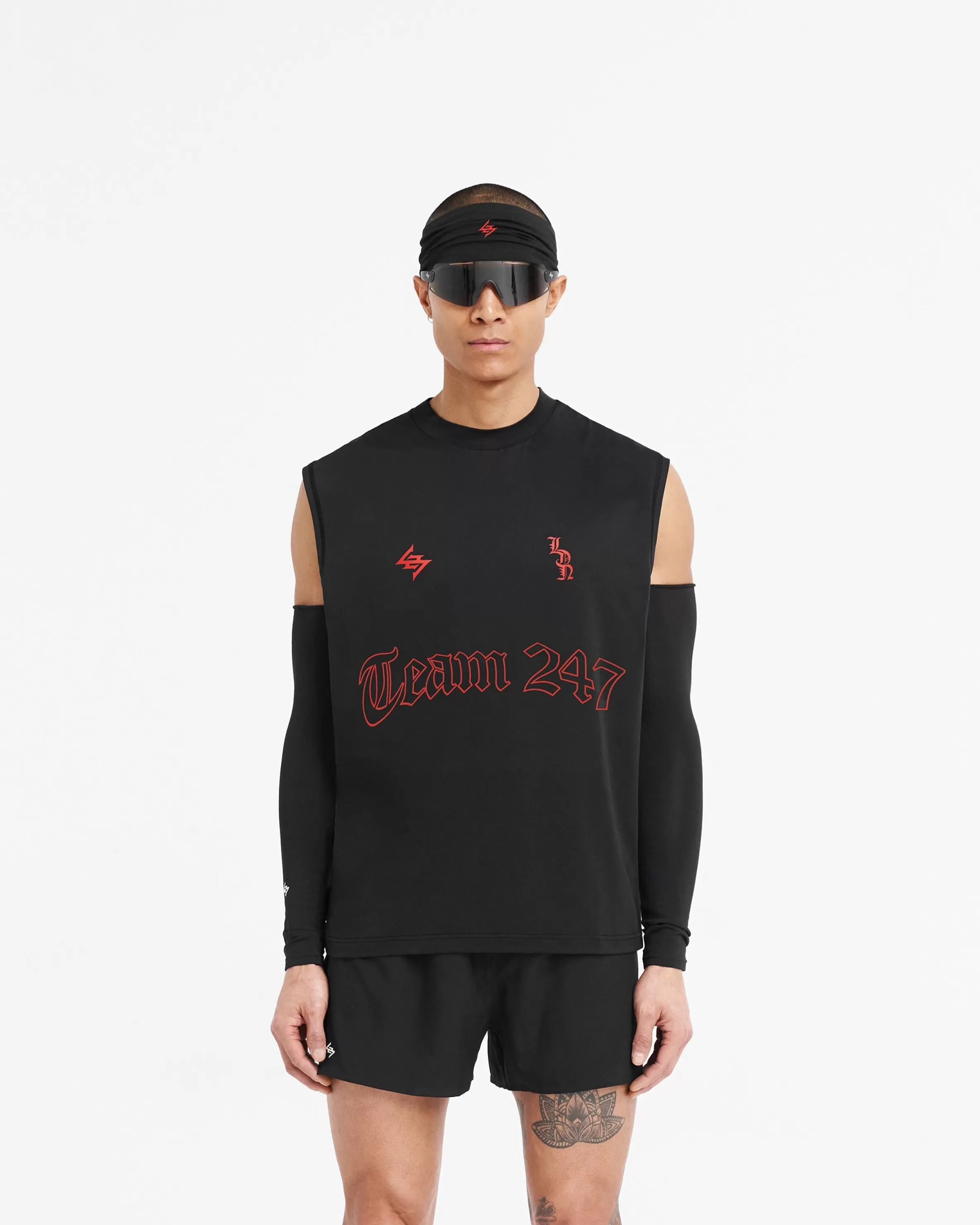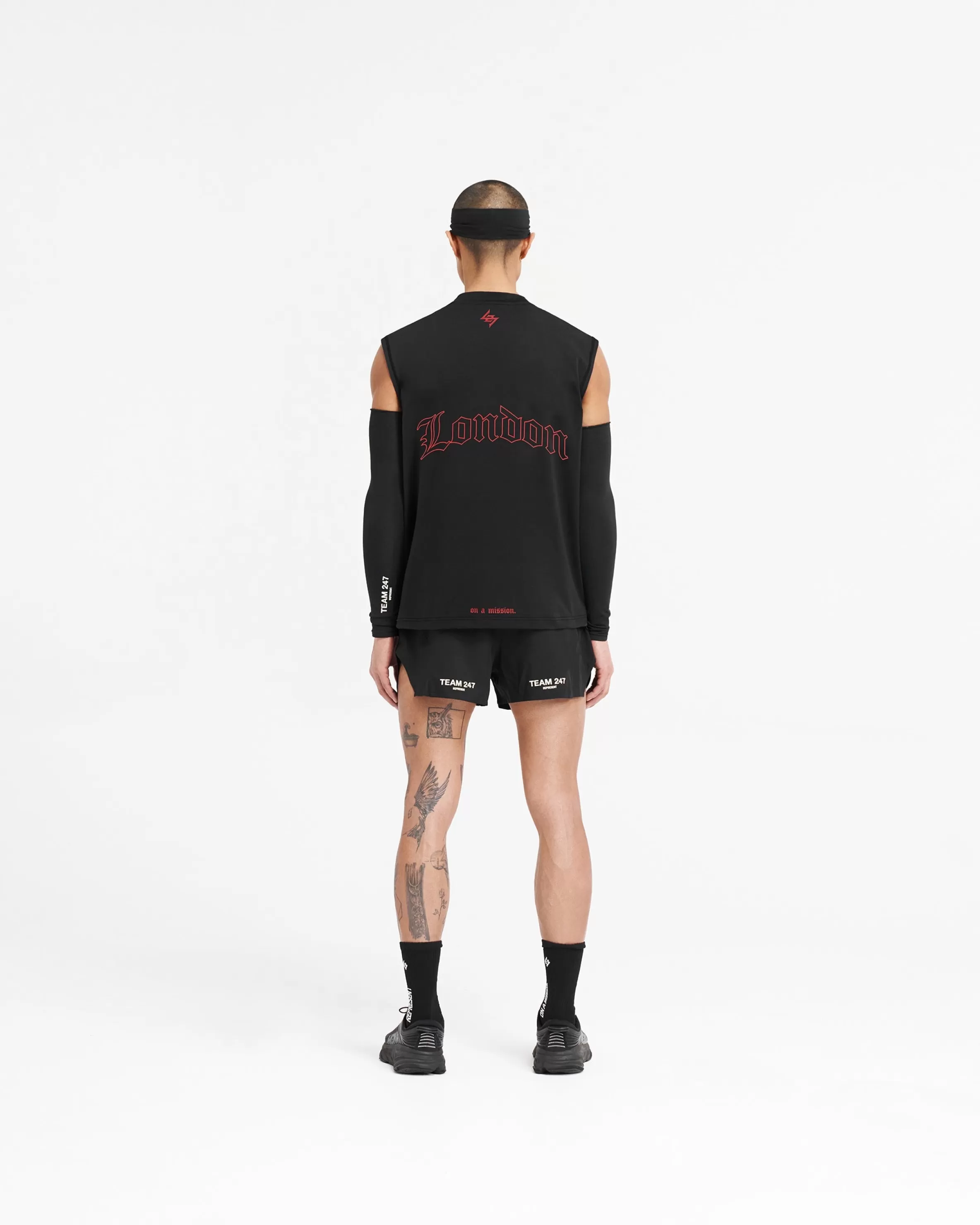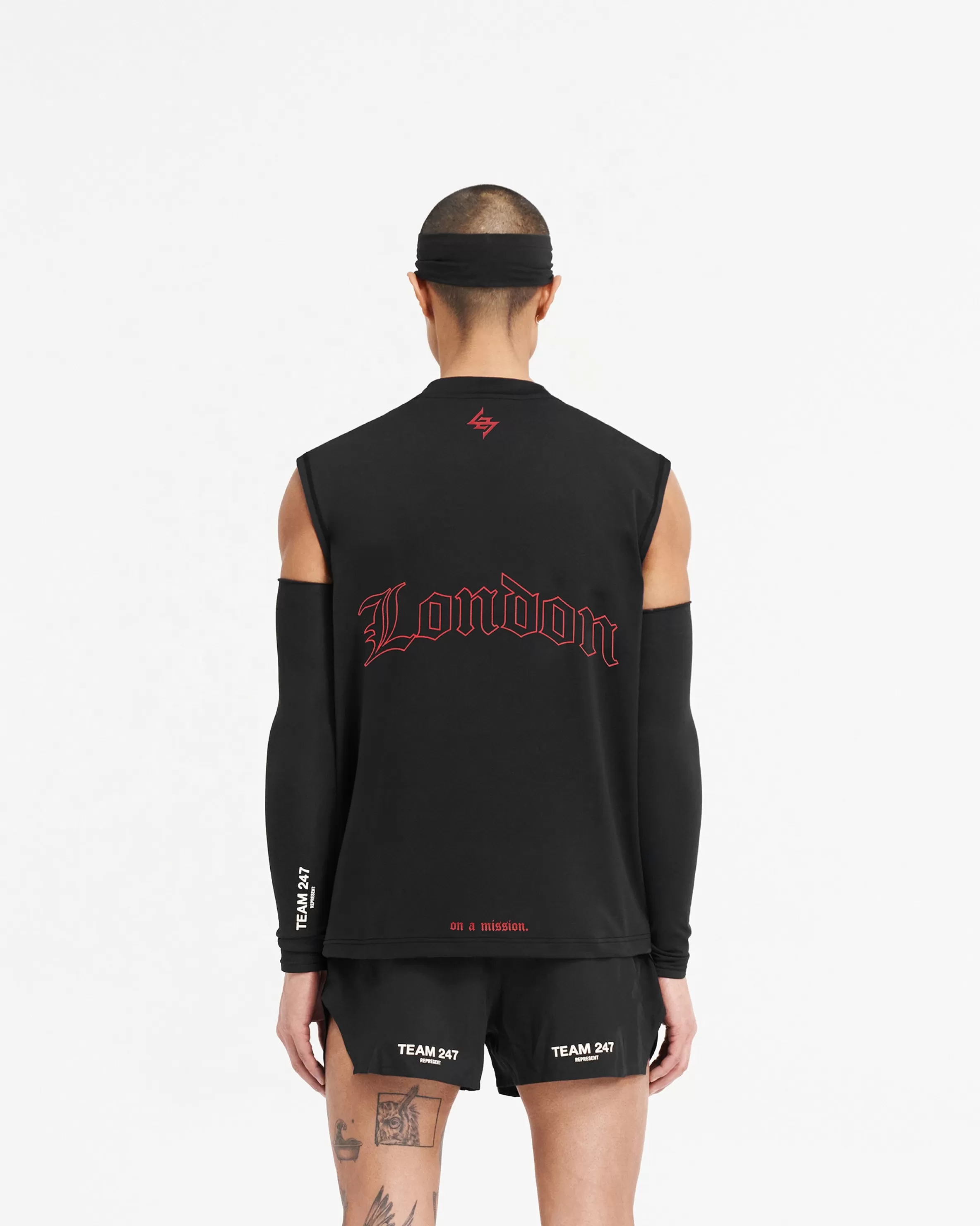 Introducing the 247 London Oversized Tank in Black. Featuring a quick dry, lightweight compact mesh construction and an oversized fit with 4-way stretch, this running tank top offers complete freedom of movement as you train or run. The breathable and cooling fabric works with your body’s thermo-regulation mechanisms to optimise your performance over time. Sweat wicking technology absorbs and evenly re-distributes moisture into the air as you run, helping maintain freshness till the second your workout ends. It also offers UV protection for safe coverage in every climate. The London Tank Top features our screen printed gothic Team 247 graphic to the front and London graphic to the back. It also carries our gothic 247 logo to the front and back neck, and is finished with our small LDN graphic to the chest and On a Mission motif to the back. Jet Black Running Tank Top Compact Mesh Fabric Oversized Fit Freshfeel Cooling Technology Lightweight u0026amp; Breathable UV Protection Moisture Wicking Quick Drying Self Fabric Collar Composition: 86% Polyester, 14% ElastaneModel is 187cm and 76kg wearing size MediumProduct