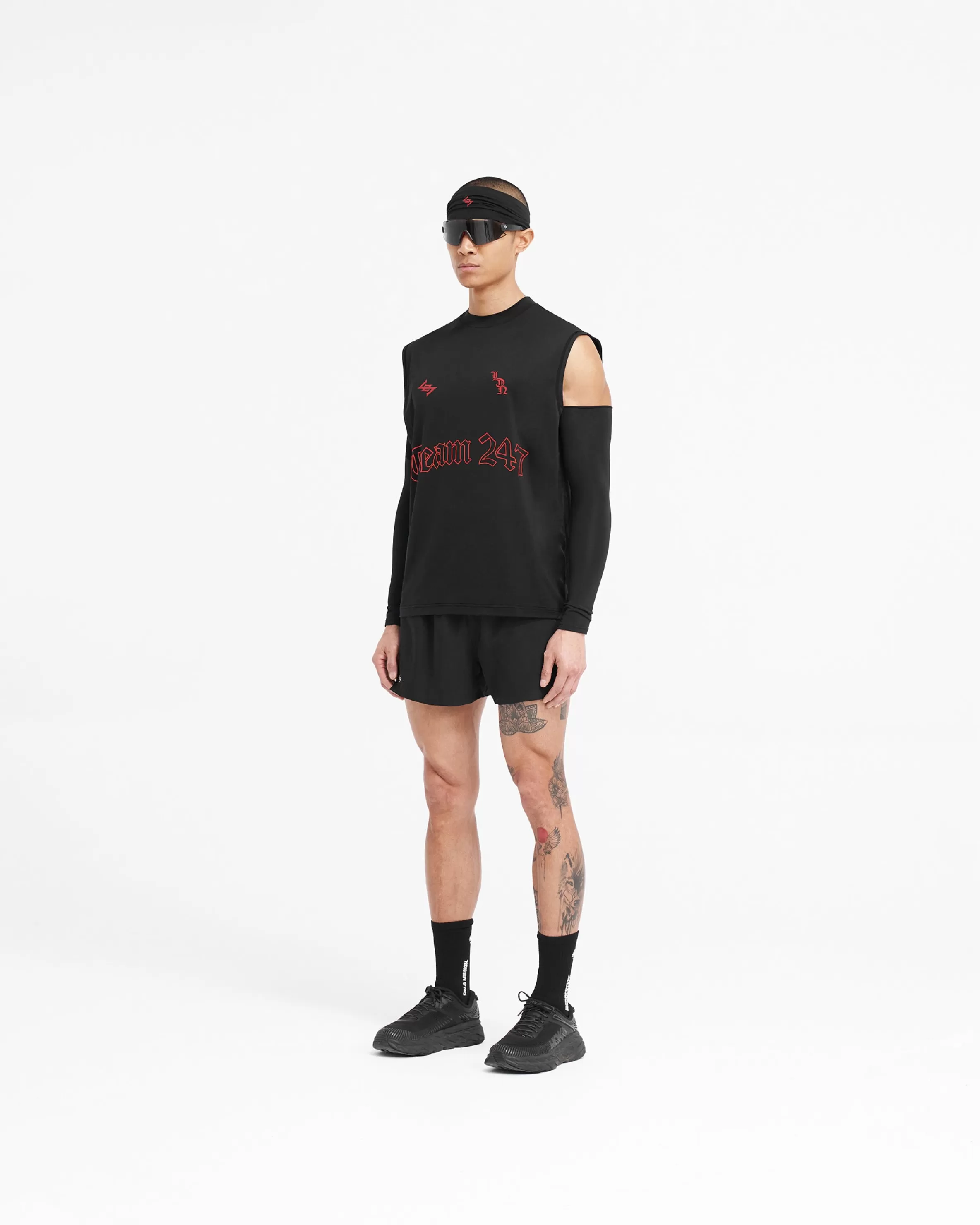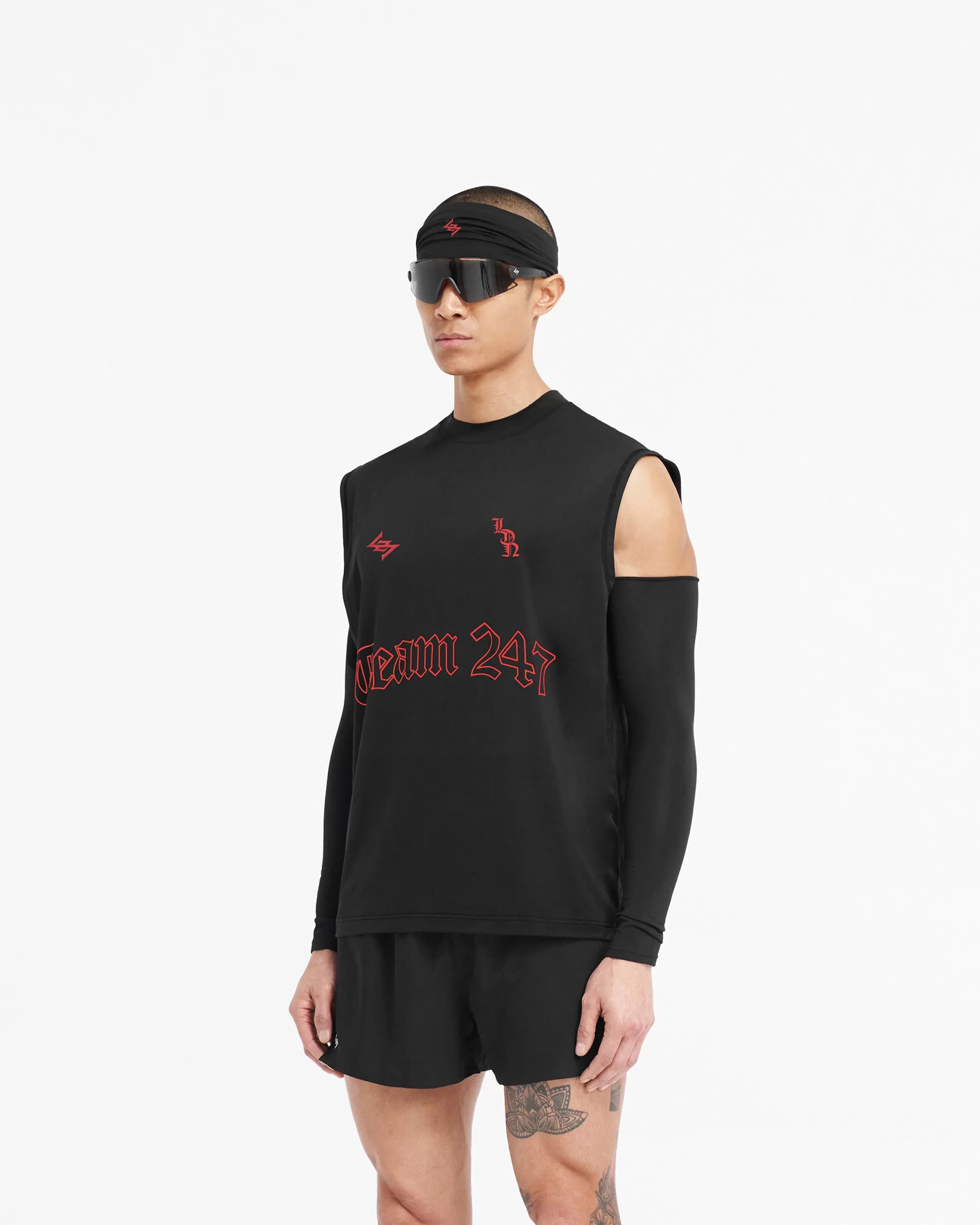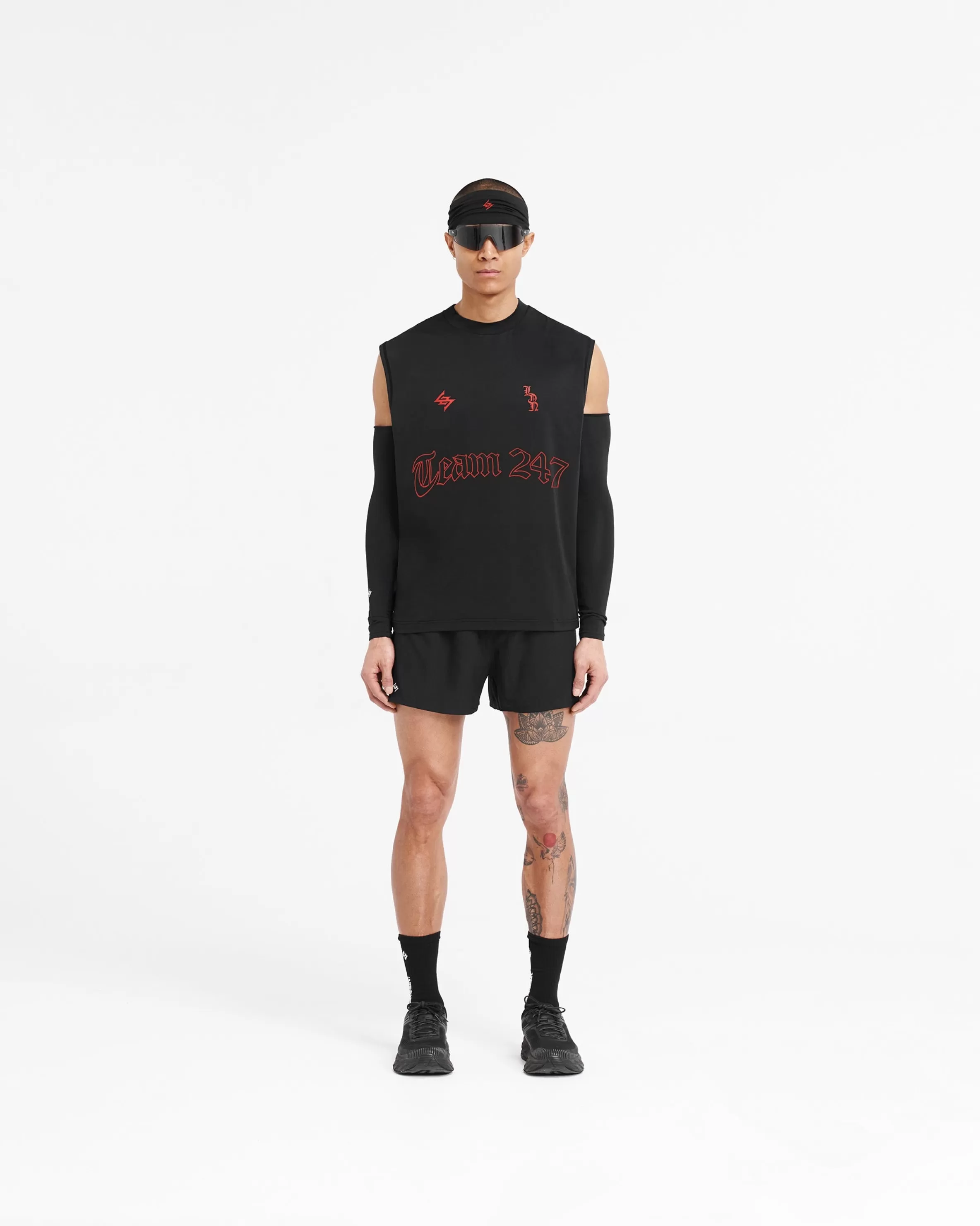 Introducing the 247 London Oversized Tank in Black. Featuring a quick dry, lightweight compact mesh construction and an oversized fit with 4-way stretch, this running tank top offers complete freedom of movement as you train or run. The breathable and cooling fabric works with your body’s thermo-regulation mechanisms to optimise your performance over time. Sweat wicking technology absorbs and evenly re-distributes moisture into the air as you run, helping maintain freshness till the second your workout ends. It also offers UV protection for safe coverage in every climate. The London Tank Top features our screen printed gothic Team 247 graphic to the front and London graphic to the back. It also carries our gothic 247 logo to the front and back neck, and is finished with our small LDN graphic to the chest and On a Mission motif to the back. Jet Black Running Tank Top Compact Mesh Fabric Oversized Fit Freshfeel Cooling Technology Lightweight u0026amp; Breathable UV Protection Moisture Wicking Quick Drying Self Fabric Collar Composition: 86% Polyester, 14% ElastaneModel is 187cm and 76kg wearing size MediumProduct