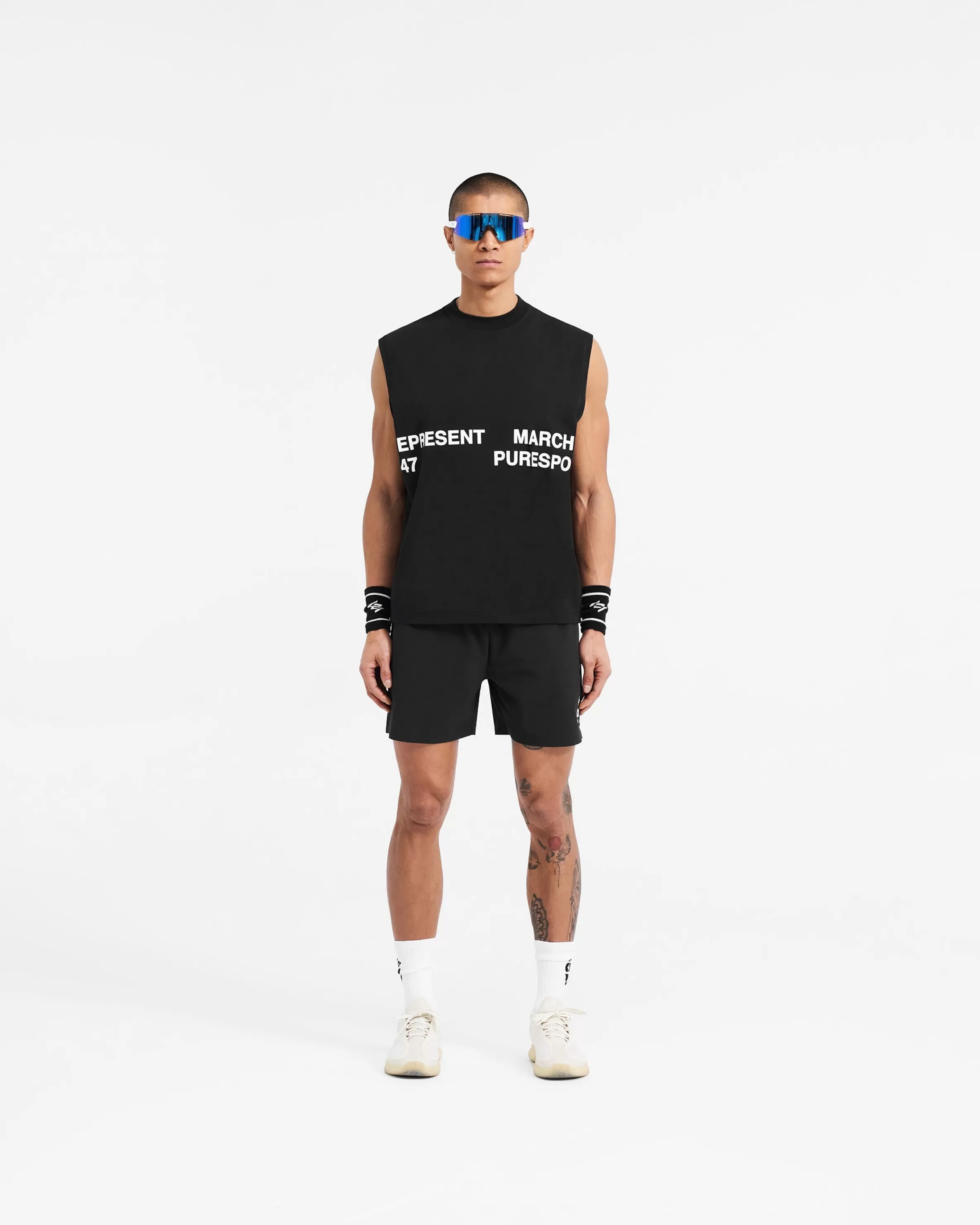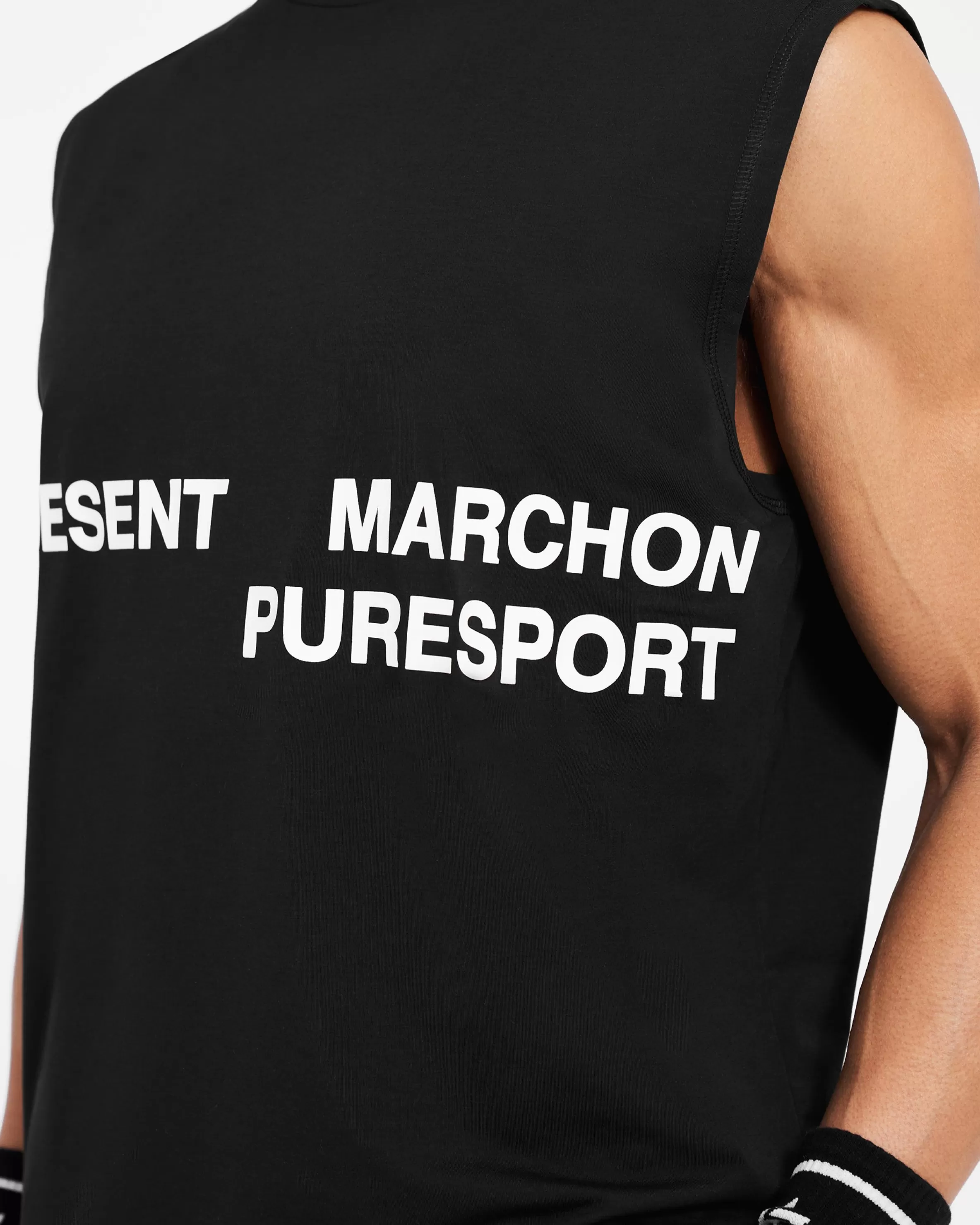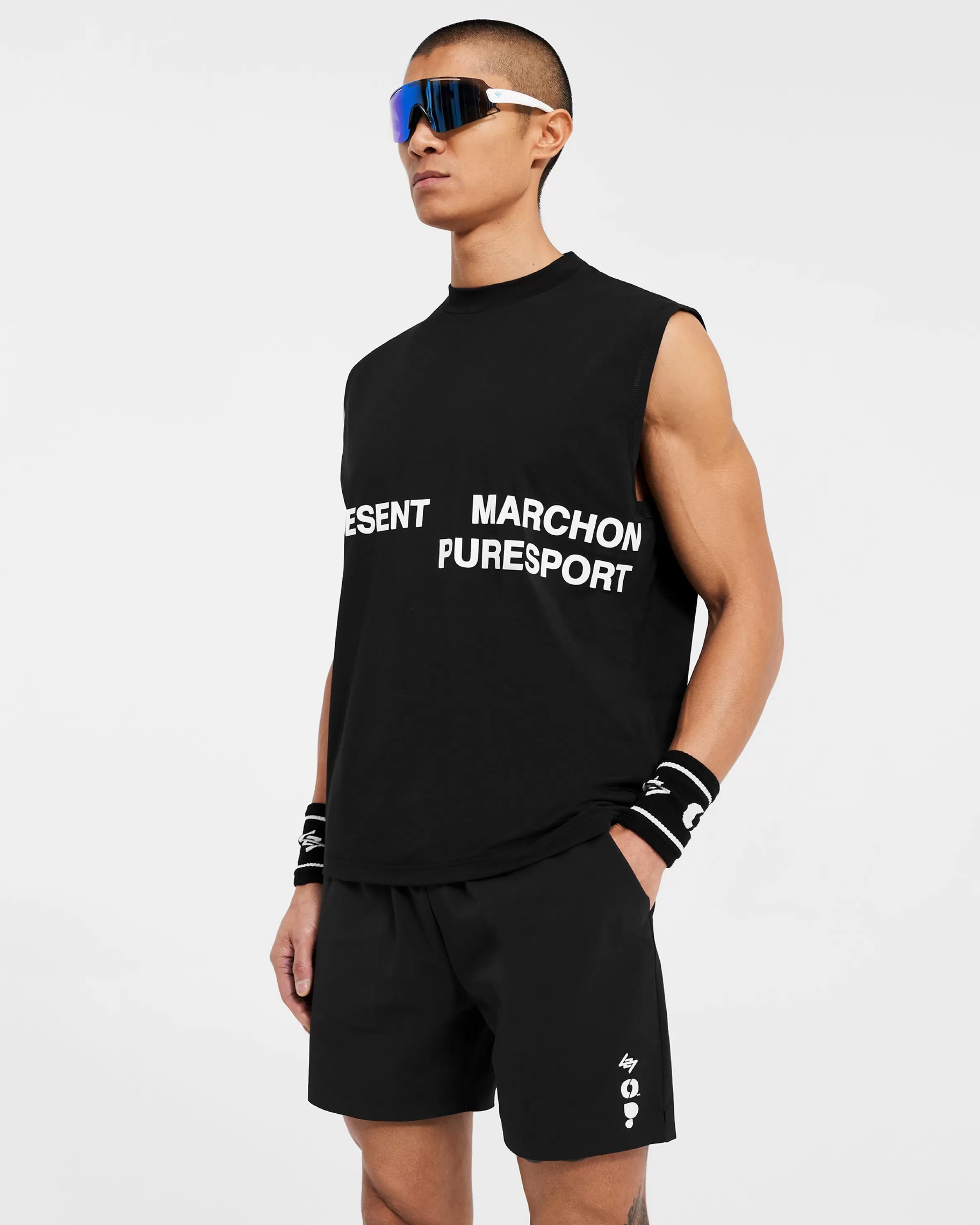 Introducing the 247 Marchon Puresport Tank in Black, designed in collaboration with Marchon, the UK’s leading functional training brand, and Puresport, the global leader in wellness nutrition and CBD products. The ultimate tank top for any of your training sessions, and crafted from a premium technical fabric blend with 4-way stretch, the tank accommodates complete freedom of movement, whilst the breathable nature of the fabric works alongside your body’s thermo-regulation mechanisms to help maintain your performance over time. It also has an antibacterial finish to the fabric for a box fresh feel with every wear. The tank is finished with the three brands’ names to the front and logos to the back neck. Finished with our ‘On a Mission’ motif to the back. Black Oversized Tank Top Lightweight u0026amp; Breathable 4-Way Stretch 247, Marchon u0026amp; Puresport Branding Composition: 82% Polyester, 11% Lyocell, 7% ElastaneProduct