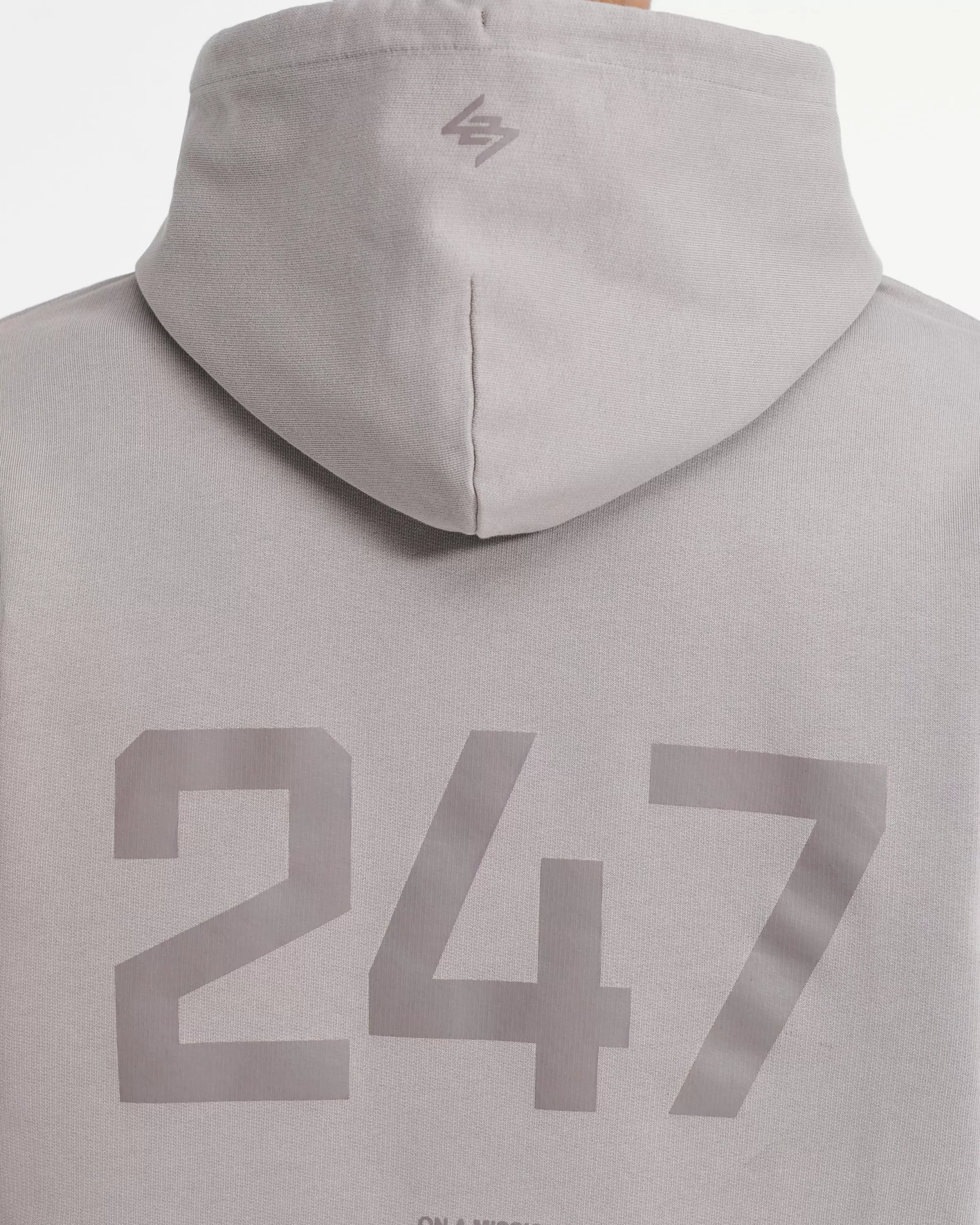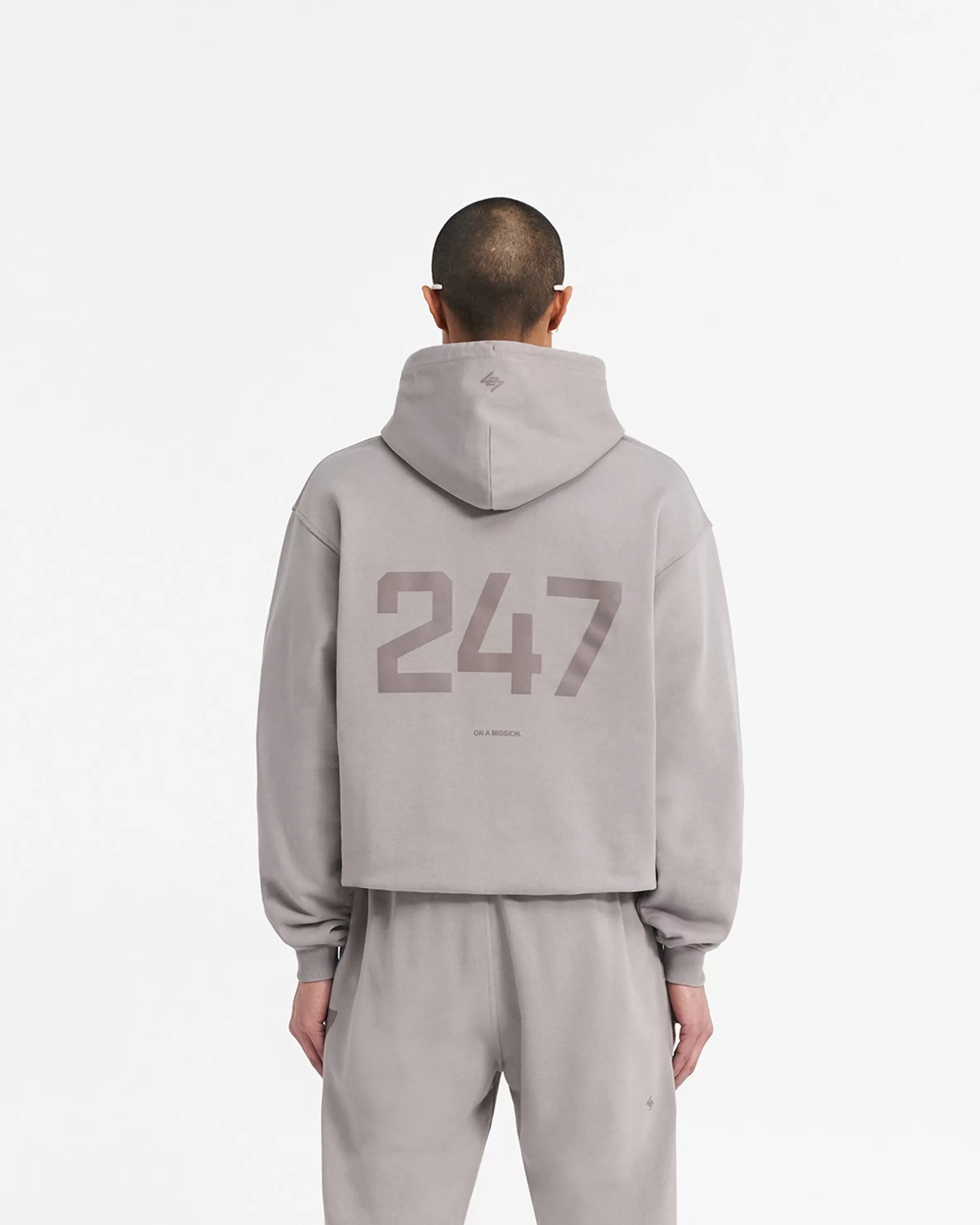 The Team 247 Oversized Hoodie in Cinder is the ultimate warm up layer for outdoor workouts, on the way to the gym, or whilst priming your body to train. With an oversized fit as well as a ribbed hem and cuffs, the hoodie provides unparalleled comfort, whatever the endeavour. This hoodie features our tonal 247 Number Branding and On A Mission to the back, 247 logo to the front and hood, and tonal drawcords to the hood for an adjustable fit. Cinder Training Hoodie Oversized Fit Ribbed Cuffs u0026amp; Hem Internal Drawstring to Hood 247 Number Branding 247 Logos Model is 187cm and 76kg wearing size Medium Composition: 100% CottonProduct