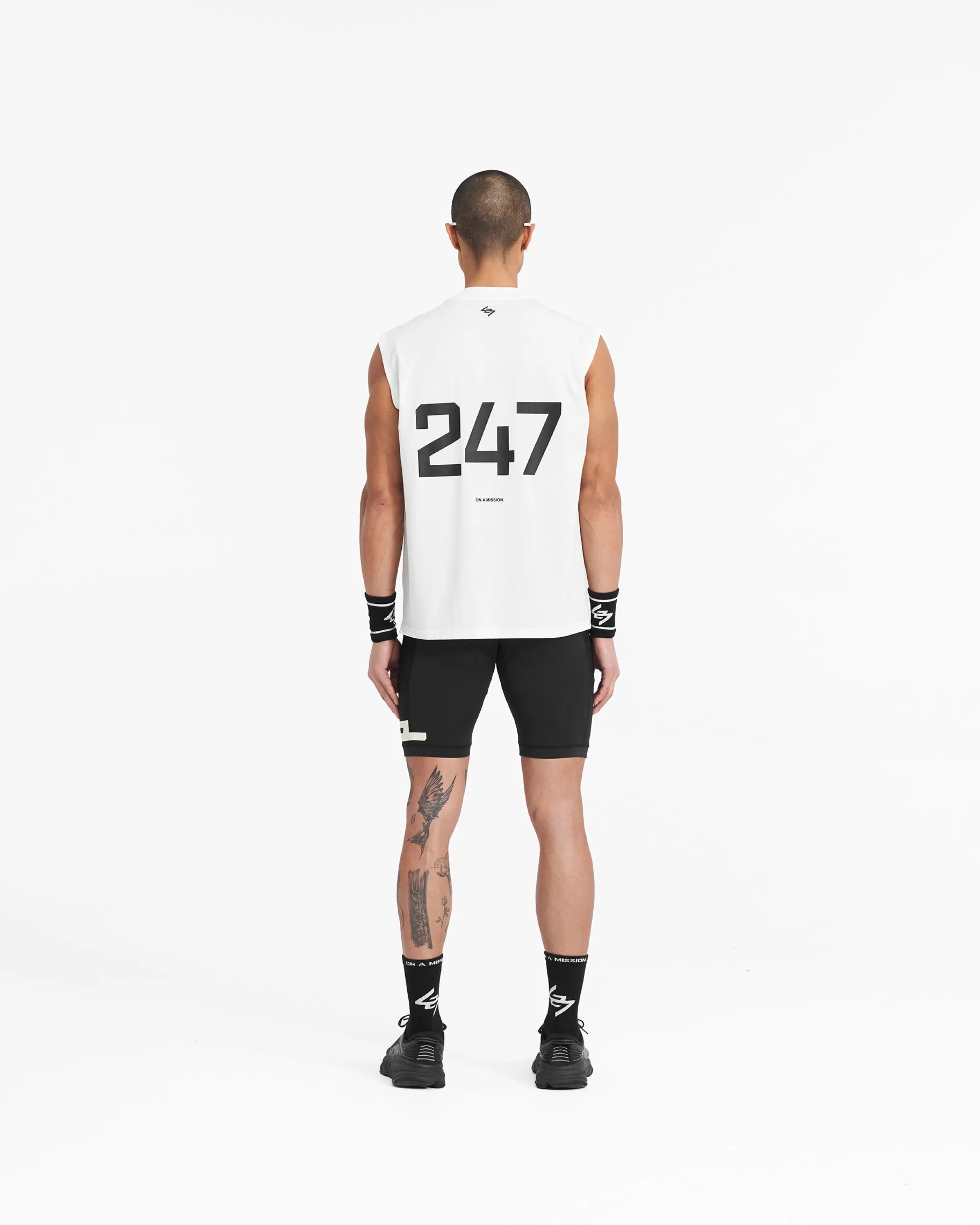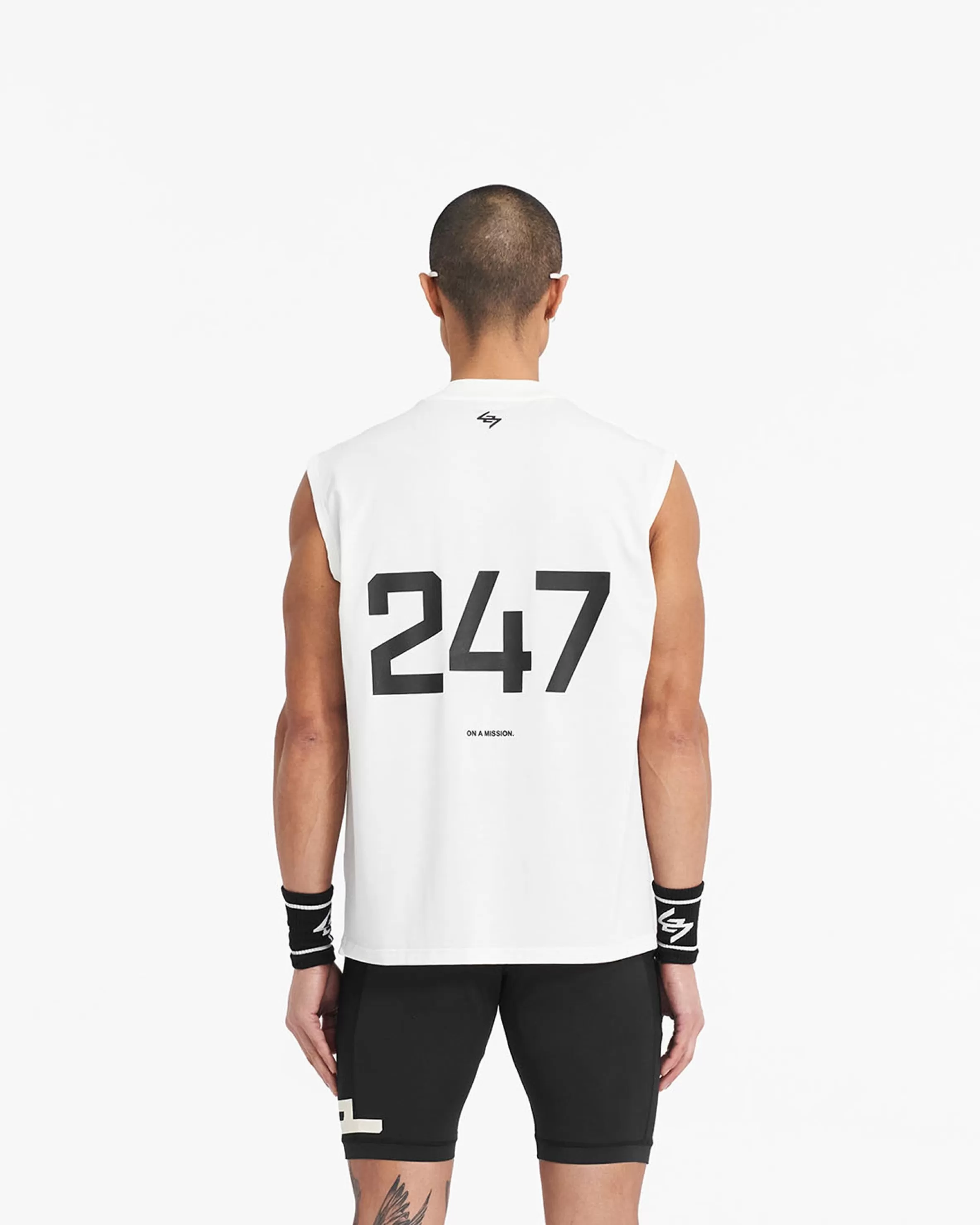The 247 Oversized Tank in Flat White is the ultimate tank top for any of your training sessions. Crafted from a premium technical fabric blend with 4-way stretch, the tank accommodates complete freedom of movement, whilst the breathable nature of the fabric works alongside your body’s thermo-regulation mechanisms to help maintain your performance over time. It also has an antibacterial finish to the fabric for a box fresh feel with every wear. The tank is finished with our 247 Number Branding u0026amp; On a Mission to the back, and 247 Logo to the front. This piece is considered an easy care fabric, meaning that it resists pilling, wrinkling and static cling. It is suitable for everyday use or high intensity workouts. It also dries 4x faster than cotton. Flat White Oversized Tank Top Drirelease_® _Fabric Lightweight u0026amp; Breathable 4-Way Stretch 247 Number Branding 247 Logo Quick Drying u0026amp; Antibacterial Moisture Wicking Model is 187cm and 76kg wearing size Medium Composition: 82% Polyester, 11% Lyocell, 7% ElastaneProduct