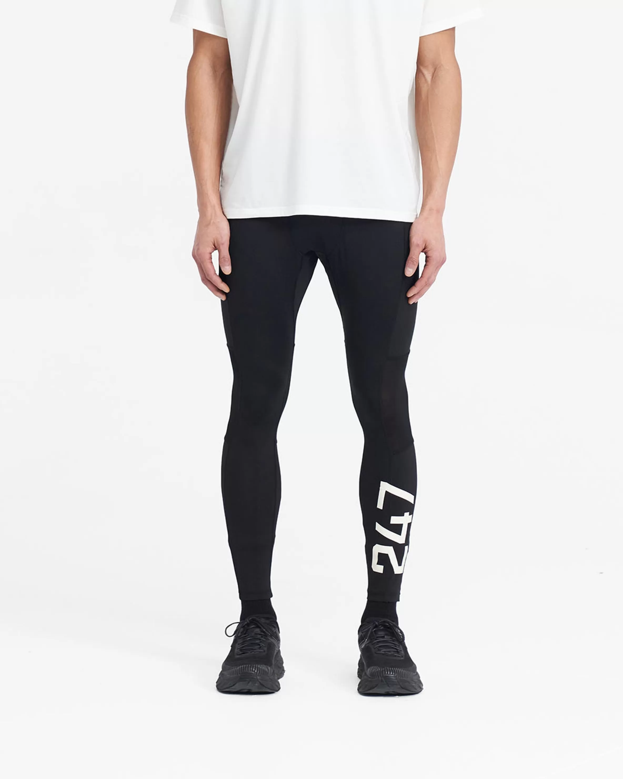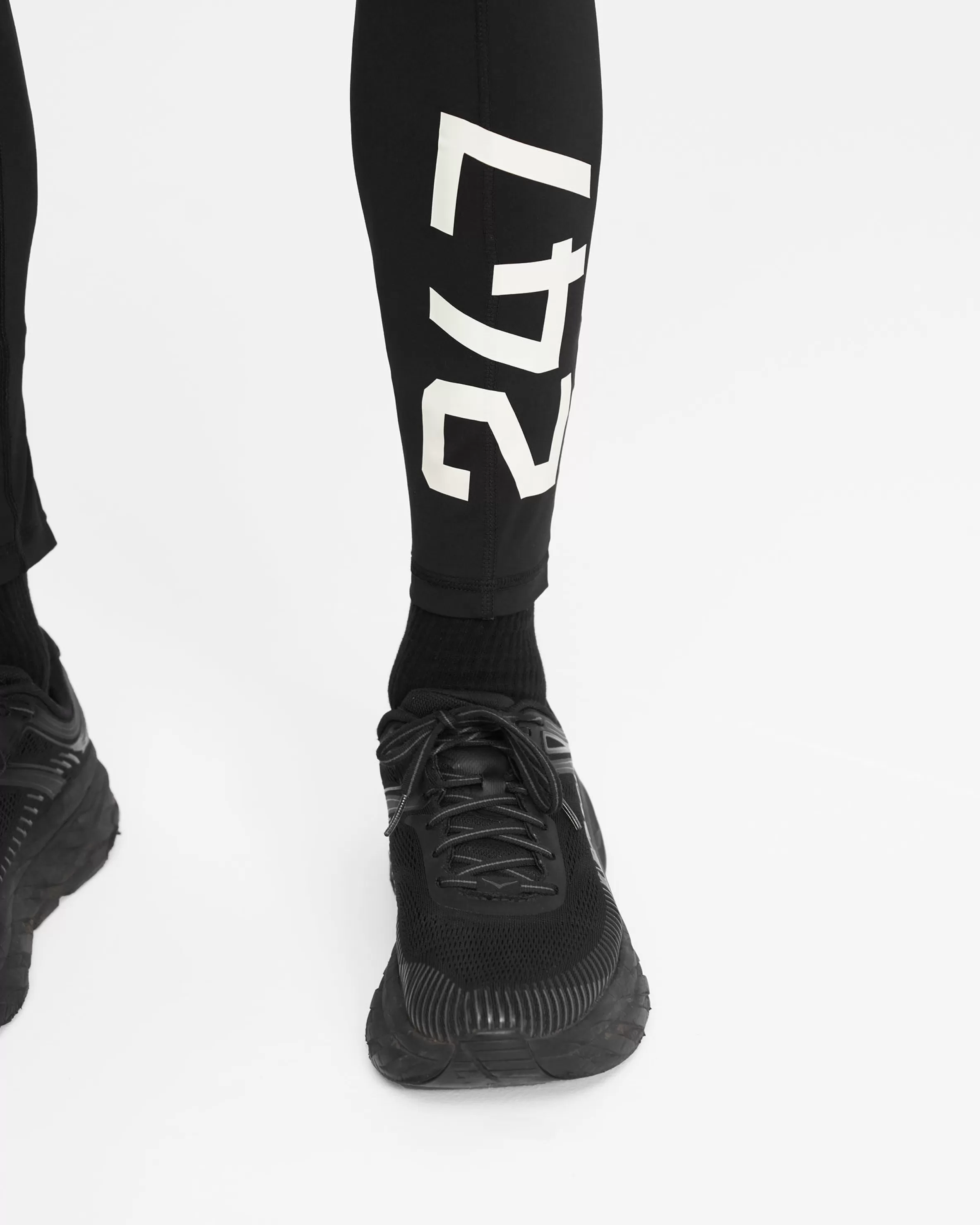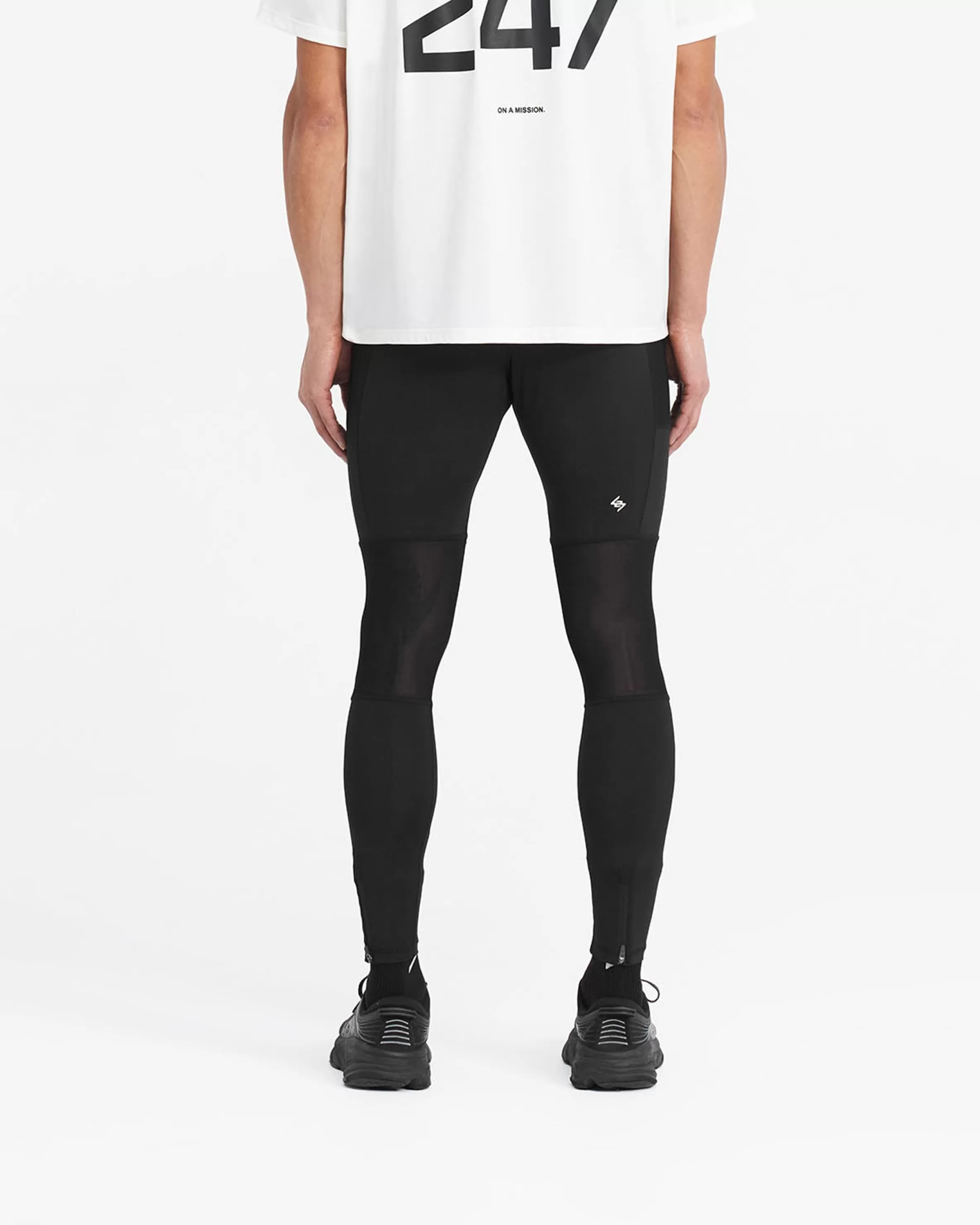 Introducing the 247 Run Tight in Jet Black, the ultimate legwear garment to optimise your performance as you run. The 247 Run Tights feature side stretch ripstop panelling with a perforated finish, a lightweight and breathable fabric incorporated for enhanced durability, breathability and protection against abrasion. They have mesh panelling to the back of the knees for improved thermoregulation and branded, auto-lockable zip openings to the ankle hems. A flatlock construction to the seams ensures complete comfort throughout every movement. The tights also have a single zip pocket to the back for securing valuables, an open pocket with lobster clip for attaching keys to the side and a branded elasticated waistband with the option of an internal/external drawcord for a custom fit. They are finished with our 247 number branding to the bottom leg. We recommend wearing these tights either on their own or under unlined shorts. Jet Black Running Tights Ripstop Panelling Mesh Panels to Knees 247 Branded Waistband with Drawstring Zip Opening to Hems Zip Pocket u0026amp; Open Pocket 247 Number Branding Model is 187cm and 76kg wearing size Medium CompositionMain Body: 85% Polyester, 15% NylonPanelling: 80% Nylon, 20% ElastaneMesh Pocket: 72% Nylon, 28% ElastaneProduct