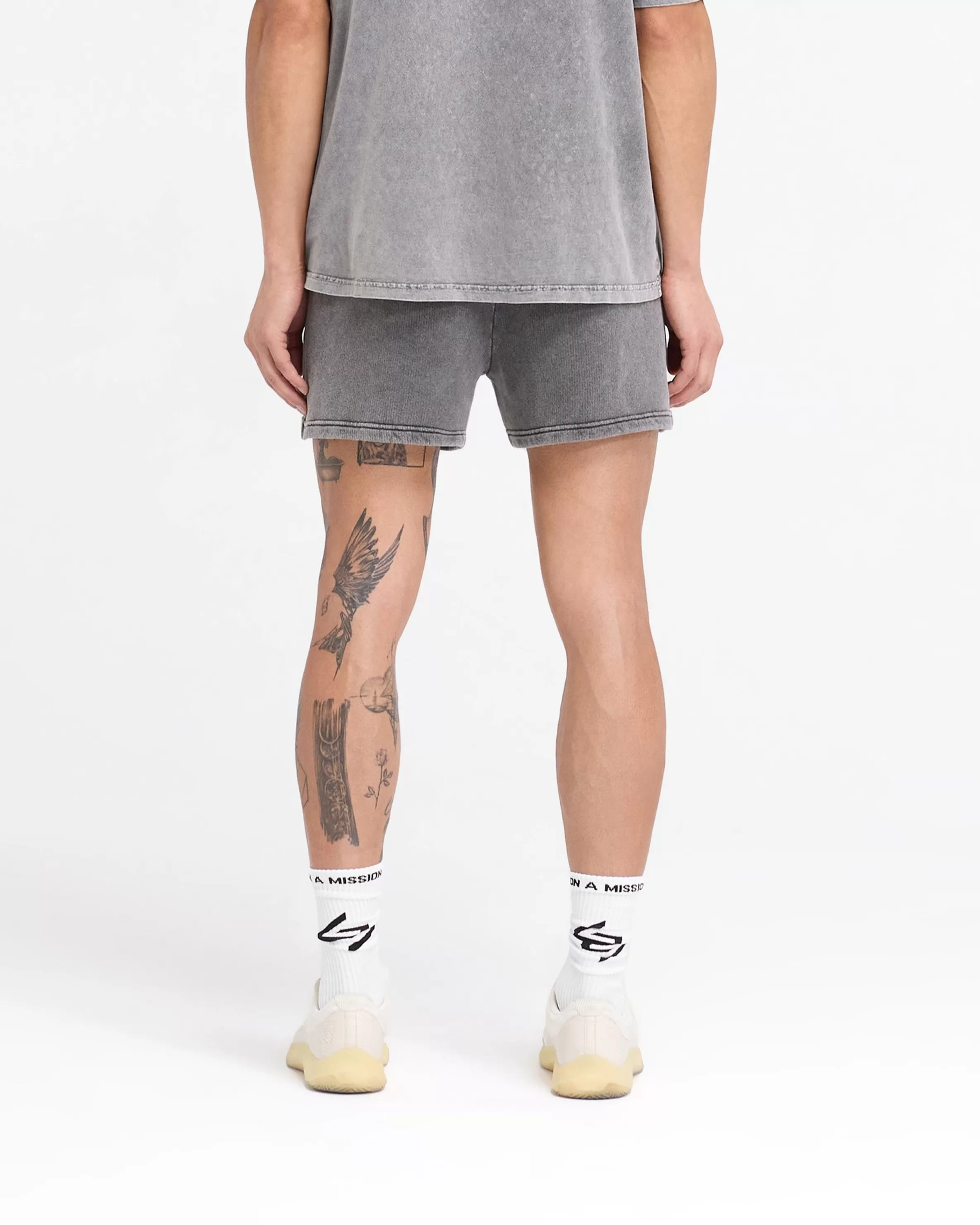Introducing the 247 Vs The world Jersey Shorts in Pewter, a fleece back cotton short style with a super boxy fit with short inseam. The shorts have a heavy pigment wash, with an elasticated waistband and internal drawcord for comfort, side seam pockets, and our cracked ink 247 Vs The World graphic to the front of the leg. 247 Vs The World Jersey Shorts Pigment Washed Pewter Grey Very Boxy Fit with Short Inseam Elasticated Waistband u0026amp; Internal Drawcord 247 Vs The World Cracked Graphic Note: Due to the washing technique of this garment, each piece produced will be unique in colour u0026amp; wash. Note: Due to the cracked graphic design, there may be some loss in print with time, wear and washing Composition: 100% Cotton420gsm Model is 187cm and 76kg wearing size MProduct