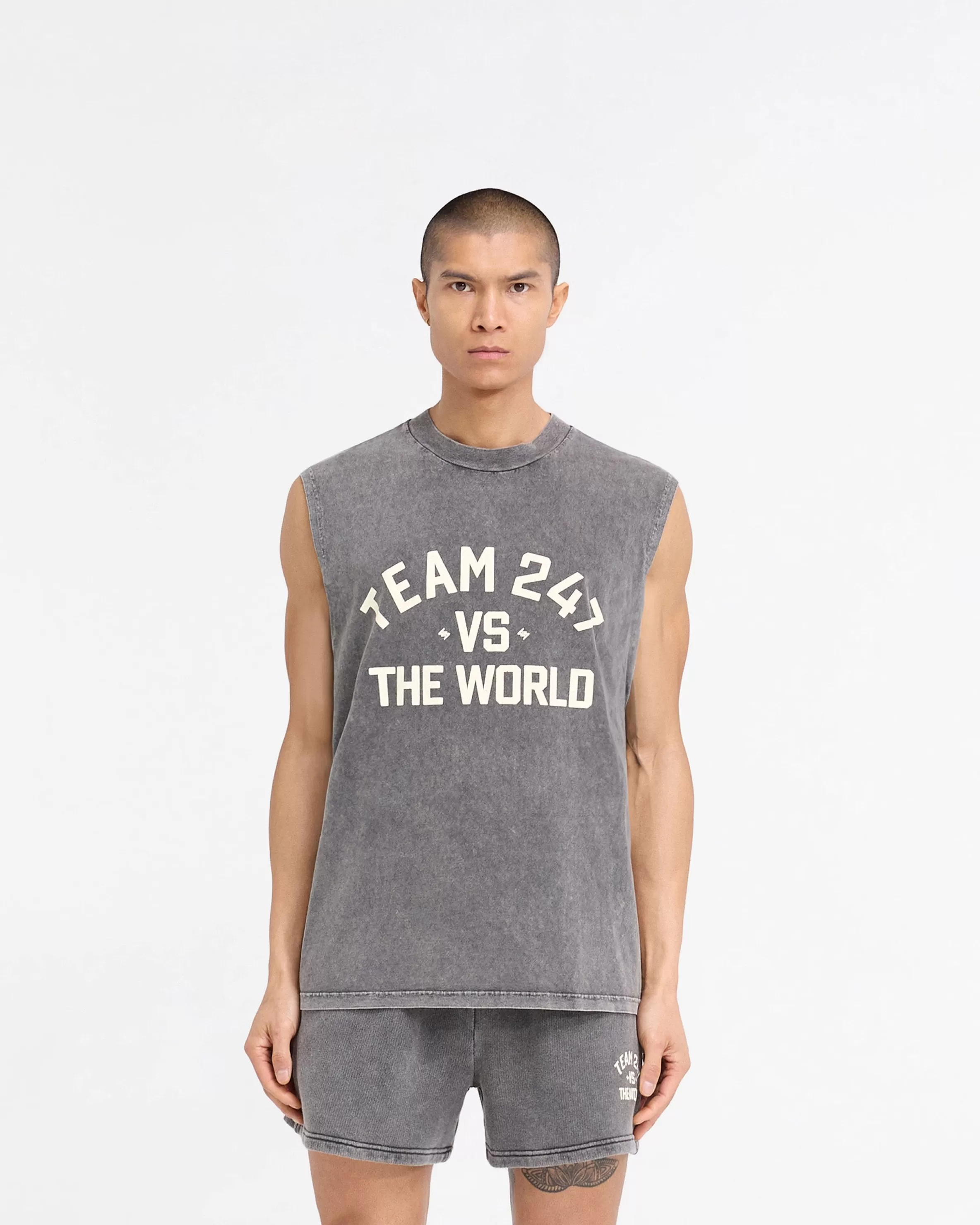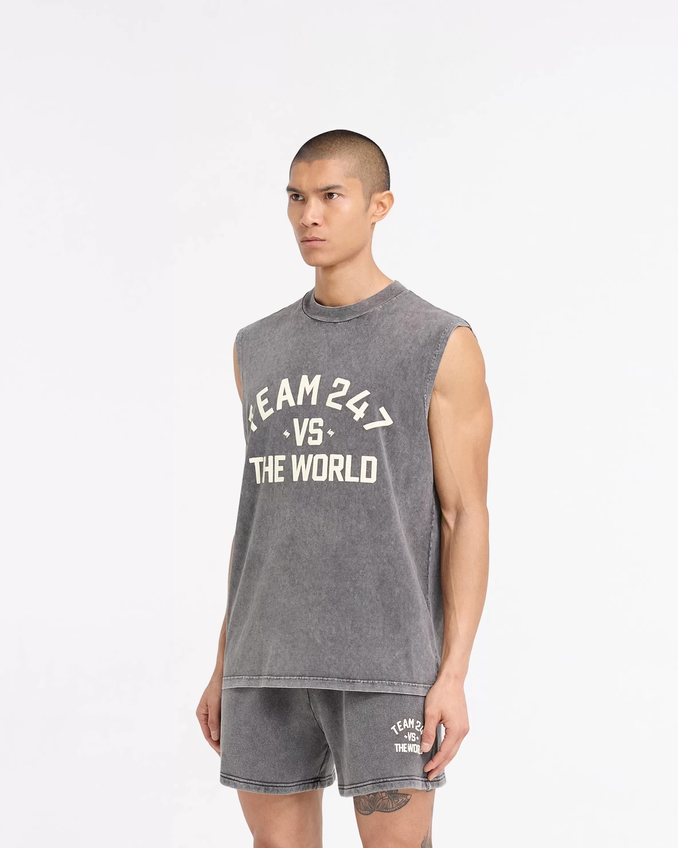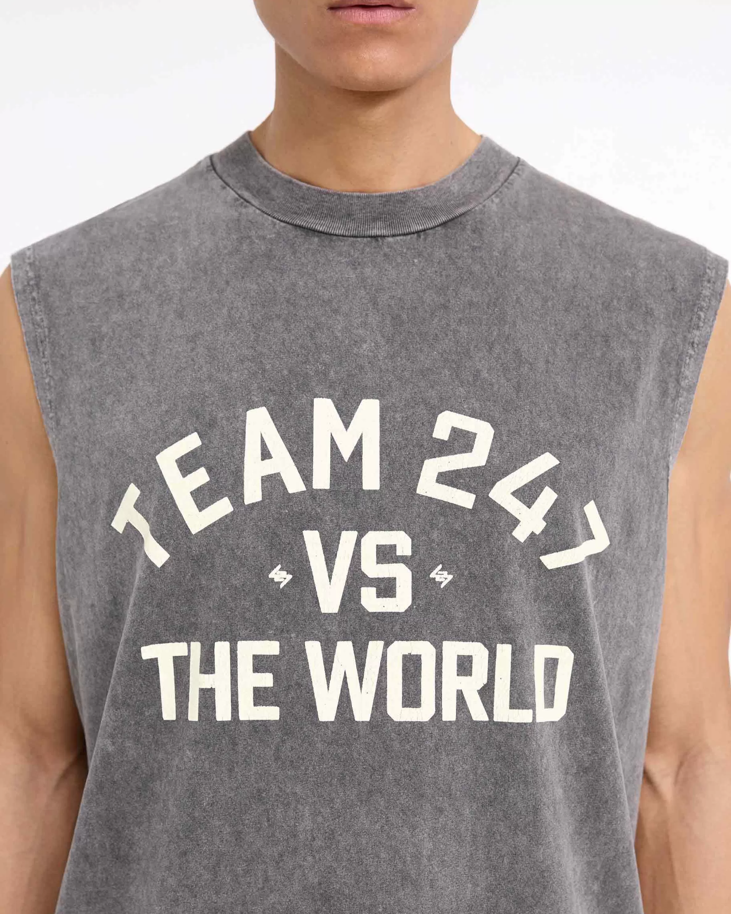 Introducing the 247 Vs The World Tank in Pewter, crafted from a super soft hand feel jersey cotton, with a heavy pigment…