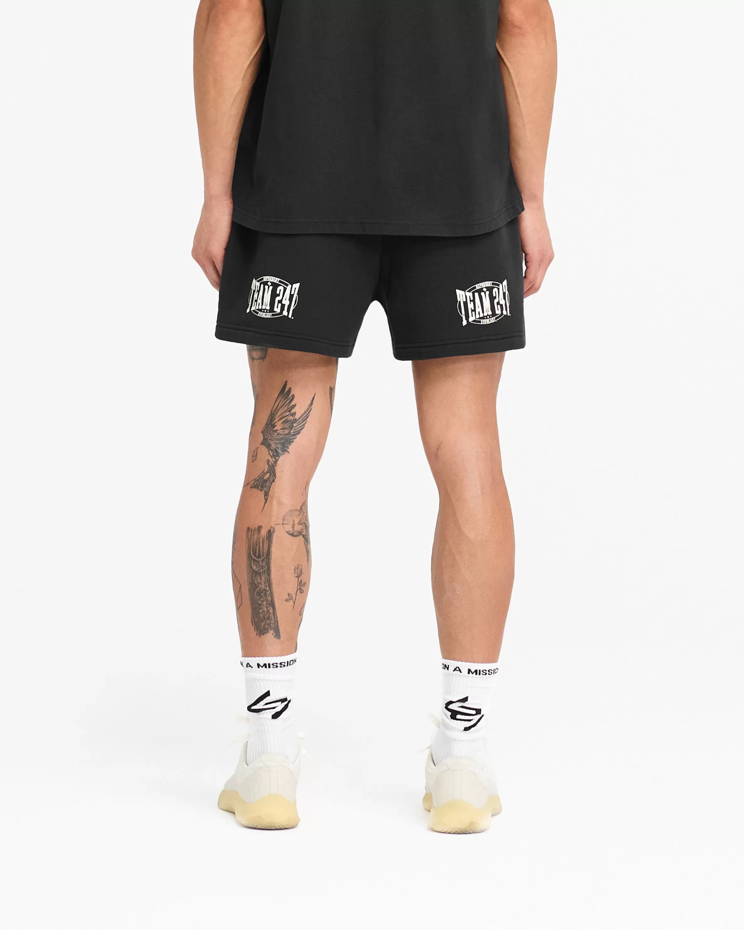 Introducing the 247 Training Camp Jersey Shorts in Off Black, created in collaboration with Everlast; a fleece back cotton short style with a super boxy fit with short inseam. The shorts have an elasticated waistband and internal drawcord for comfort, side seam pockets, and our cracked Team 247 x Everlast graphic to the back and 247 u0026amp; Everlast logos to the front. 247 Training Camp Jersey Shorts Off Black Very Boxy Fit with Short Inseam Elasticated Waistband u0026amp; Internal Drawcord Cracked 247 x Everlast Graphics Note: Due to the cracked graphic design, there may be some loss in print with time, wear and washing Composition: 100% Cotton420gsm Model is 187cm and 76kg wearing size MProduct