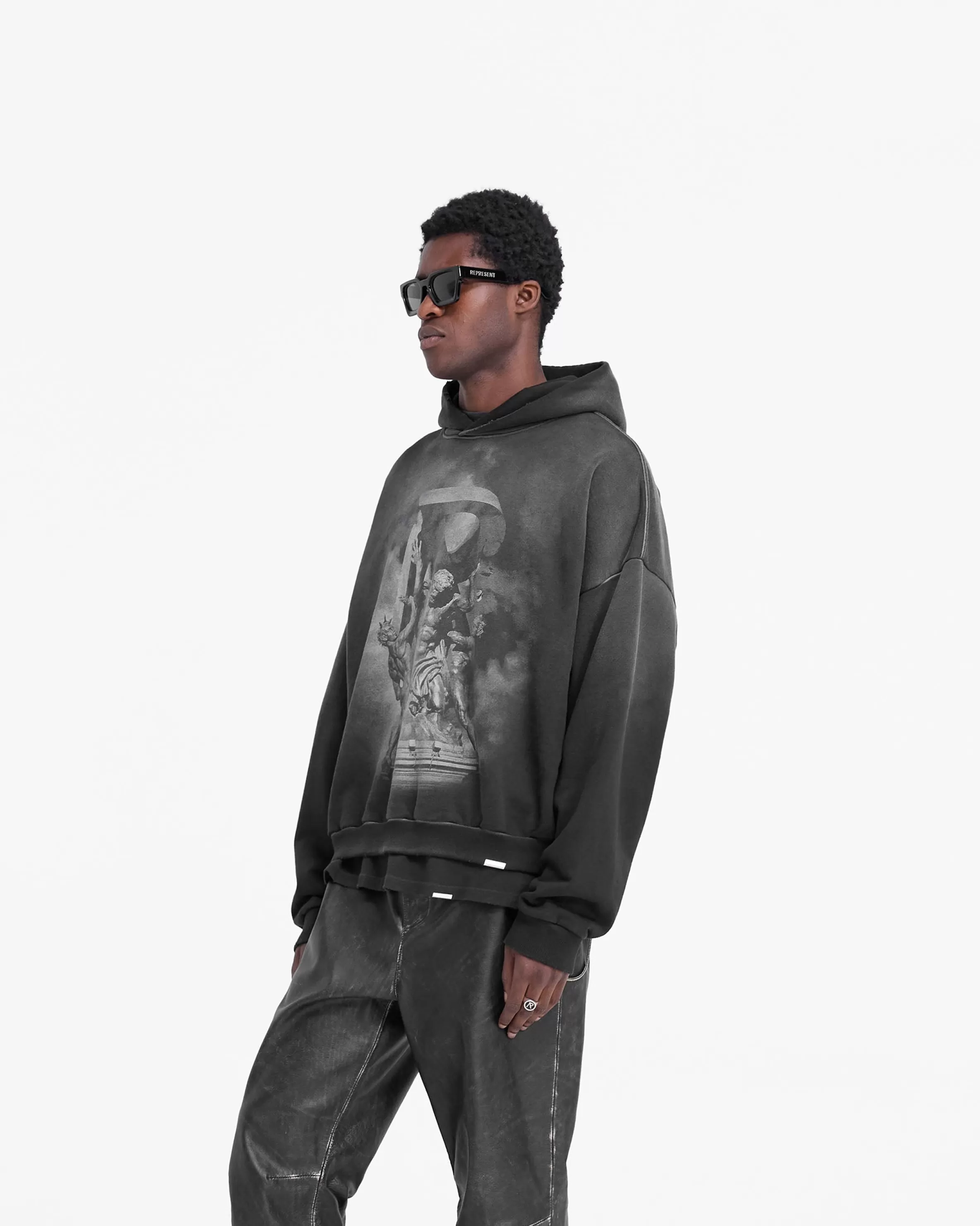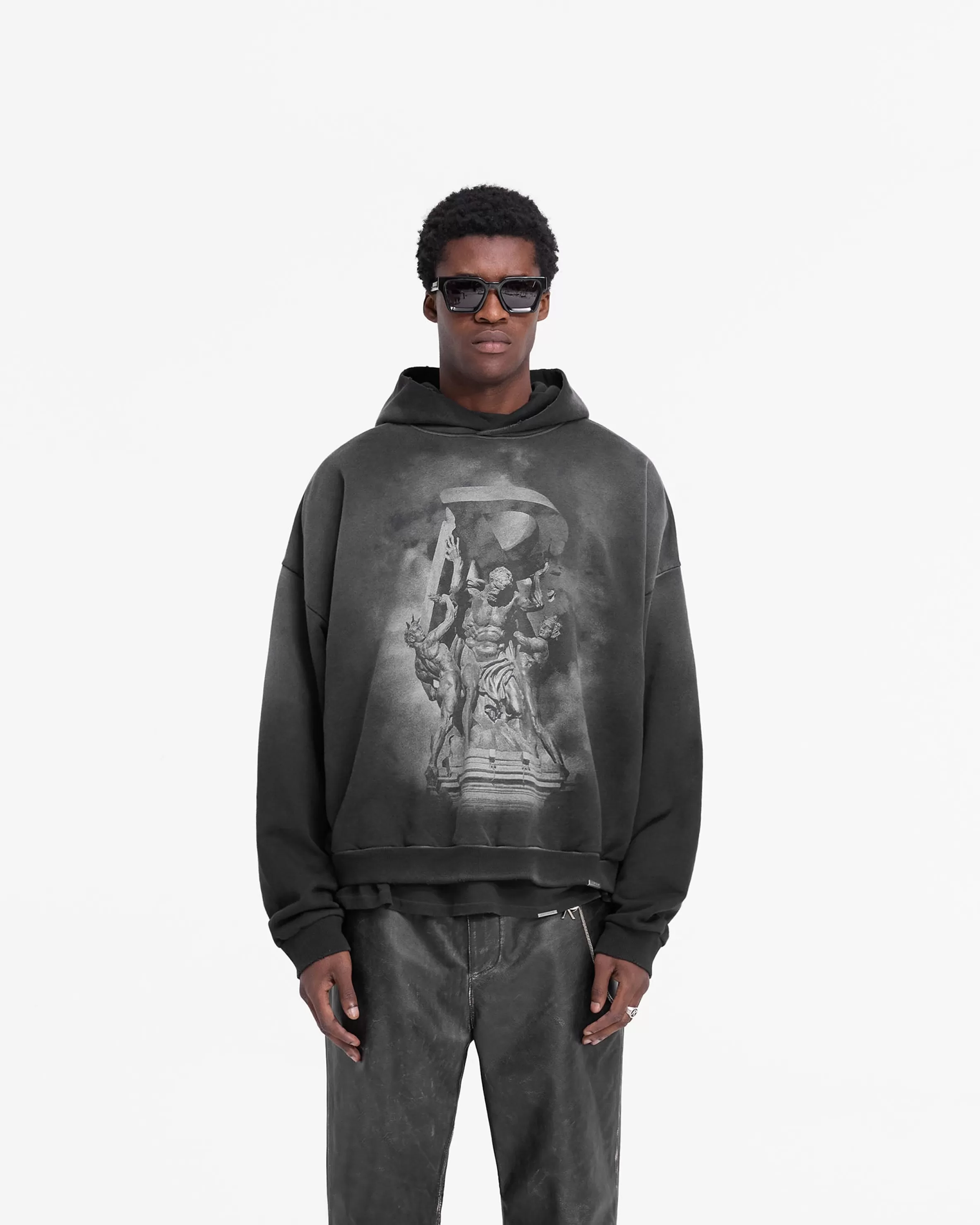 Introducing the Atlas Hoodie in Stained Black, an oversized body hoodie crafted from heavy weight jersey cotton with a fade out wash. The hoodie features a mix of puff print and screen print to the back, with our screen printed Atlas graphic to the front. It is finished with vintage stitching and nibbling details to the hood and hem, with a Represent metal bar logo to the hem. Stained Black Hoodie Oversized Boxy Fit Fade Out Wash Puff Print u0026amp; Screen Print Graphics Nibbling Details u0026amp; Vintage Stitching Metal Bar Logo Composition: Shell: 100% CottonRib: 95% Cotton, 5% Elastane Product Care: Mild wash inside out at 30 degrees celsius. Hang dry in shade. Do not bleach, dry clean, or tumble dry. Cool iron on reverse. Due to the nature of this dye, this will naturally fade with cleaning and water exposure Model is 188cm and 75kg wearing size MProduct
