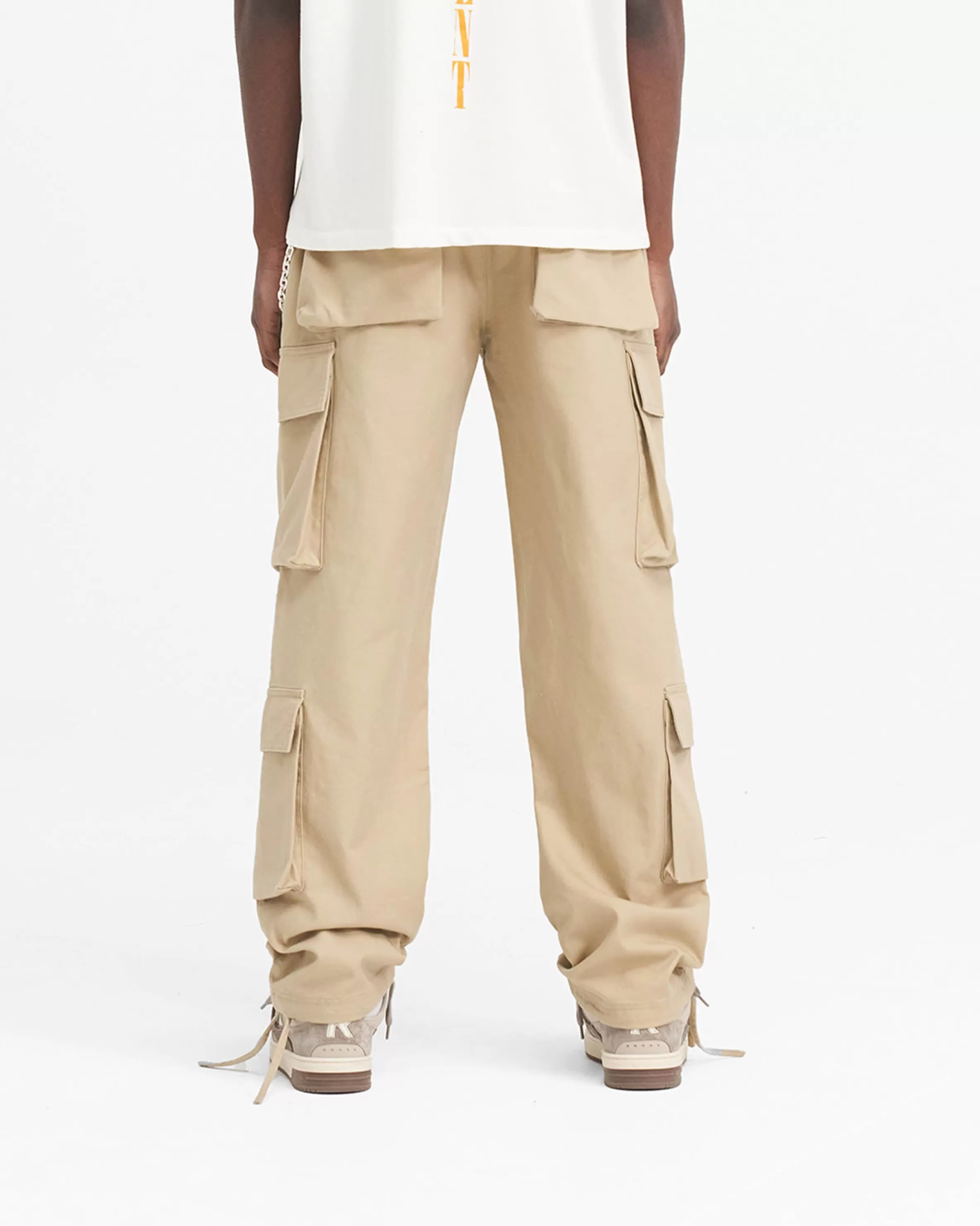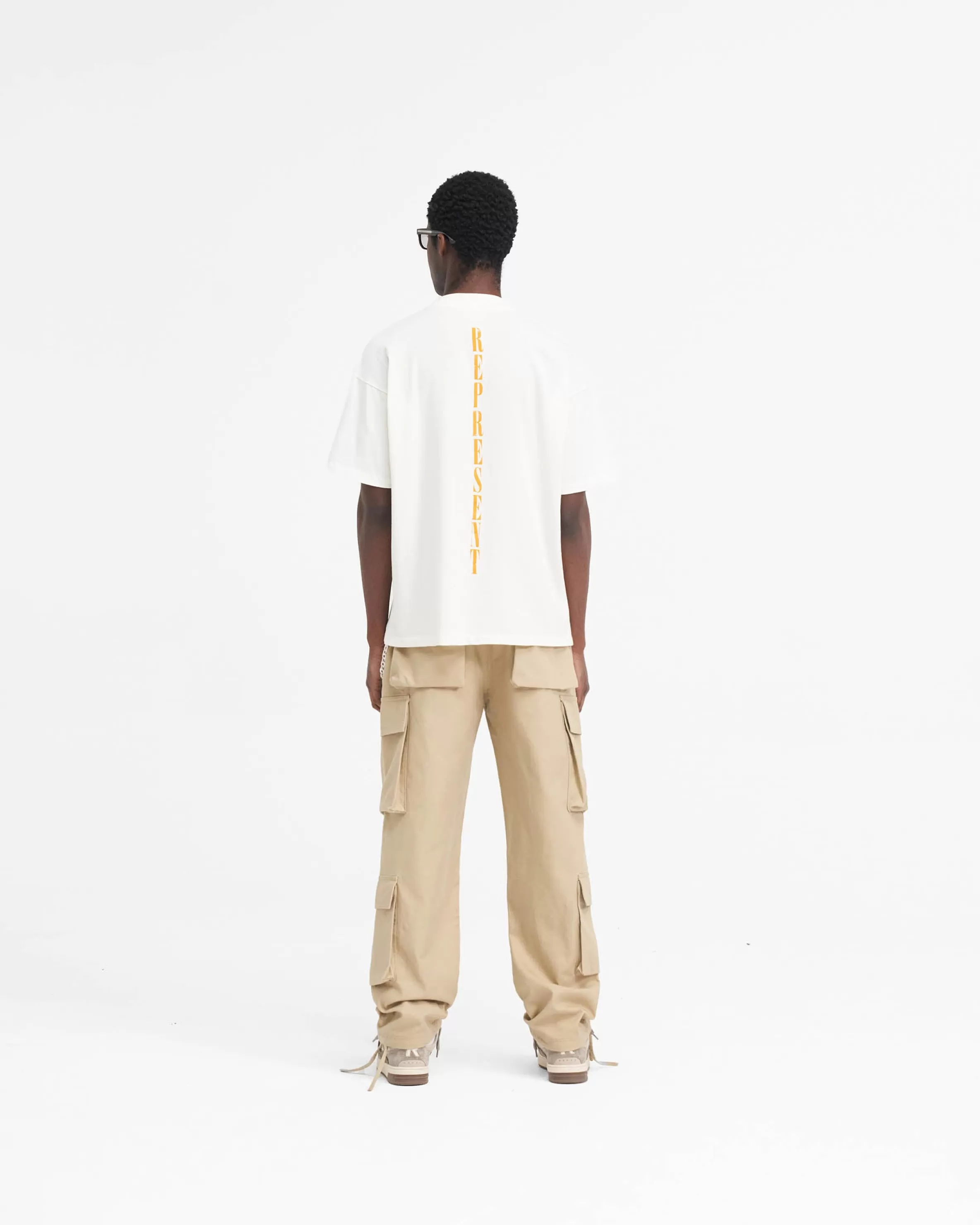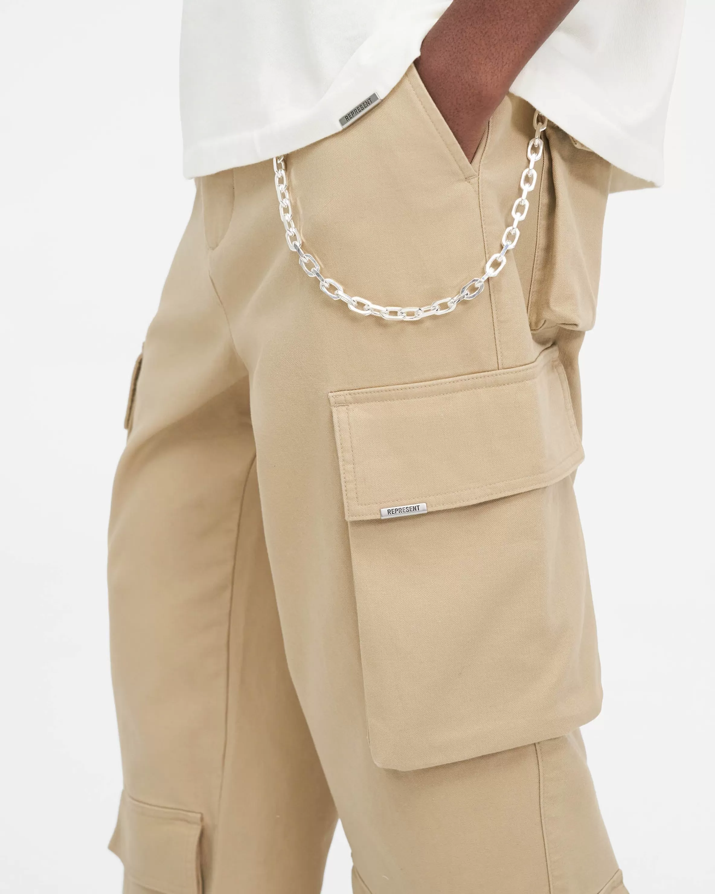 This item purchased in the Black Friday Sale is final sale and cannot be returned or exchanged. Introducing the Baggy Cargo Pant in Sandstone, a luxury cargo pant style crafted with a super soft hand feel. These cargos feature a cut and sew v yoke to the back, with oversized 3D pockets throughout. They have a similar baggy fit to our bestselling utility pant, with the addition of an antique silver branded belt loop bar and Represent metal bar to the cargo pocket. Sandstone Cargo Pants Baggy Fit 3D Oversized Pockets Antique Silver Metal Hardware Composition: 100% Cotton Product