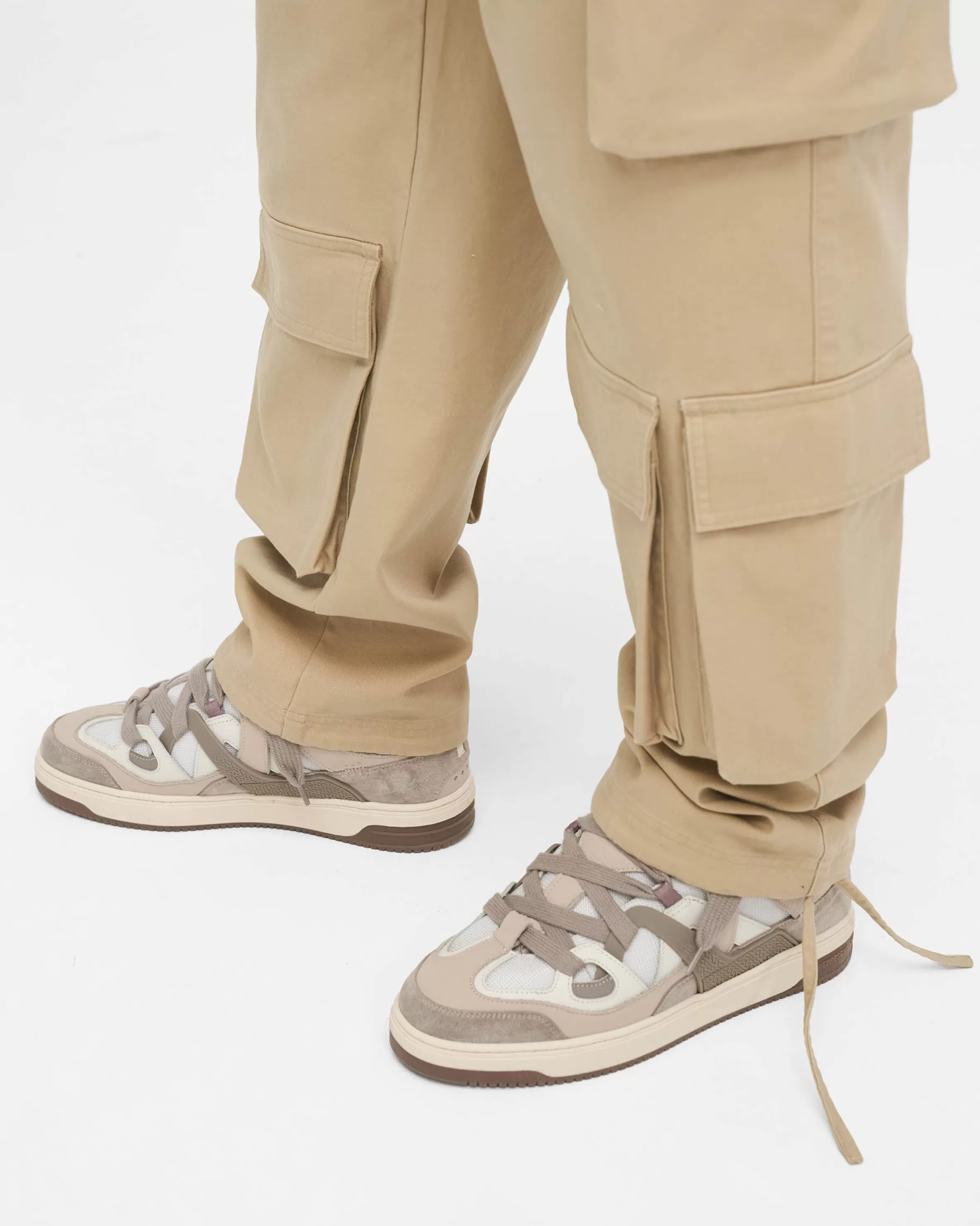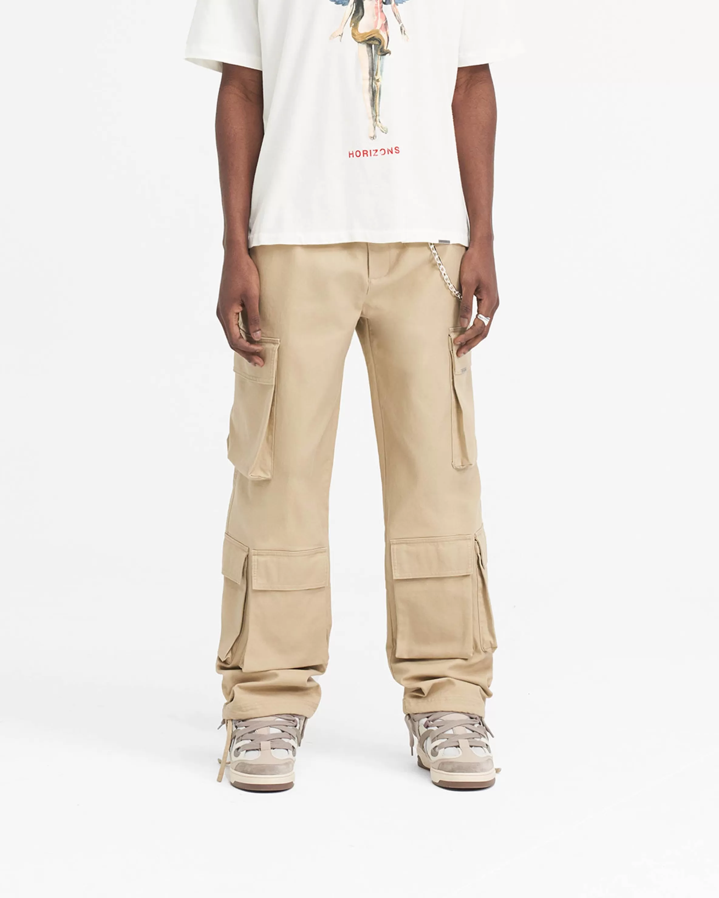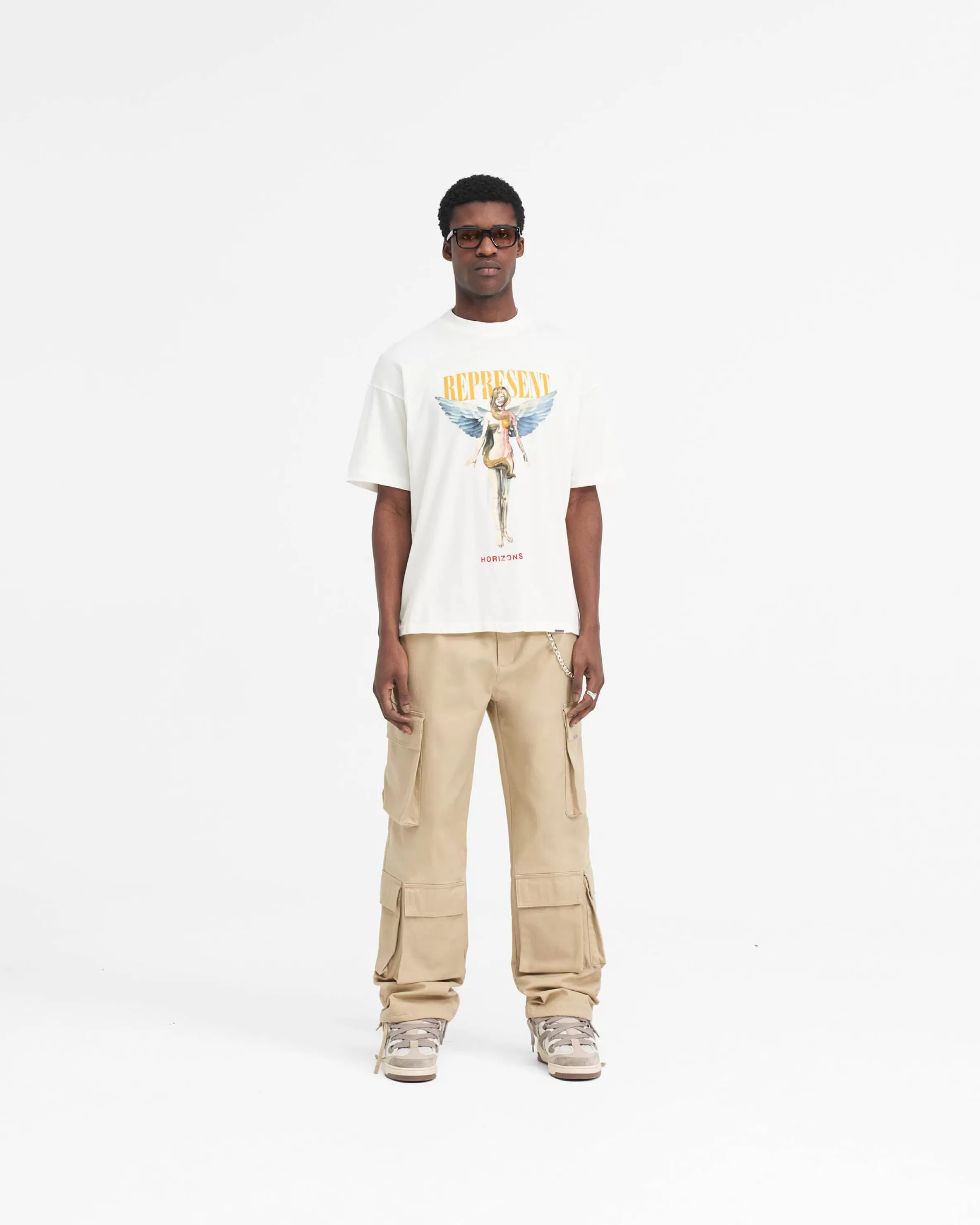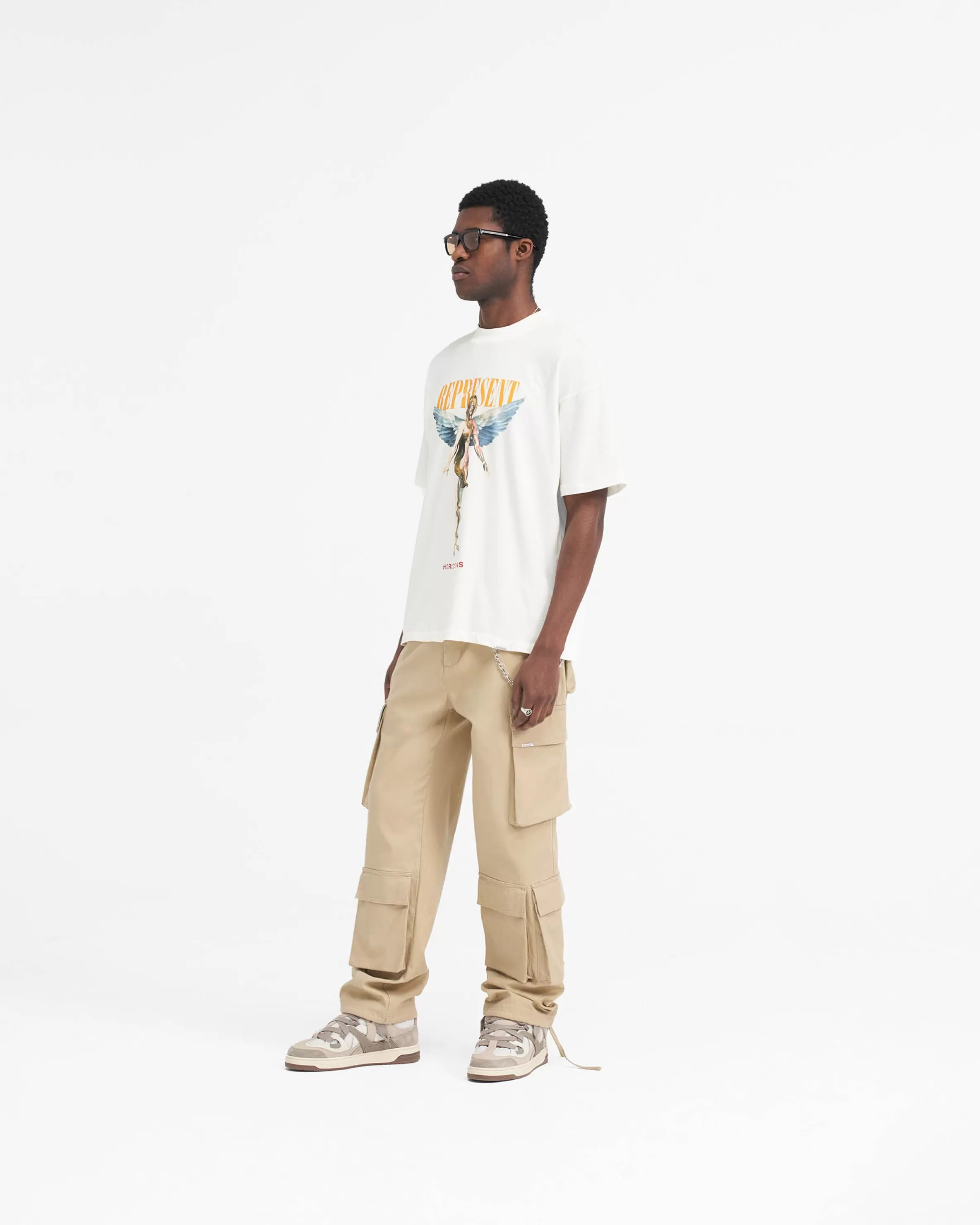 This item purchased in the Black Friday Sale is final sale and cannot be returned or exchanged. Introducing the Baggy Cargo Pant in Sandstone, a luxury cargo pant style crafted with a super soft hand feel. These cargos feature a cut and sew v yoke to the back, with oversized 3D pockets throughout. They have a similar baggy fit to our bestselling utility pant, with the addition of an antique silver branded belt loop bar and Represent metal bar to the cargo pocket. Sandstone Cargo Pants Baggy Fit 3D Oversized Pockets Antique Silver Metal Hardware Composition: 100% Cotton Product