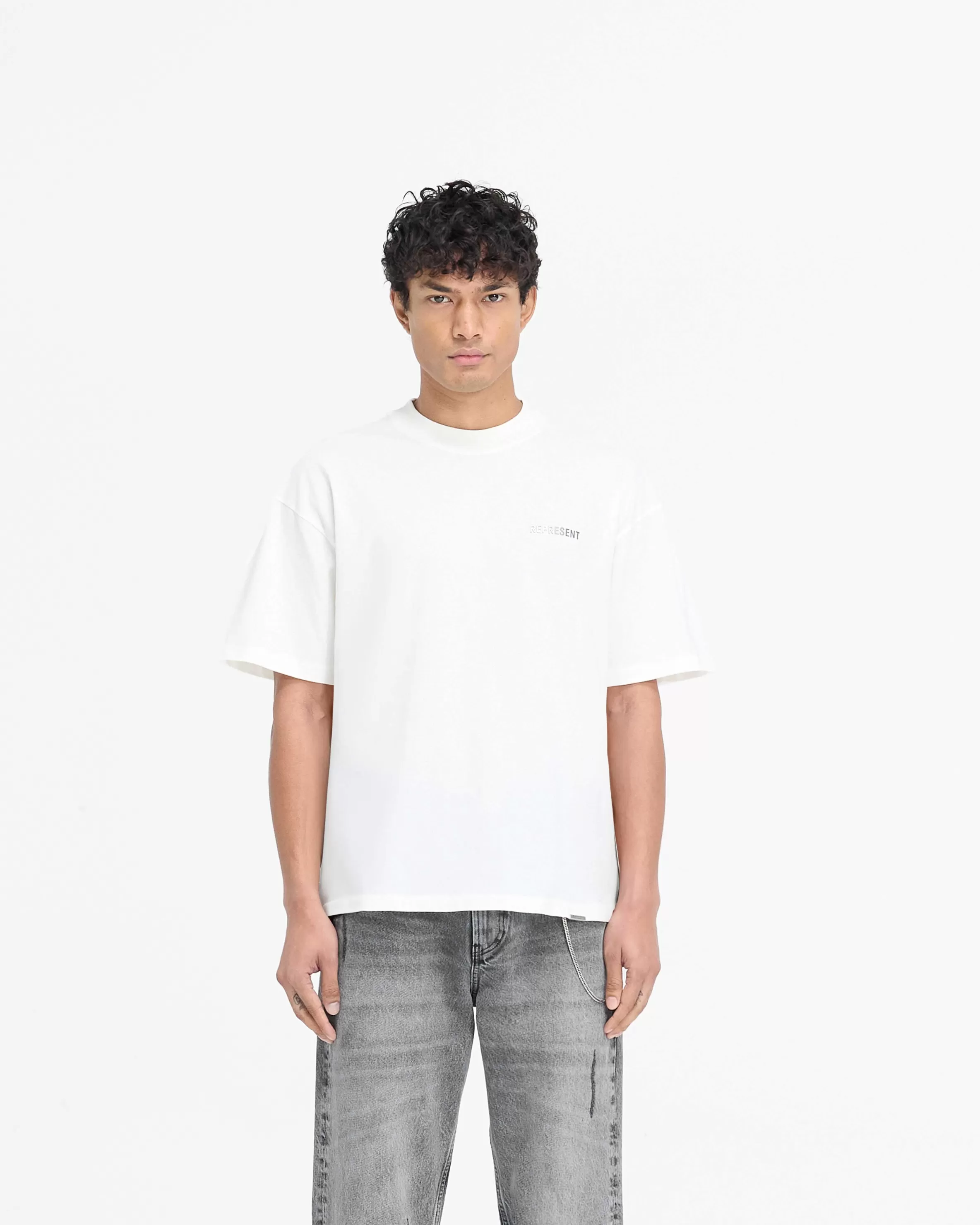 Introducing the Block Logo T-Shirt in Flat White, a slightly oversized t-shirt crafted from 100% cotton with a carbon finish for a super soft hand feel. The t-shirt showcases a minimalist detail blind hem finish, with silver metal block logo branding to the chest. It is finished with a Represent metal bar logo to the hem. Block Logo T-Shirt Flat White Slightly Oversized Super Soft Fabric Finish Blind Hem Metal Branding Represent Metal Bar Logo Composition: 100% Cotton Product Care: Mild Wash at 30 Degrees Celsius. Do not bleach, do not tumble dry, do not dry clean. Line dry in shade. Cool iron on reverse. Model is 188cm and 75kg wearing size MProduct