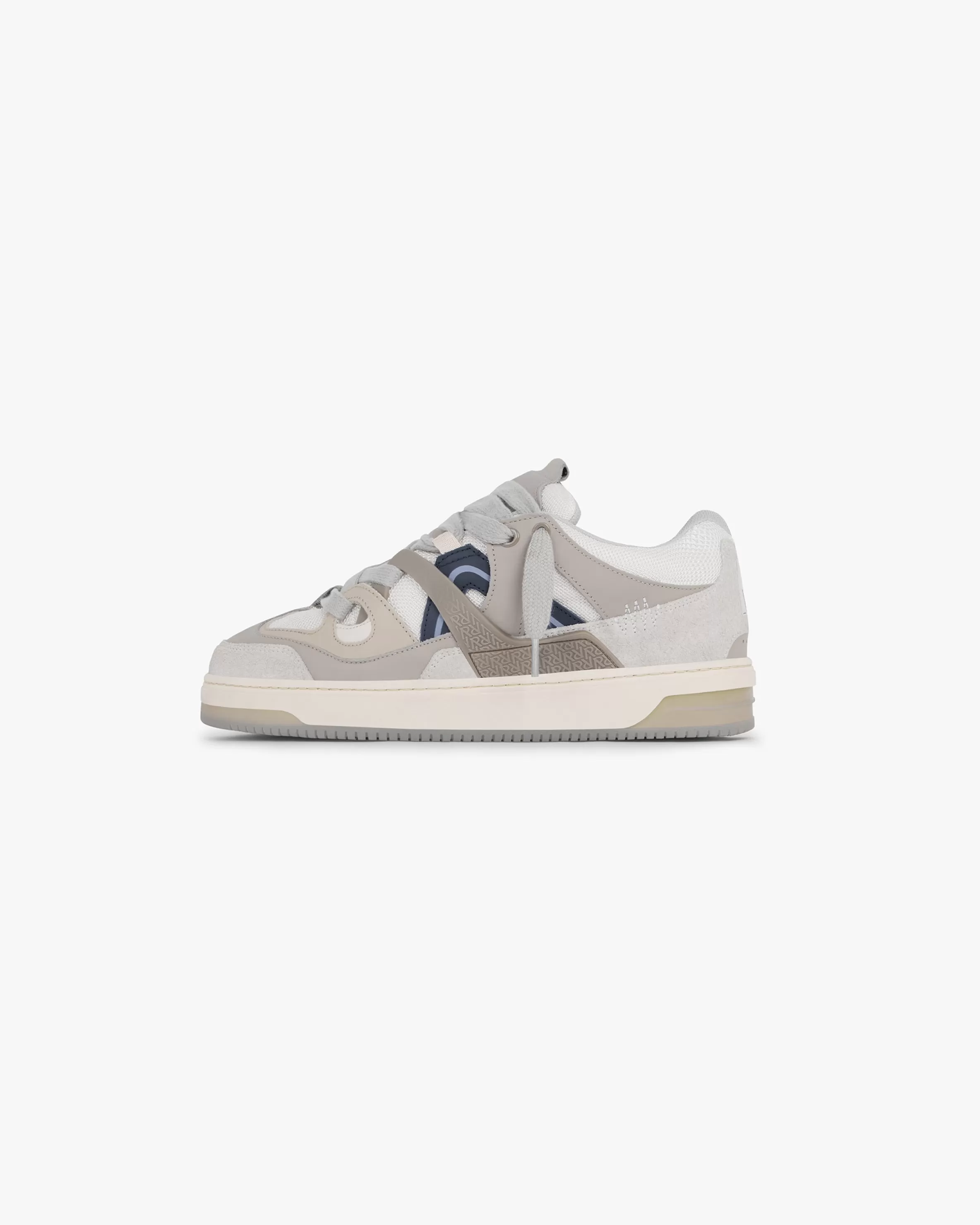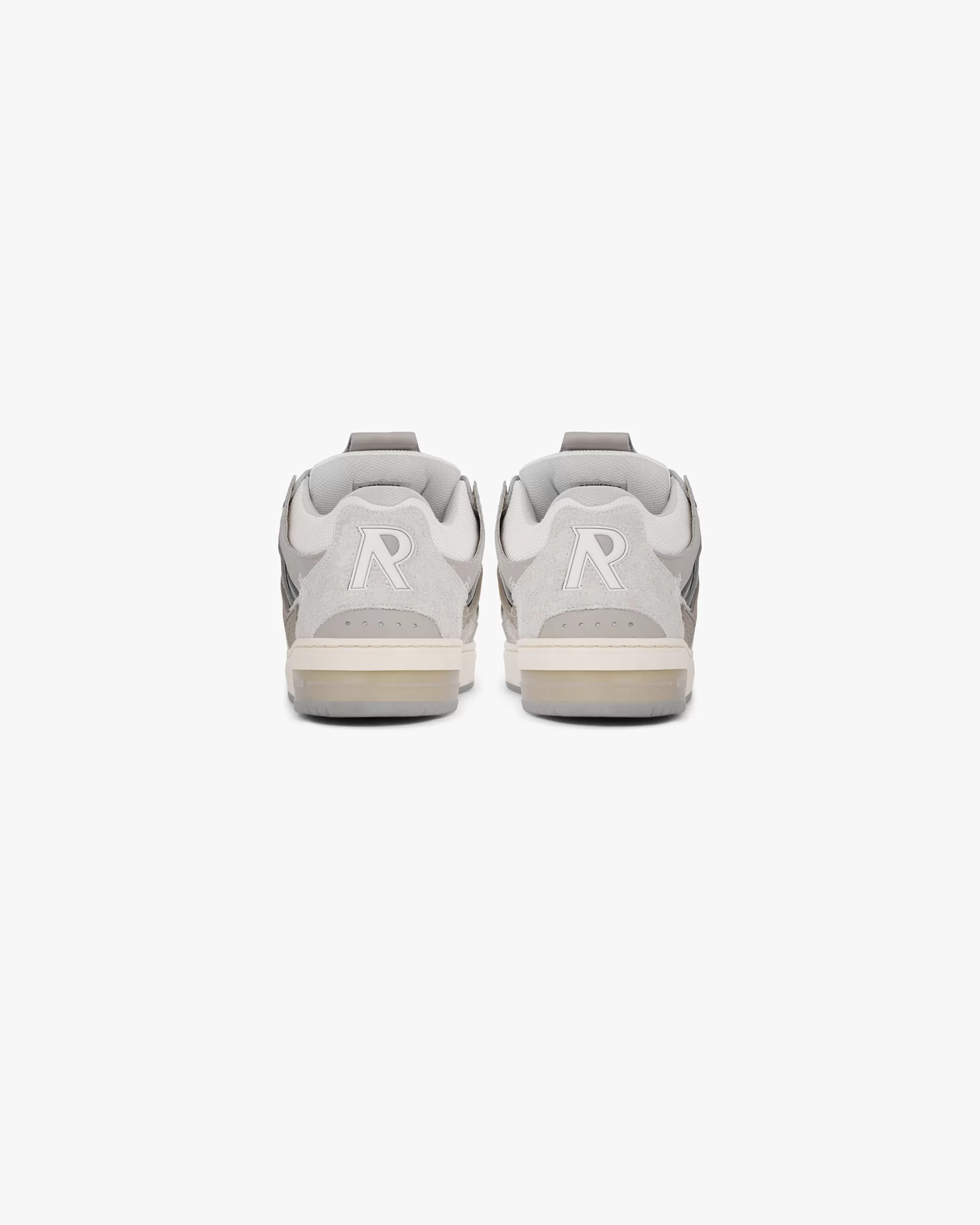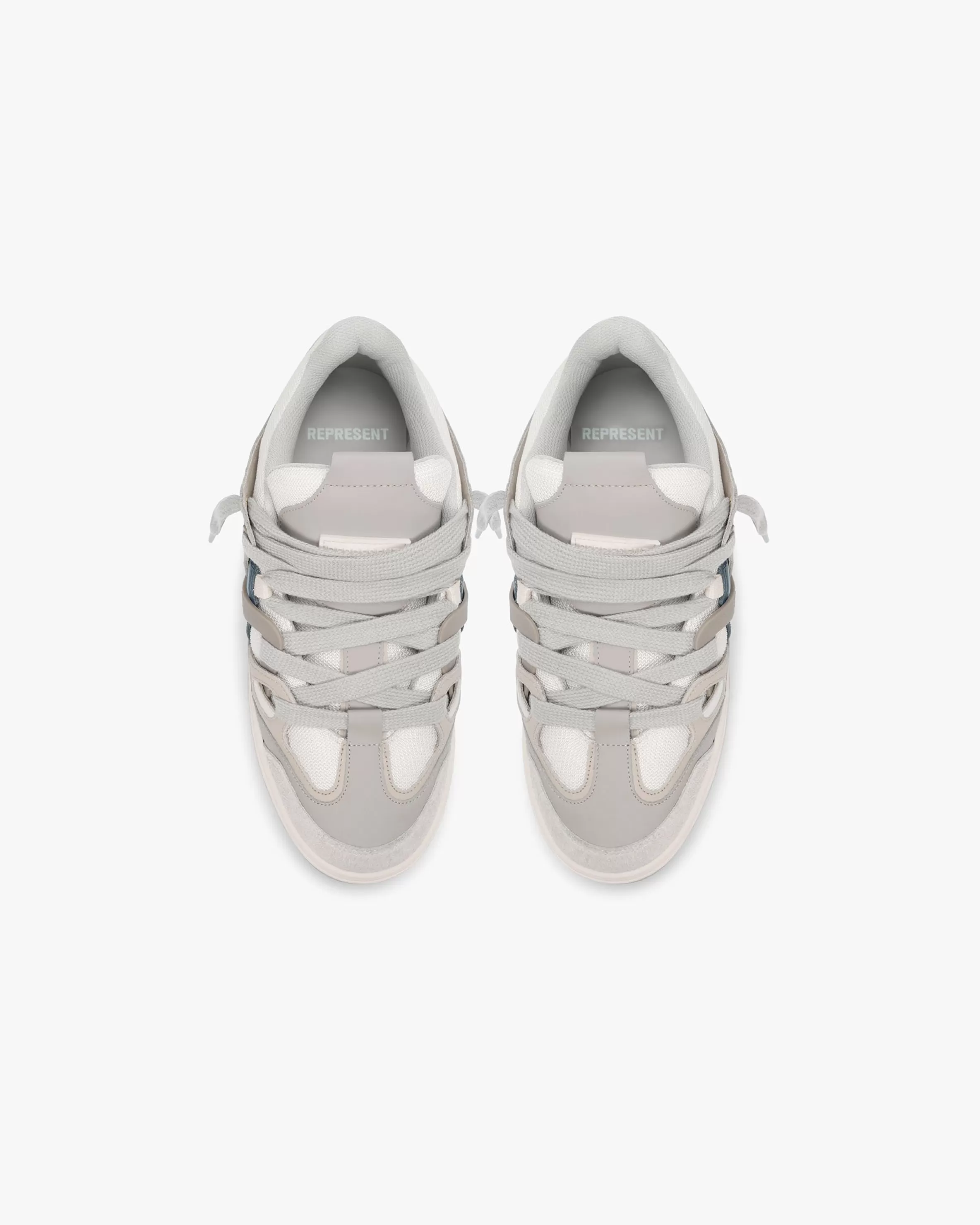 This item purchased in the Black Friday Sale is final sale and cannot be returned or exchanged. The Bully in Grey is a retro skate-inspired sneaker. It features a ballistic nylon mesh upper, with luxury leather, nubuck and hairy suede overlays. It exhibits Represent’s initial logo in an all over fashion on a TPU exoskeleton, with complex stitching and a final initial logo worked into the heel of the shoe. A padded collar and chunky lacing reinforce the fierce aesthetic, whilst the two-tone skate inspired outsole unit fortifies ultimate comfort. Bully Sneaker Ballistic Nylon Mesh Upper Leather, Nubuck, Hairy Suede u0026amp; TPU Overlays Complex Stitching Padded Collar Chunky Lacing Composition: Upper: Leather, Nubuck, Suede, Nylon Mesh u0026amp; TPUSole: Rubber Fits true to size. For reference, please take your usual size in Apex.Comes with both Vintage White u0026amp; Grey lace options. Product