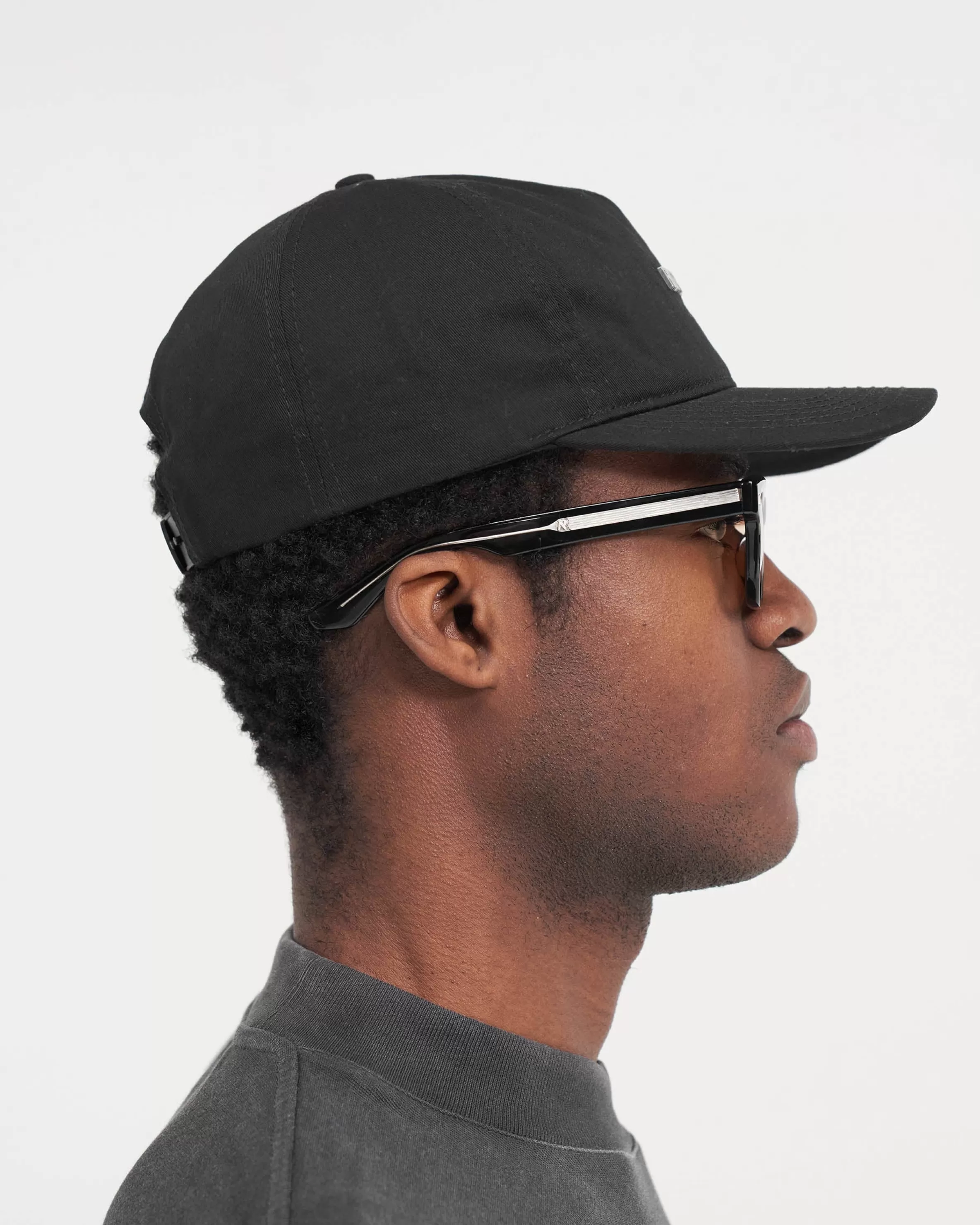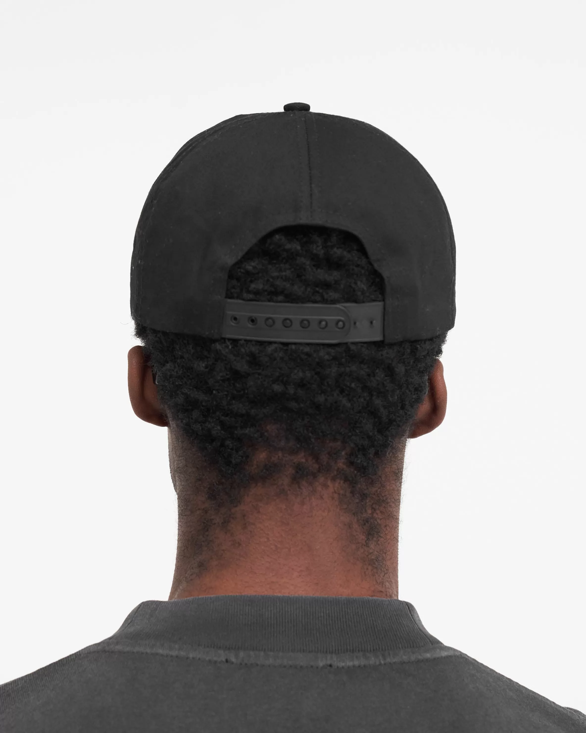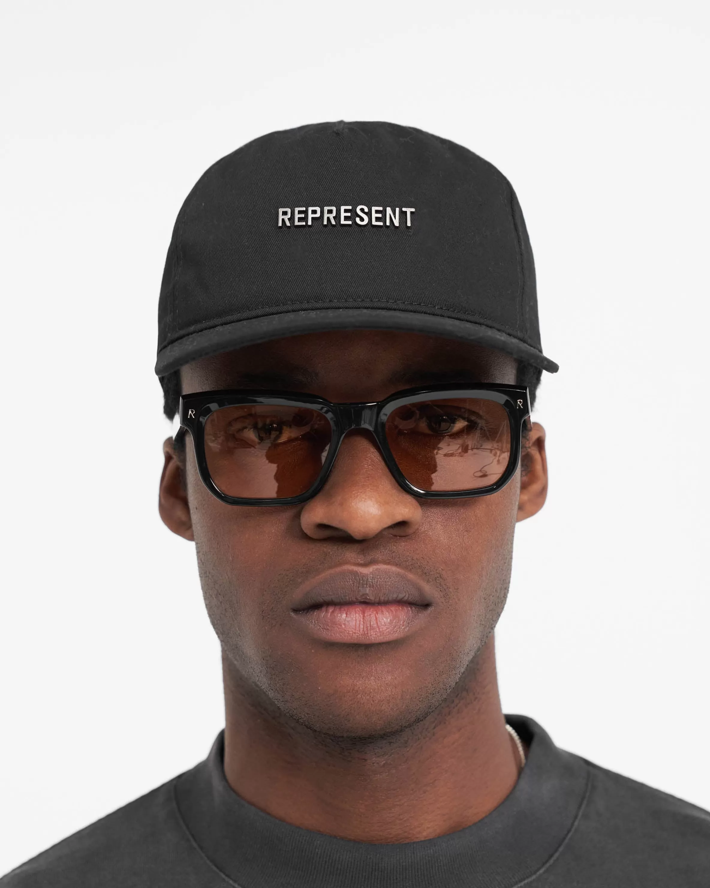 Introducing the Represent Cap in Black, a clean golfer cap silhouette featuring metal Represent lettering to the front. Black Cap Golfer Silhouette Metal Represent Lettering Product