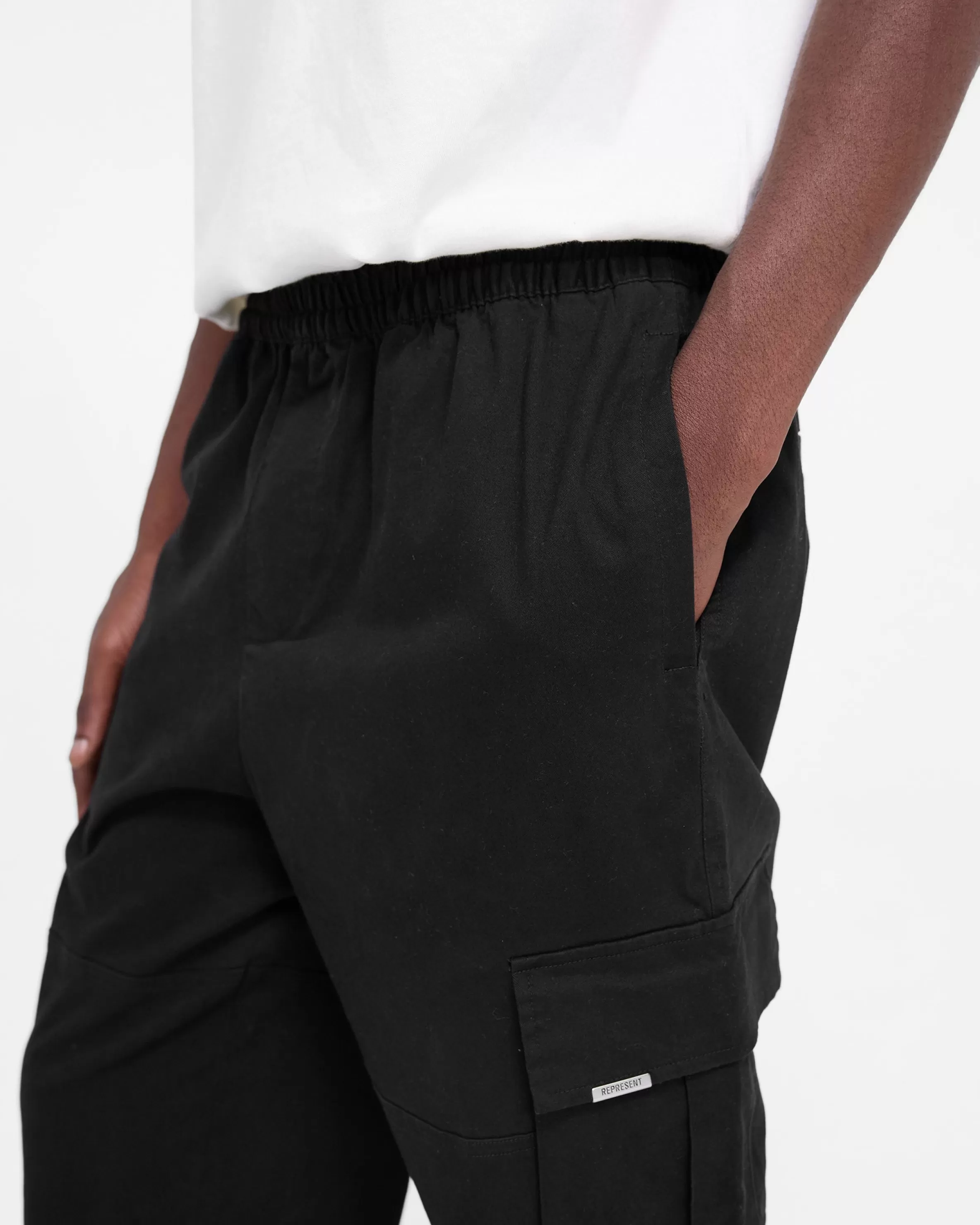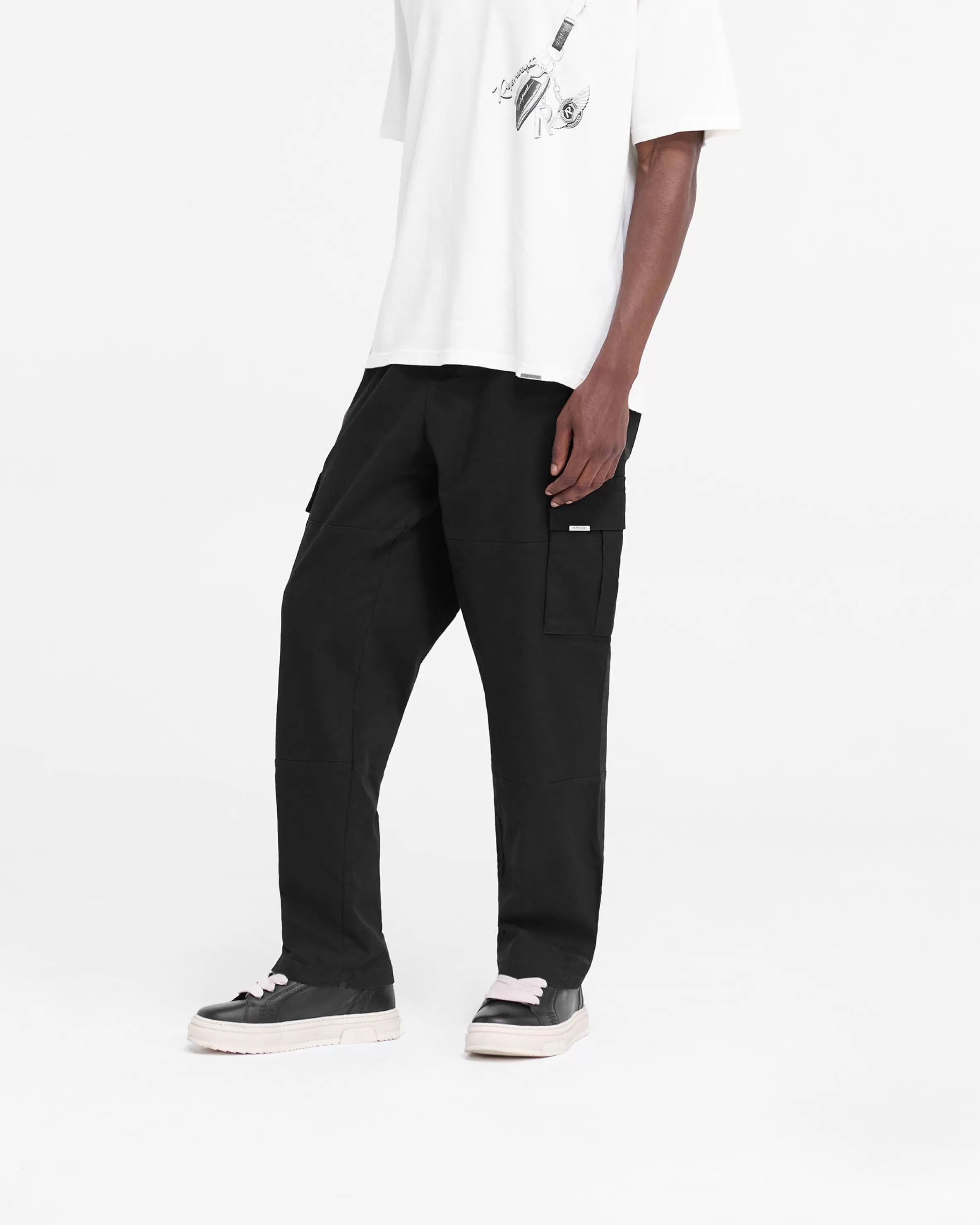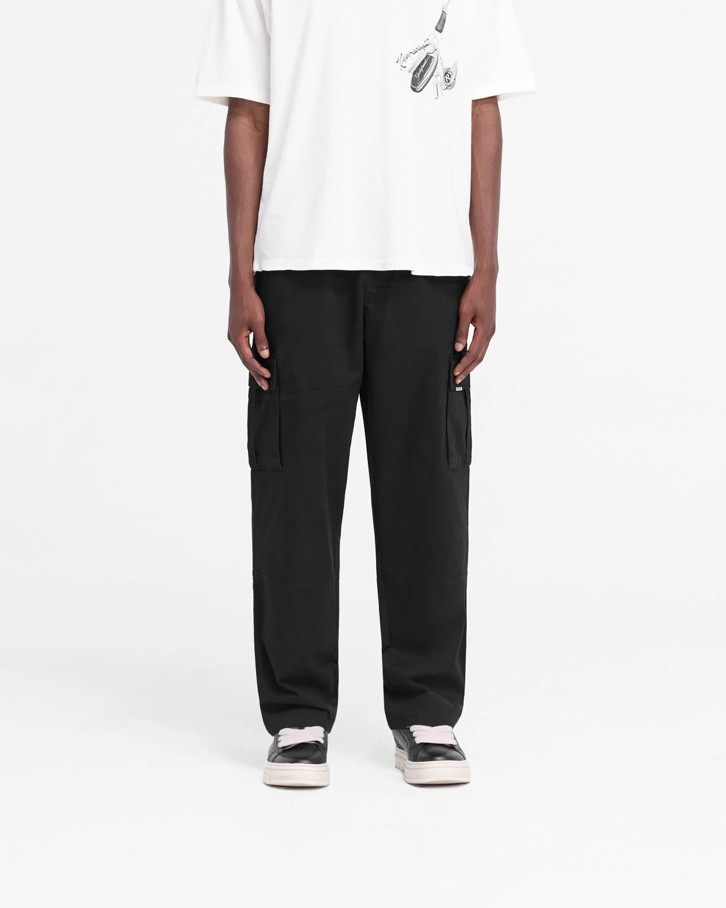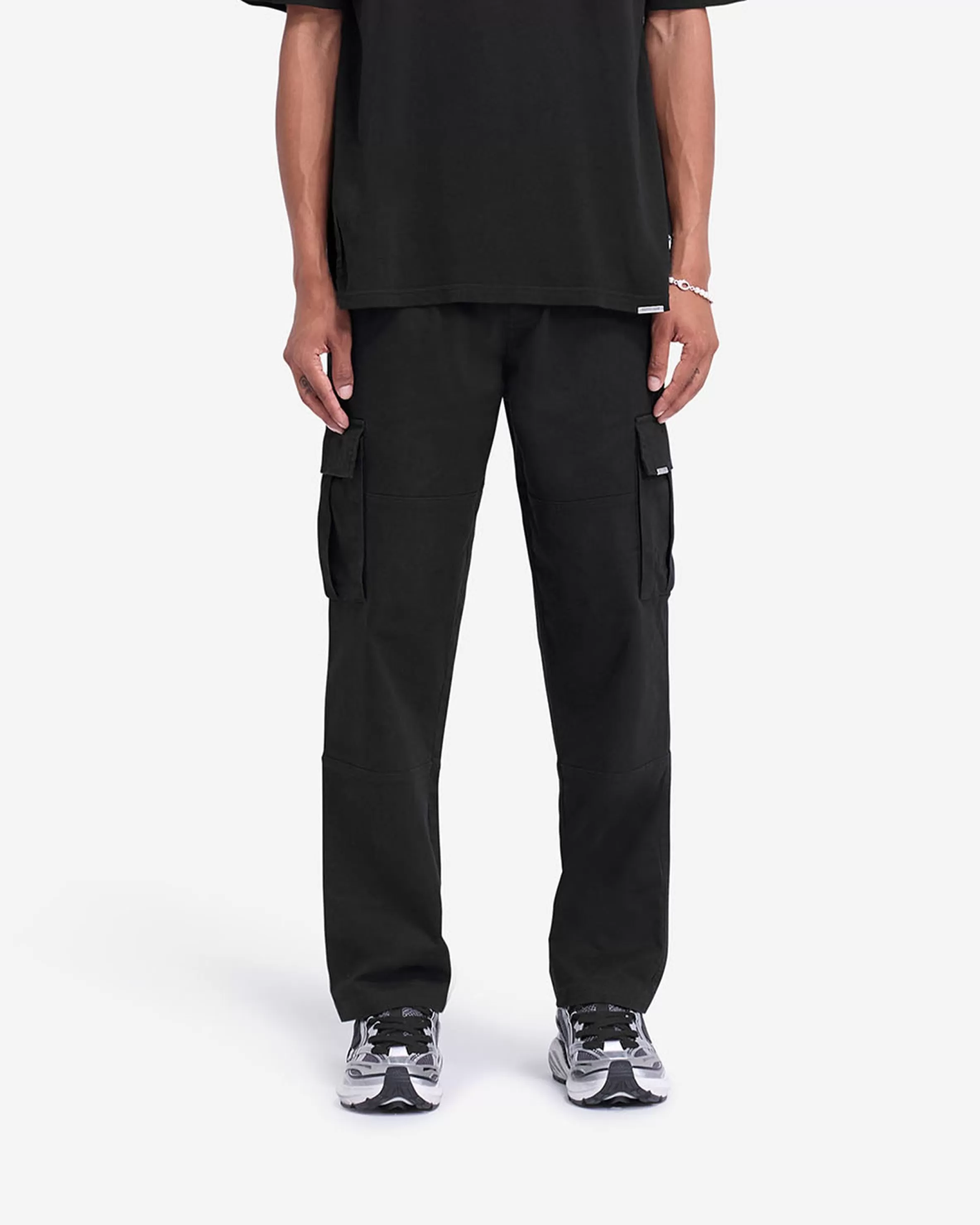 Introducing the new seasonal Cargo Pant in Black. This refined take on the classic silhouette showcases a slimmer, more regular fit from our typical cargo styles. The lightly washed effect and super soft cotton construction afford a vintage look and feel, while flap pockets with metal bar detailing add an element of further refinement. The elasticated waistband with internal drawcord ensures ultimate comfort, making these cargo pants an everyday essential. Black Cargo Pants Regular Fit Lightly Washed Flap Pockets Metal Bar Detailing Elasticated Waistband with Internal Drawcord Composition: 100% Cotton Excluding Trims Product Care: Machine wash at 30 degrees celsius. Do not bleach, tumble dry or dry clean. Iron at medium temperature. Wash with similar colours inside out. Do not pile whilst damp or rub isolated stains. Model is 188cm and 75kg wearing size MProduct