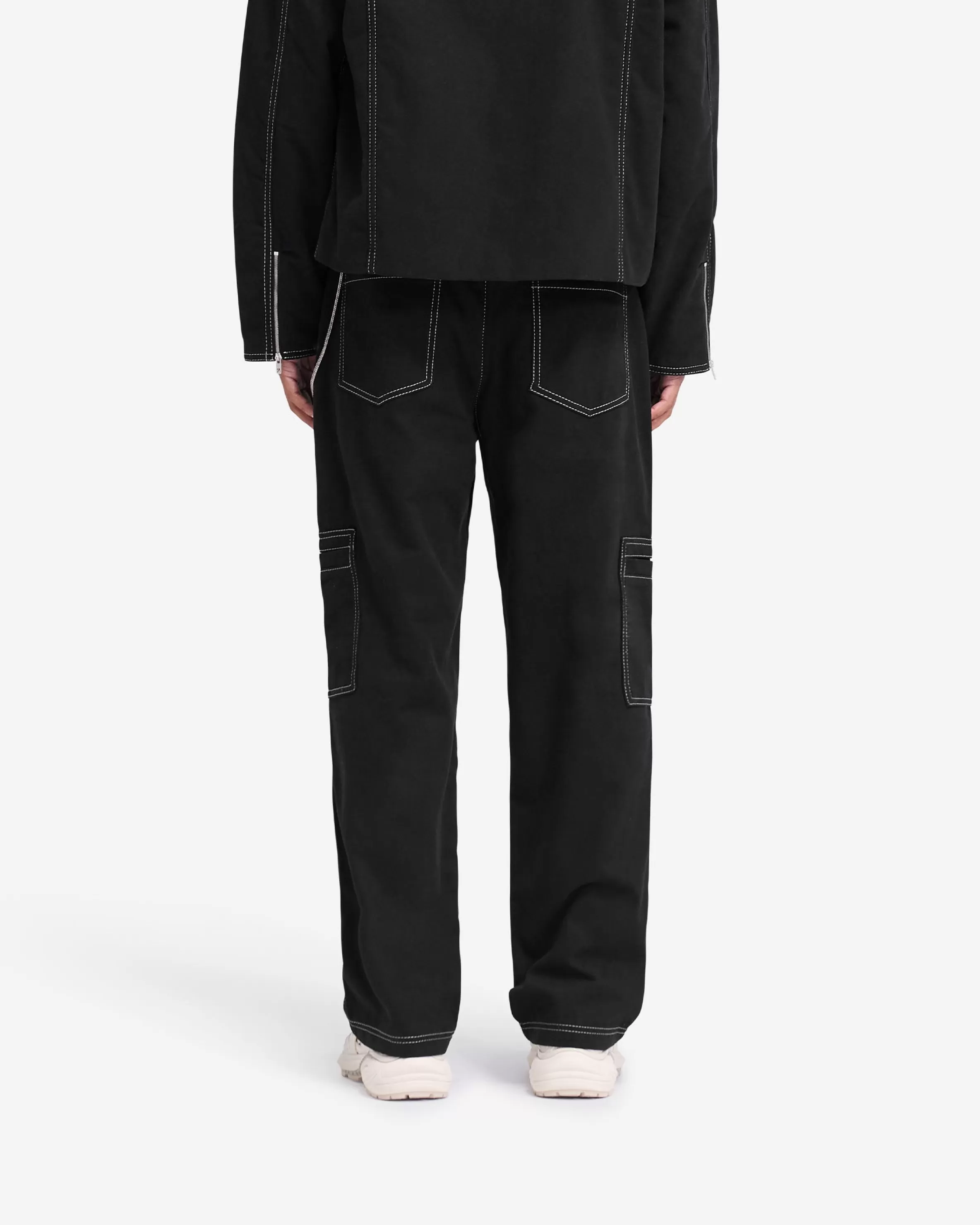 Introducing the Contrast Stitch Pant in Jet Black, a relaxed straight leg pant crafted from a luxury cotton twill fabric…