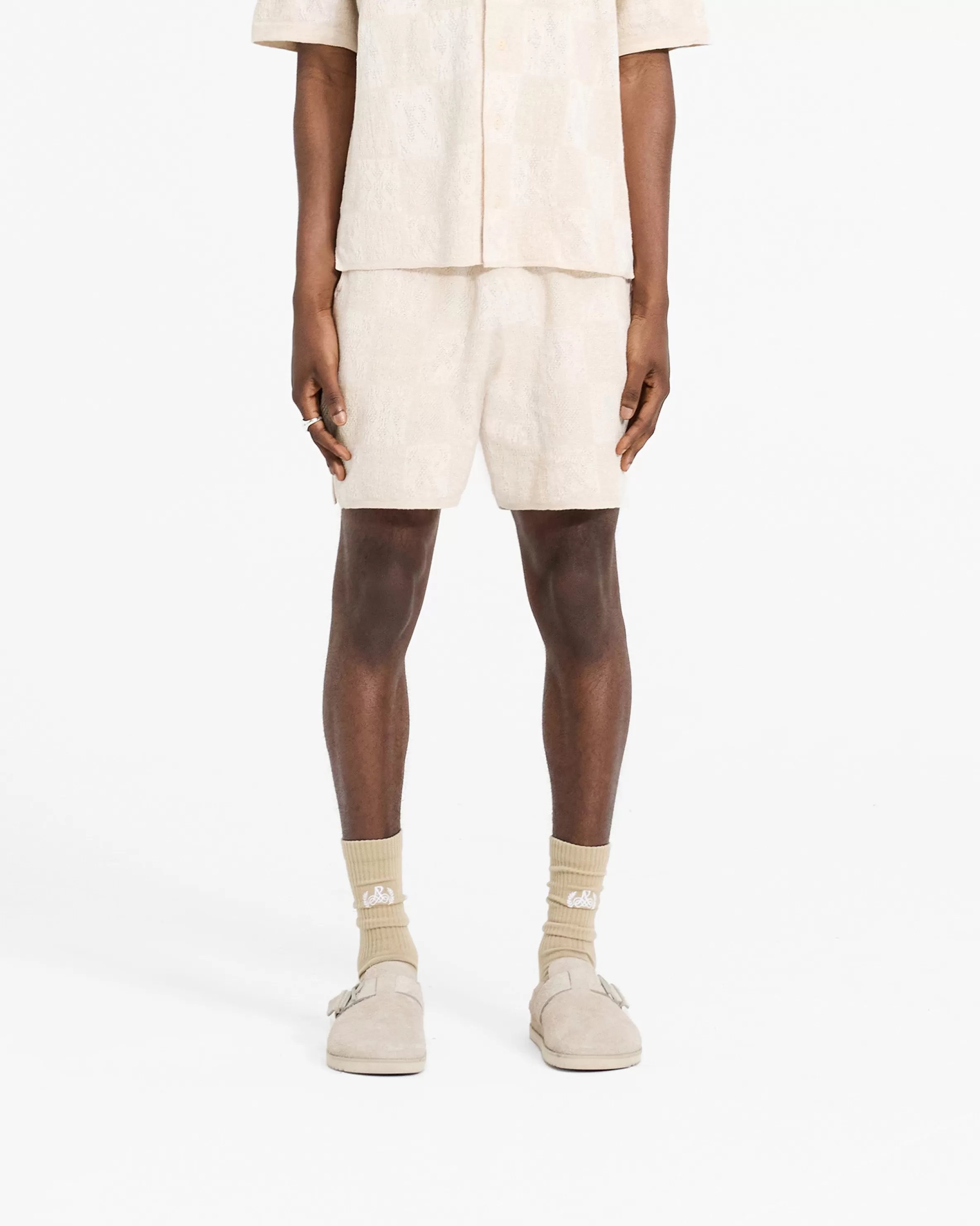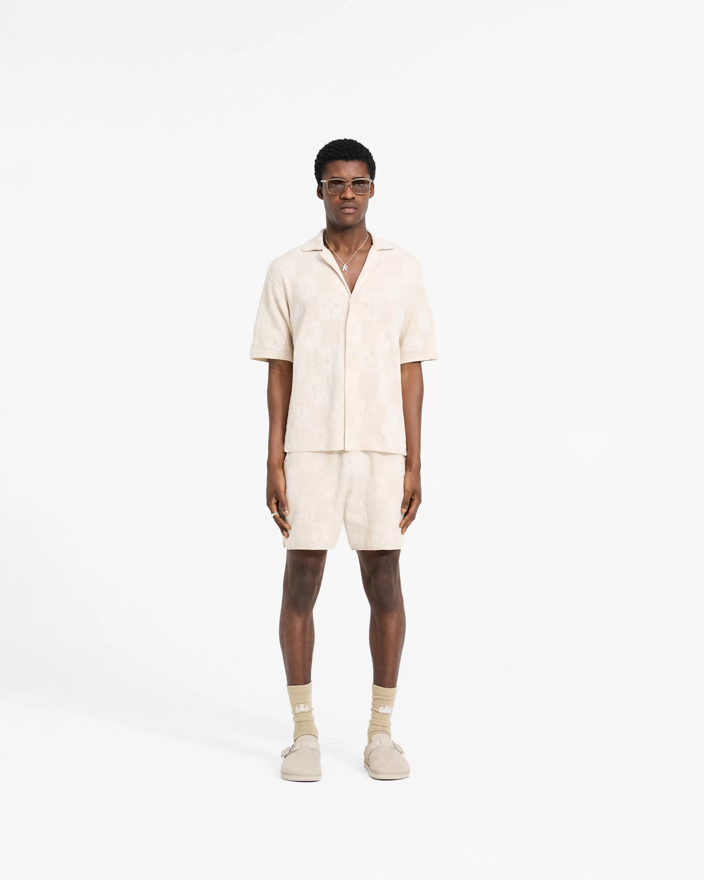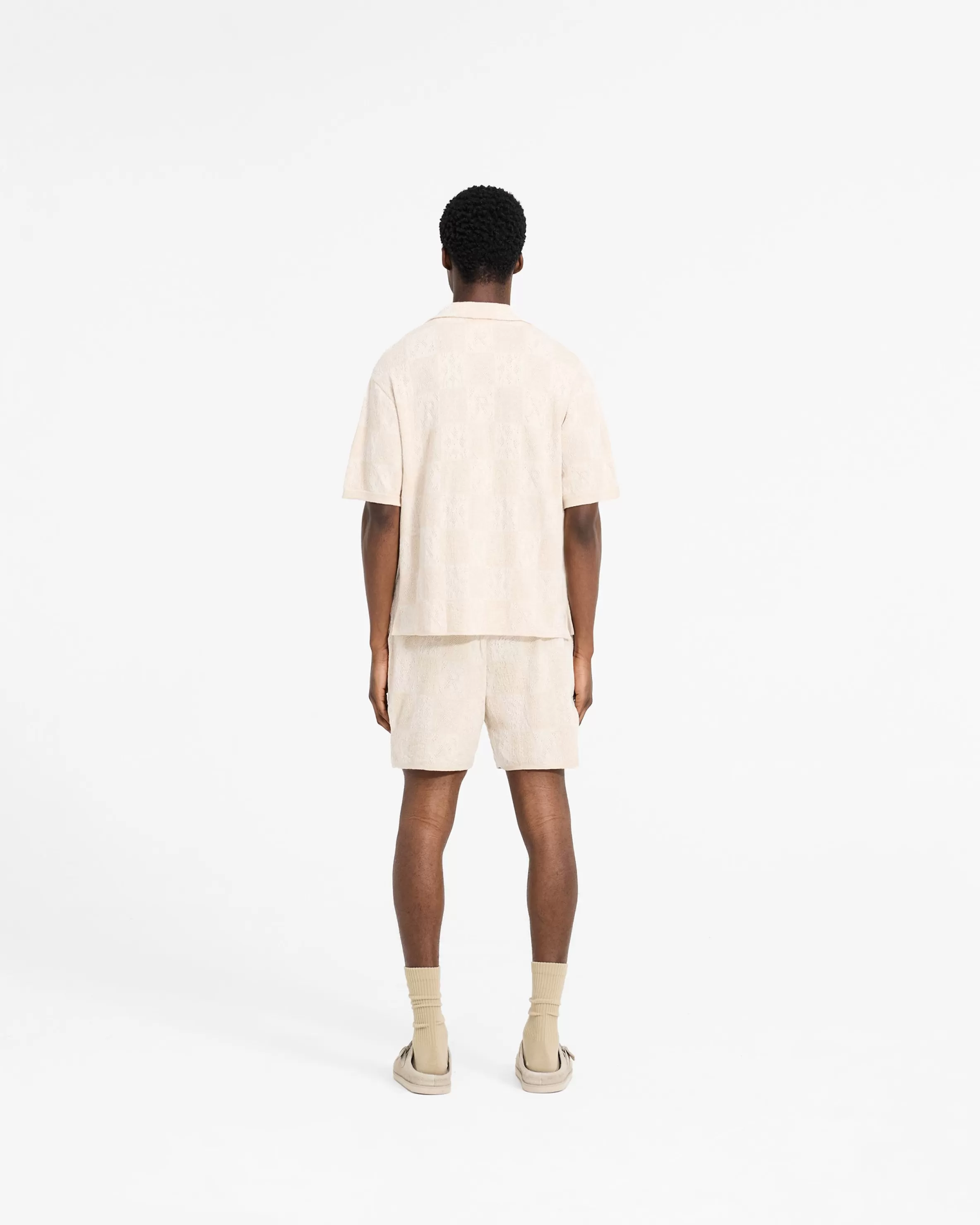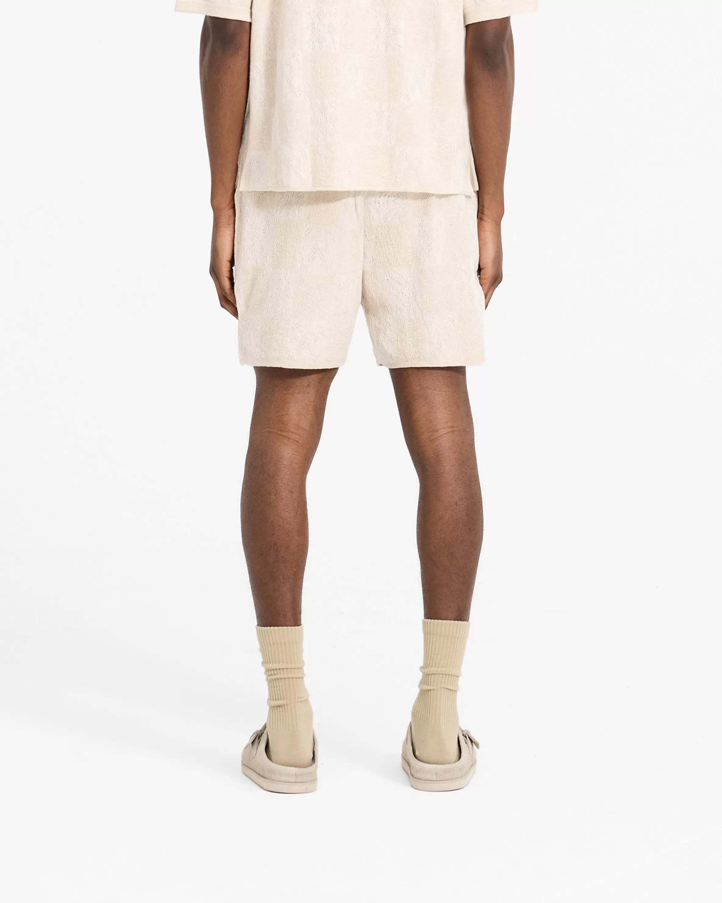 Introducing the Crochet Knit Shorts, a relaxed and drapey short style, crafted from a lightweight crochet knit fabric. The shorts feature a checkerboard intarsia Initial pattern throughout the garment. Crochet Knit Short Slightly Oversized u0026amp; Drapey Lightweight Crochet Fabric Intarsia Initial Pattern Composition: 100% Cotton Model is 182cm and 73kg wearing size MProduct