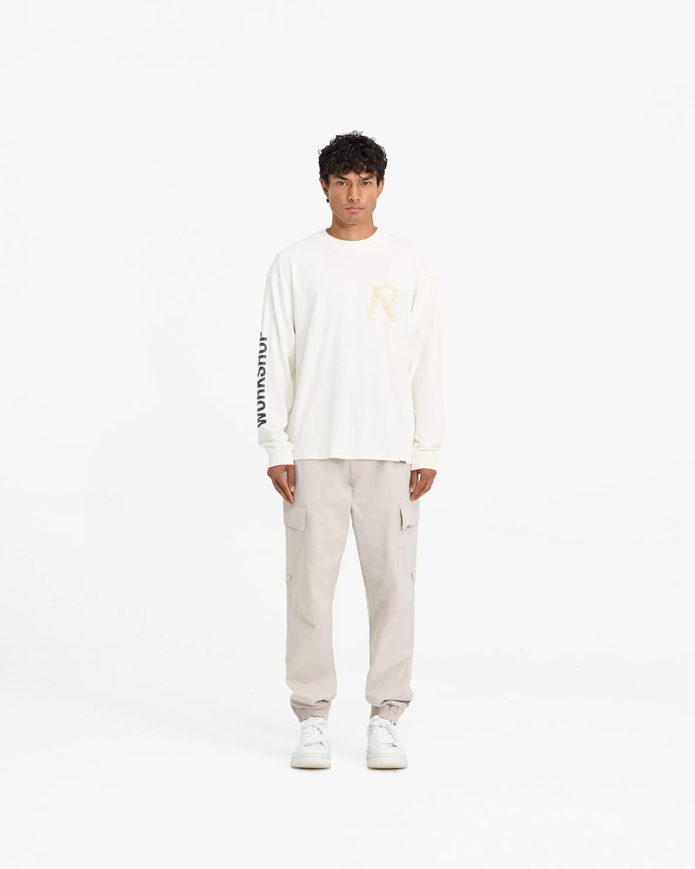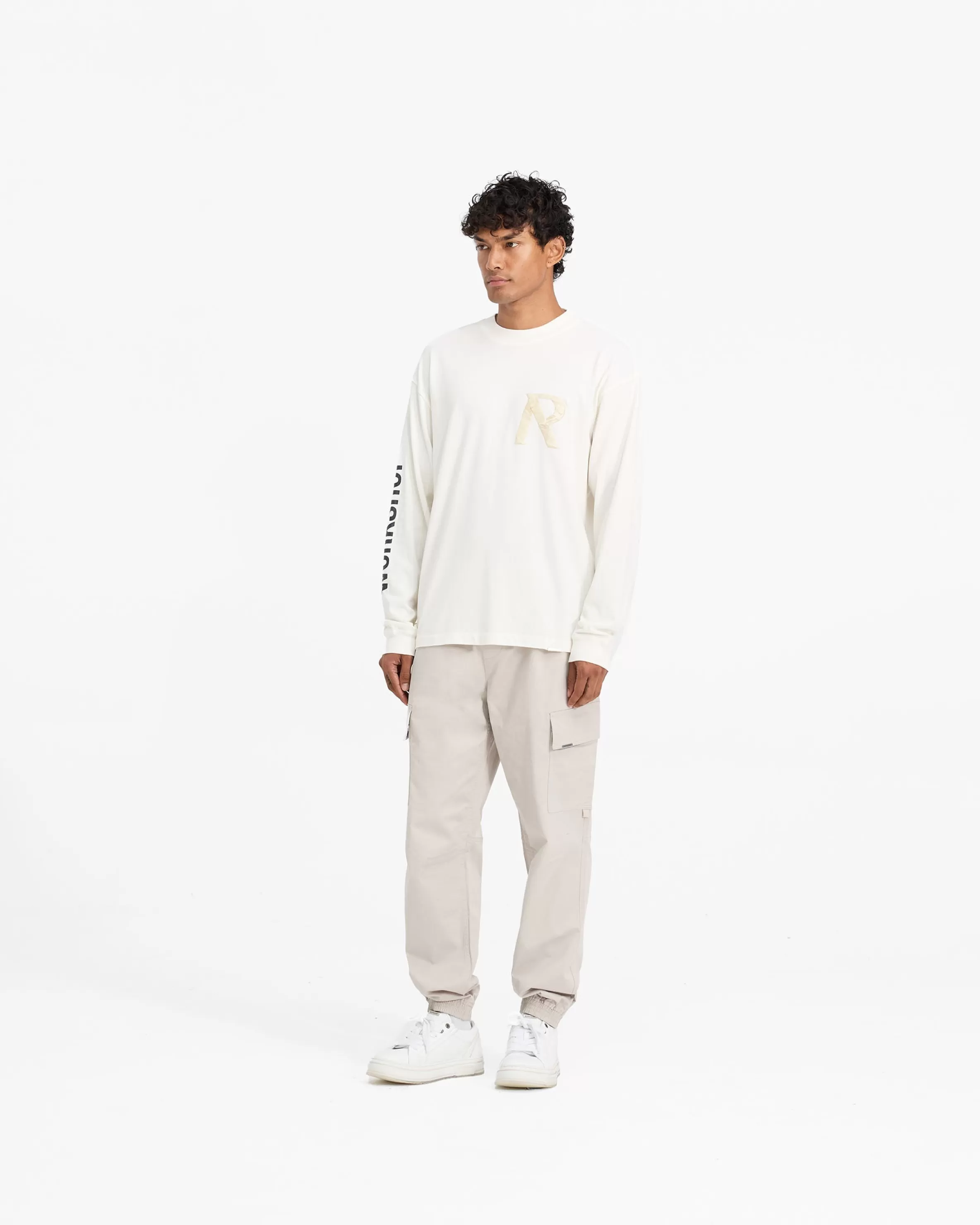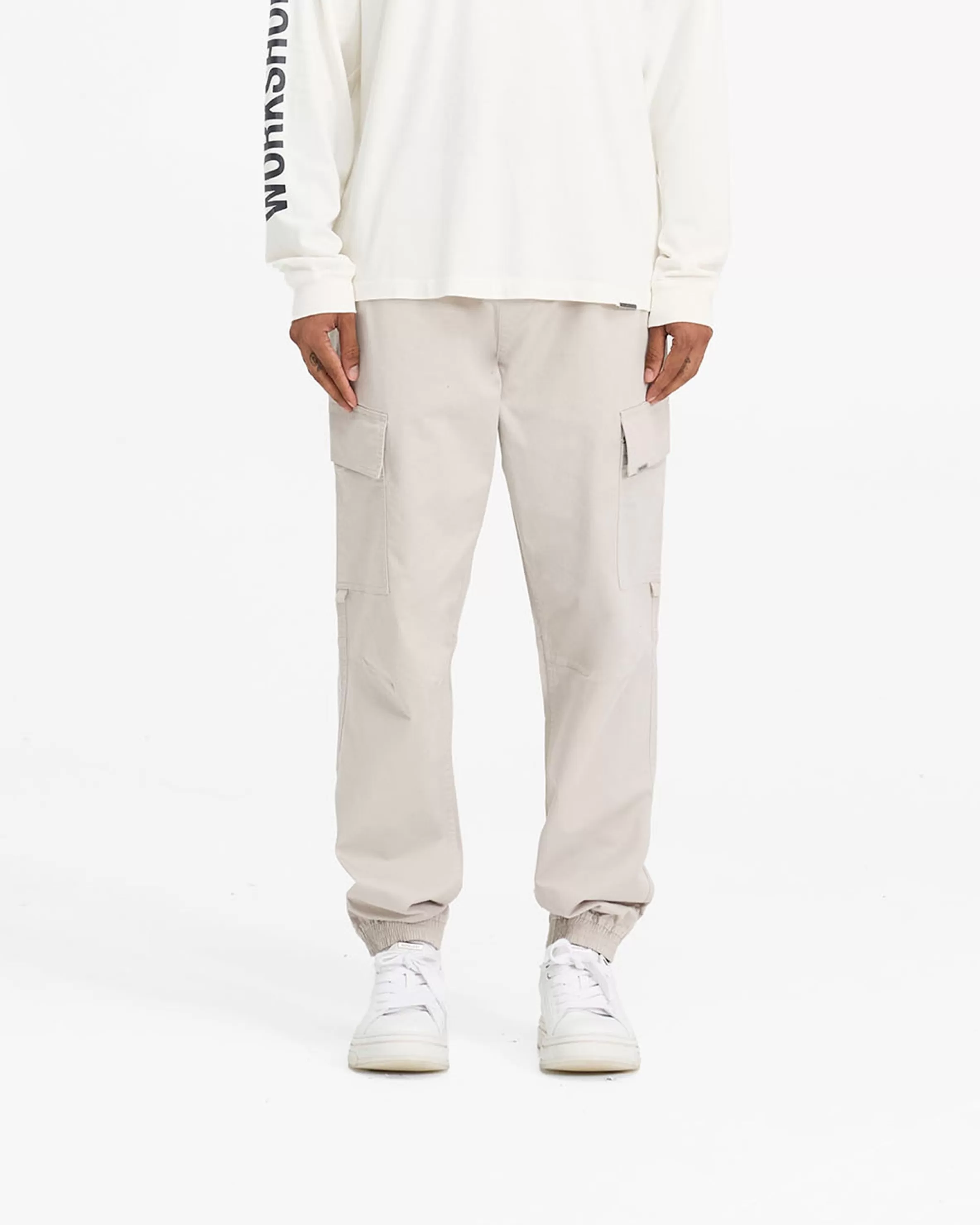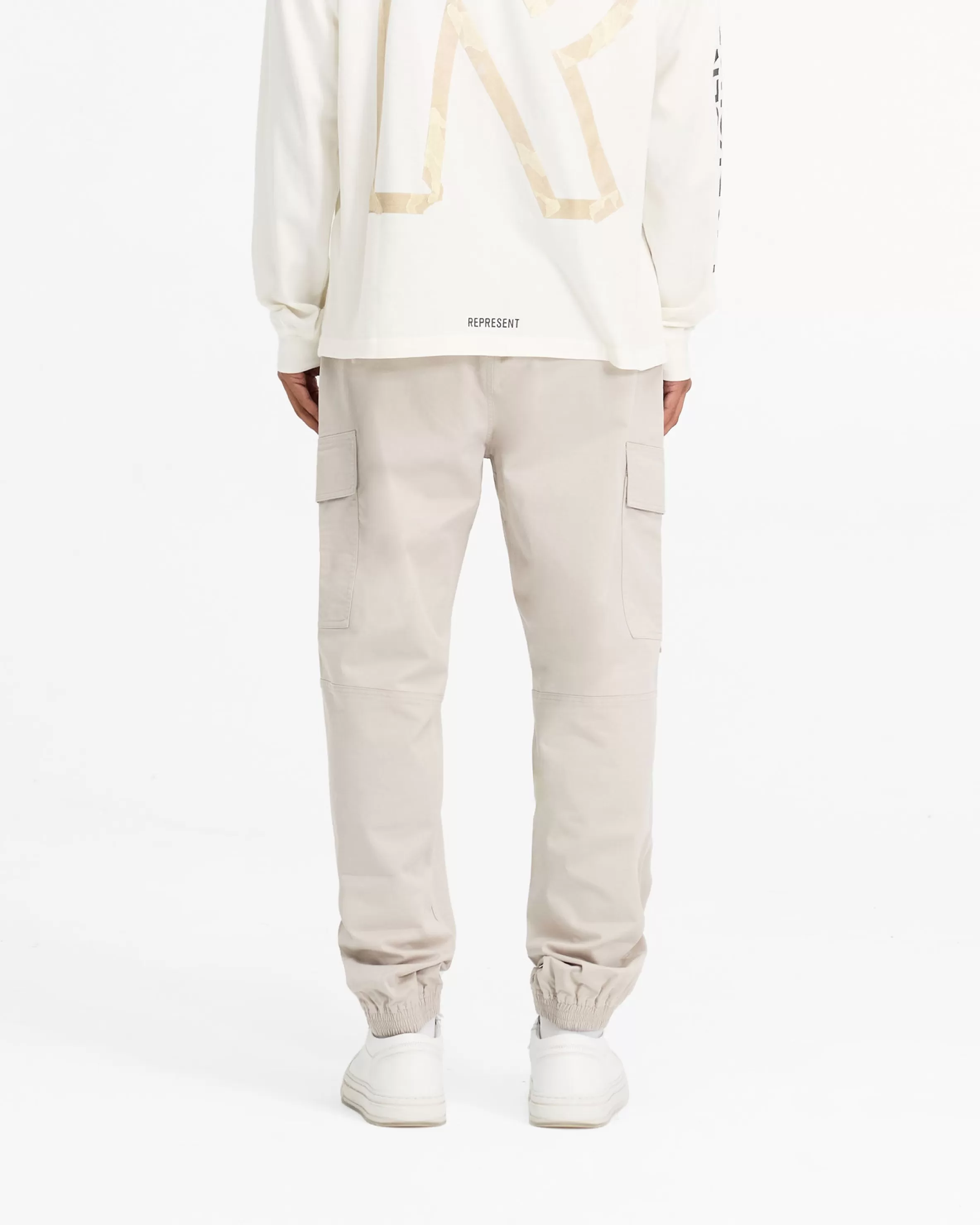 Introducing the Cuffed Cargo Pant in Stone, a contemporary take on the classic cargo silhouette, with a more regular fit from our baggier styles. These cargos feature an elasticated waistband with an internal drawcord. They have side pockets and cargo pockets with a Represent metal bar logo to the pocket flap. The cargos are finished with elasticated cuffs. Stone Cargo Pants Elasticated Cuffs Elasticated Waistband Cargo Pockets Metal Bar Logo Composition: Outer: 97% Cotton, 3% ElastaneLining: 100% Cotton Product Care: Machine wash at 30 degrees celsius. Do not bleach, tumble dry or dry clean. Iron on medium heat. Wash with similar colours inside out. Do not pile whilst damp. Iron on reverse. Do not rub isolated stains. Model is 188cm and 75kg wearing size MProduct