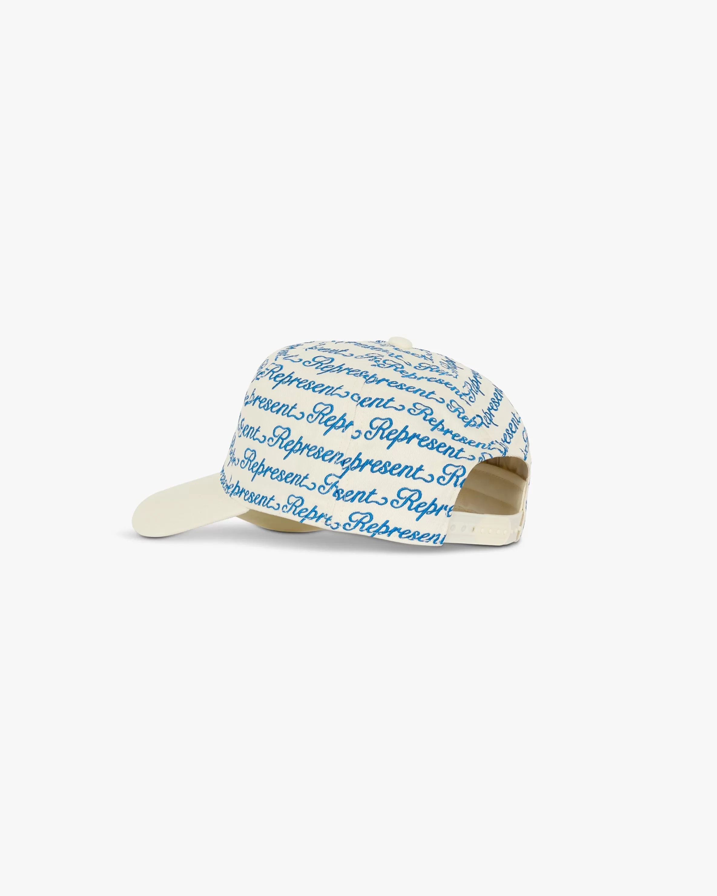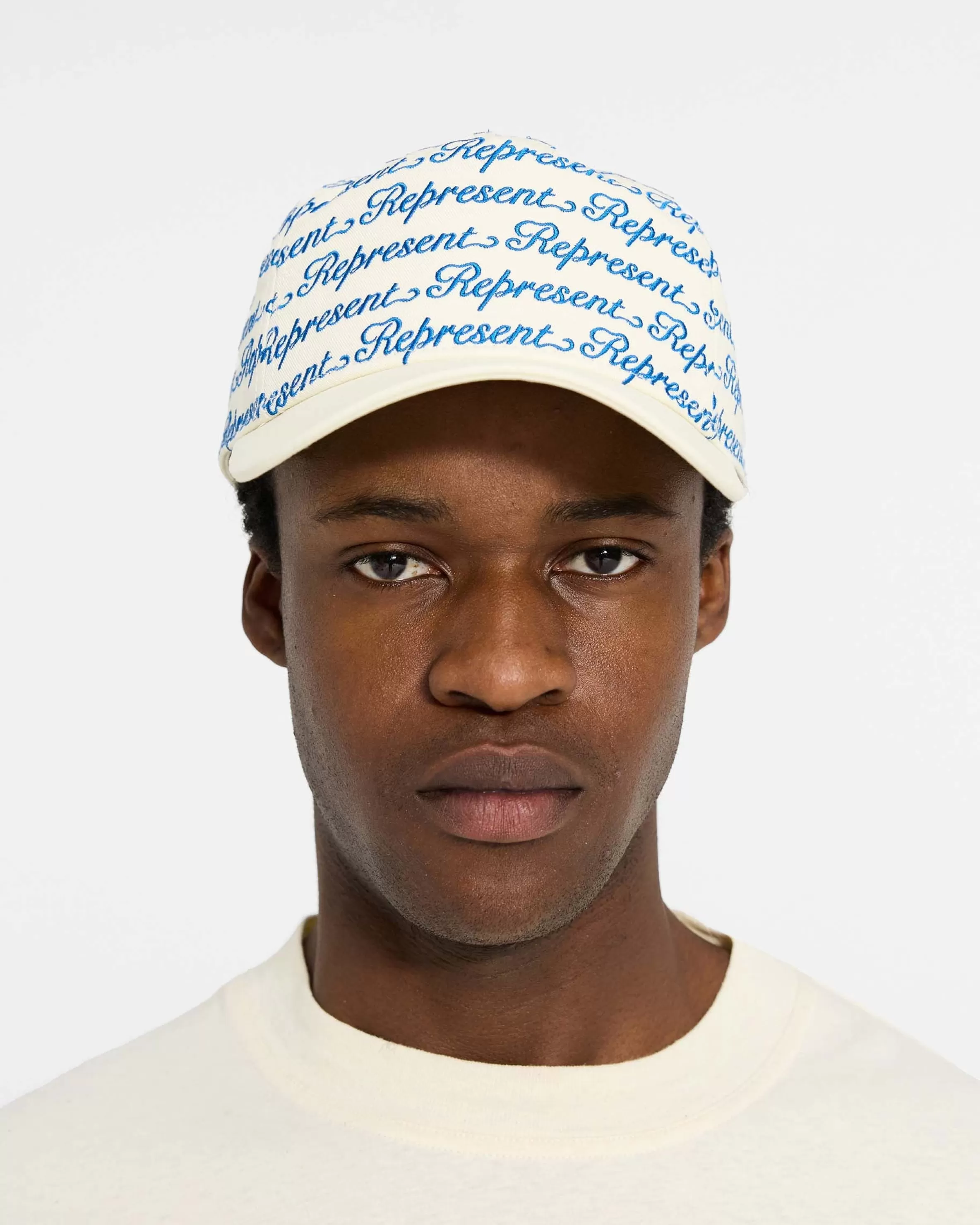 This item purchased in the Black Friday Sale is final sale and cannot be returned or exchanged. Introducing the Represent Embroidered Cap in Antique White, an unstructured cap with snapback adjuster. This cotton twill cap features repeat embroidered Represent branding in royal blue. Antique White Cap Unstructured Build Snapback Adjuster Embroidered Represent Branding Product