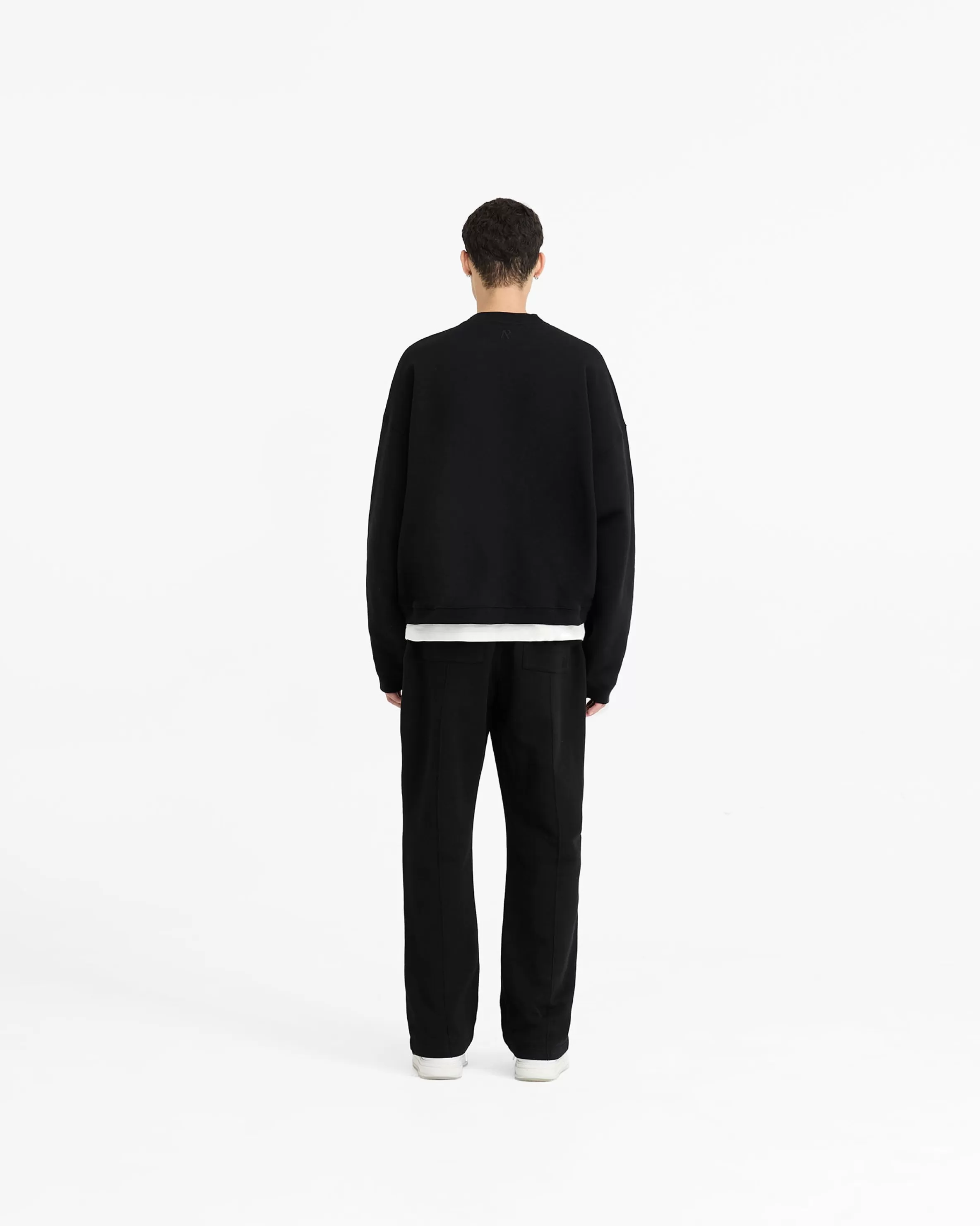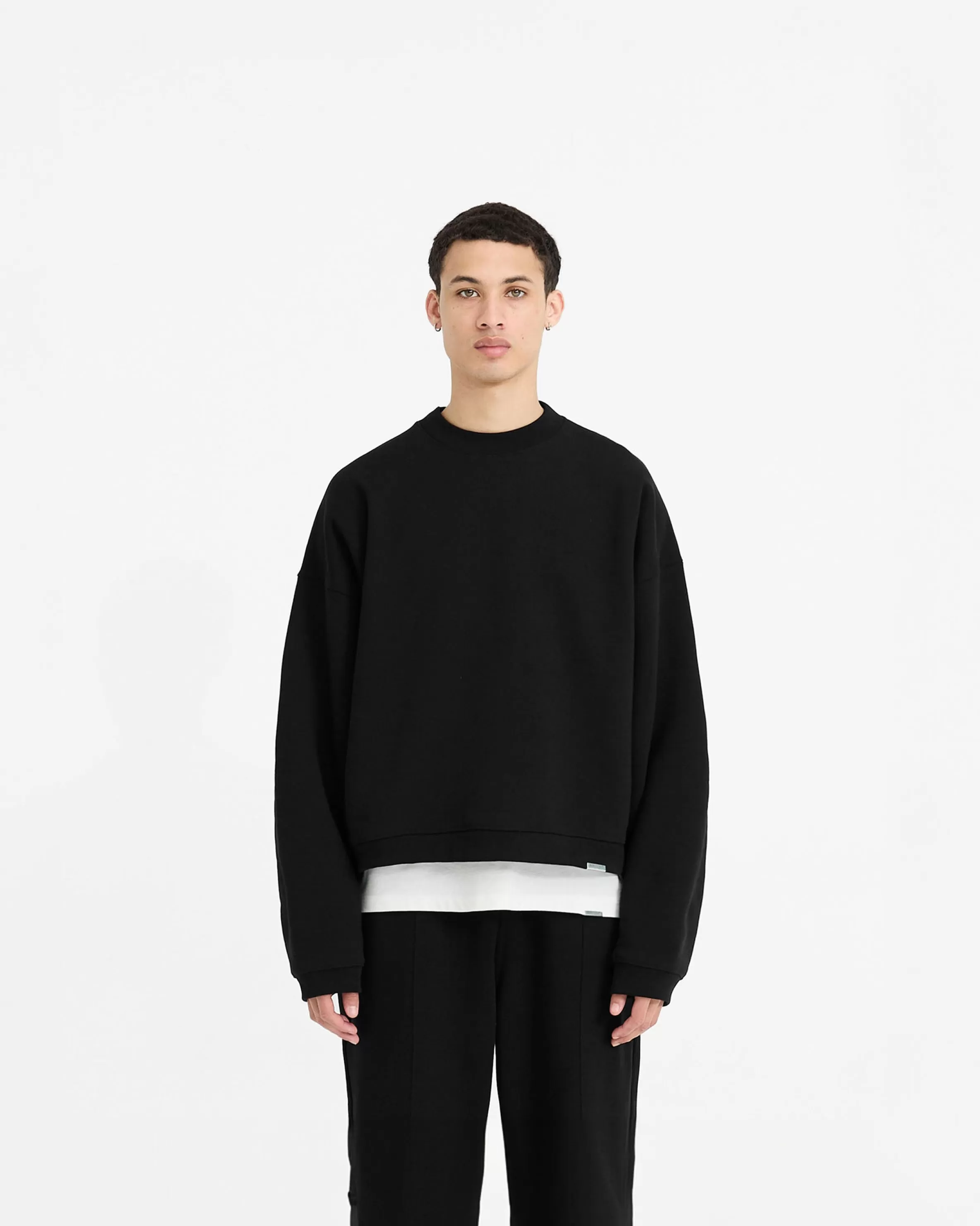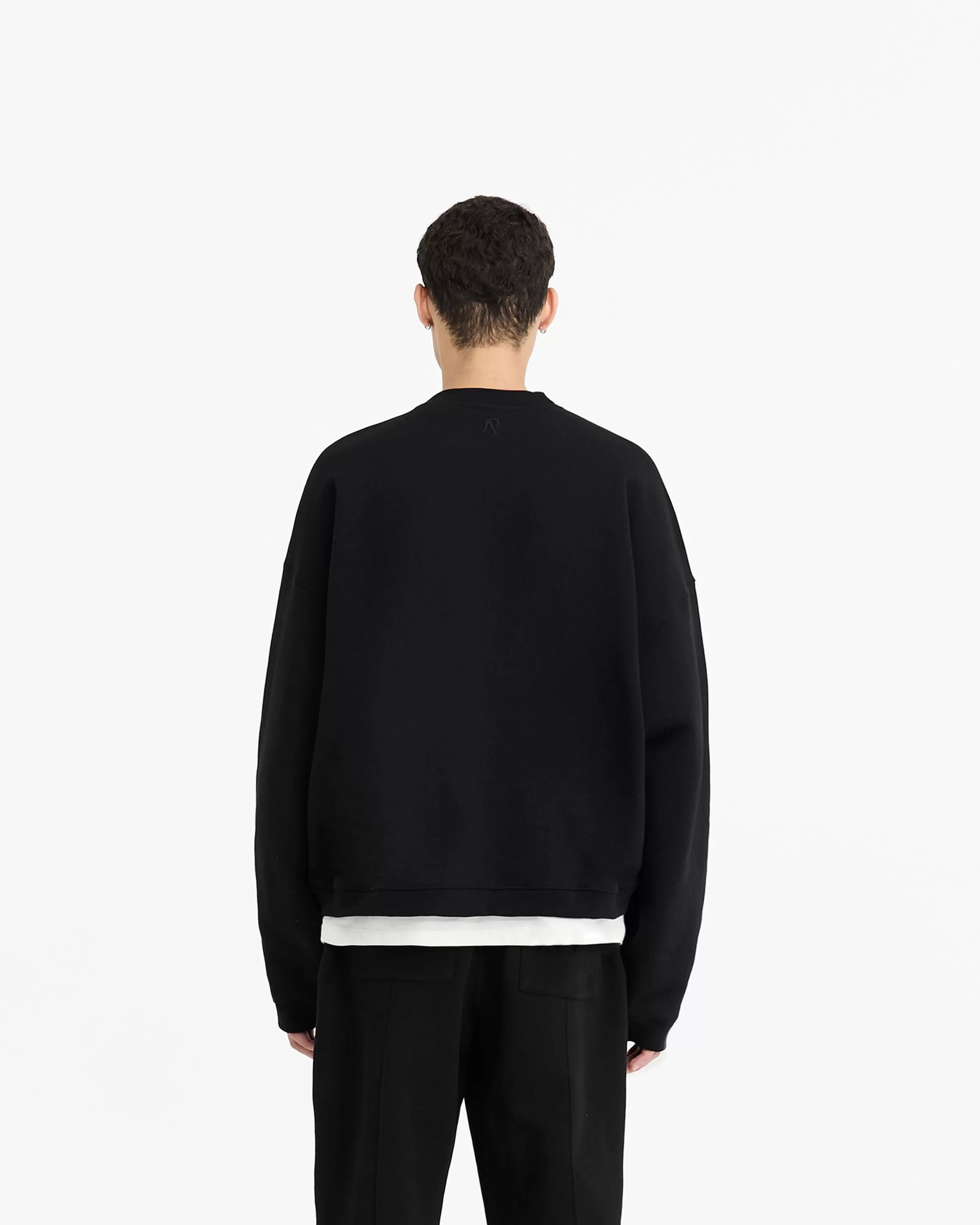 The Initial Boxy Sweater in black is crafted from a heavyweight (500gsm) brushed back fleece cotton. It is a new fit style for the brand, with an oversized u0026amp; boxy fit, falling wide and square with a super cropped body length. The sweater has dropped shoulders and wide sleeves with a 1×1 rib to the cuffs, collar and hem, finished with the Represent metal bar to the hem and embroidered Initial to the back neck. Oversized u0026amp; Boxy Sweater Super Cropped Body Brushed Fleeceback Cotton 1×1 Rib Embroidered Initial u0026amp; Represent Metal Bar Composition: 100% Cotton500gsm Note: Do not hang this garment Model is 187cm and 77kg wearing size MProduct