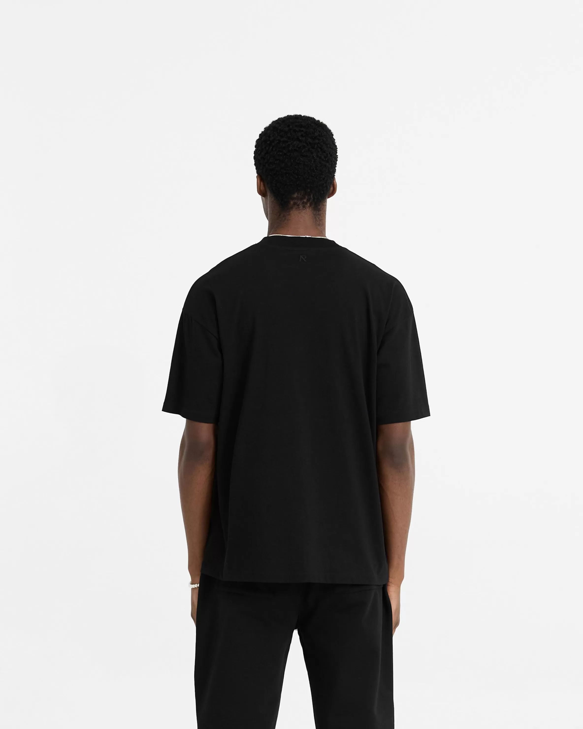 The Initial Oversized T-Shirt in black follows the same fit block as our Owners’ Club t-shirts, with a slightly oversized fit. Crafted from 180gsm jersey cotton. It has a 1×1 small rib to the collar, and is finished with an embroidered Initial to the back neck and Represent metal bar logo to the hem. Black Oversized T-Shirt Owners’ Club Fit 1×1 Rib Embroidered Initial u0026amp; Represent Metal Bar Composition: 100% Cotton180gsm Note: Do not hang this garment Model is 182cm and 73kg wearing size MProduct