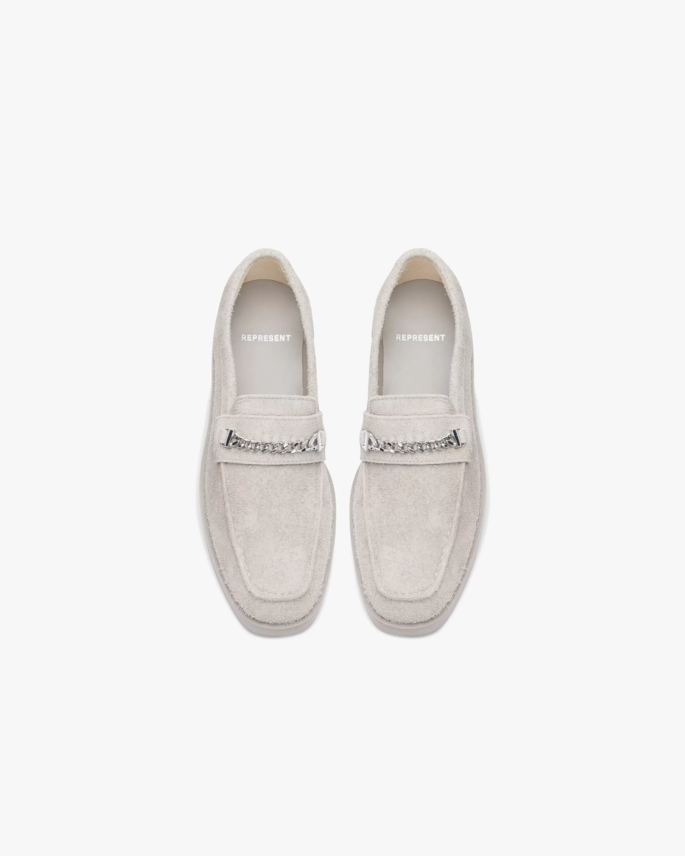 Introducing the Represent Loafer in Cashmere, a luxury square toe shoe crafted with a hairy suede upper, metal chain penny loafer detail to the top and metal Initial pin to the heel. The shoe has leather lining and footbed to reinforce unparalleled comfort. Cashmere Penny Loafer Hairy Suede Upper Metal Chain Penny Loafer Detail Initial Pin to Heel Leather Lining u0026amp; Footbed CompositionUpper: Hairy SuedeLining: LeatherOutsole: Pre-fabricated with EVA slice Product