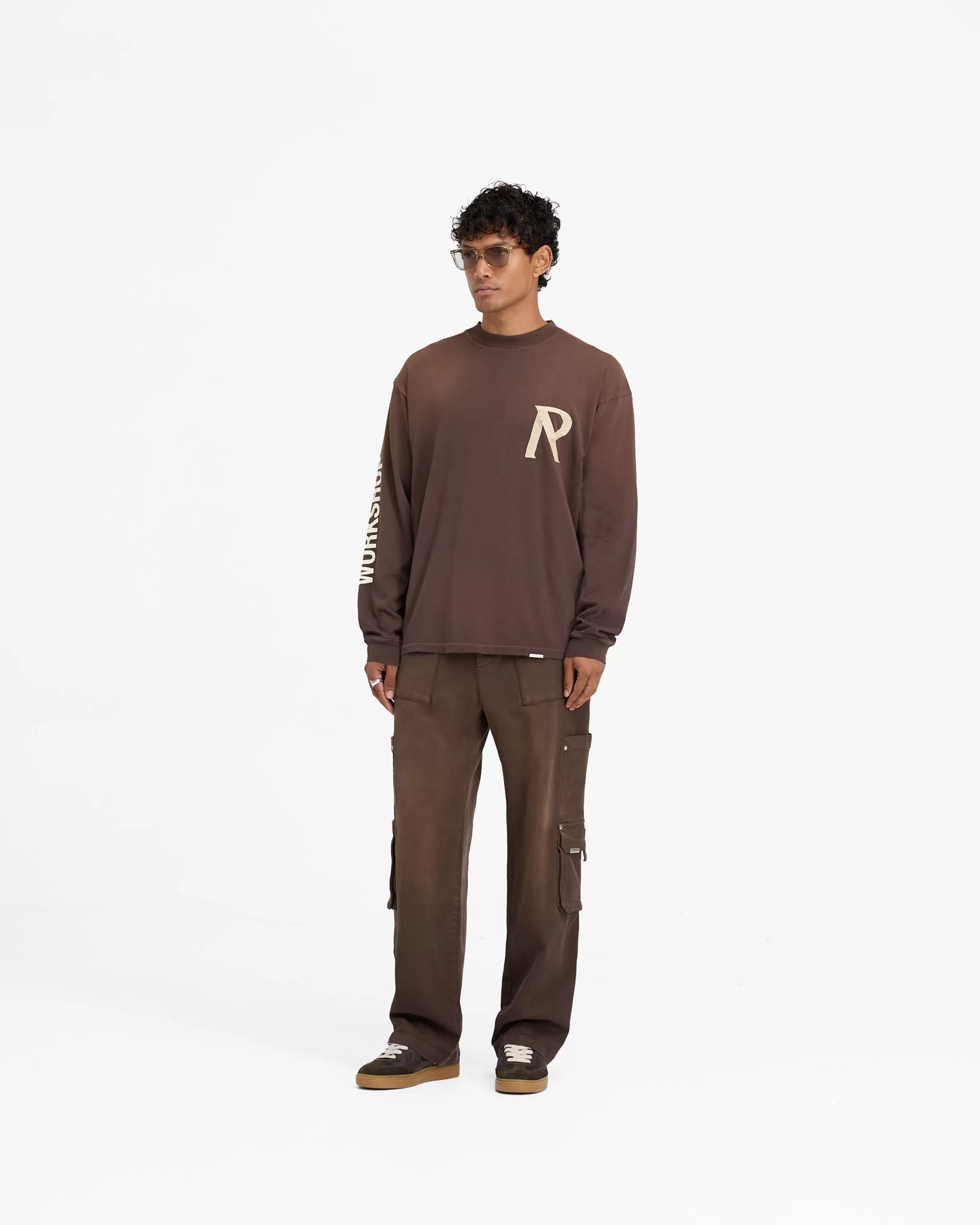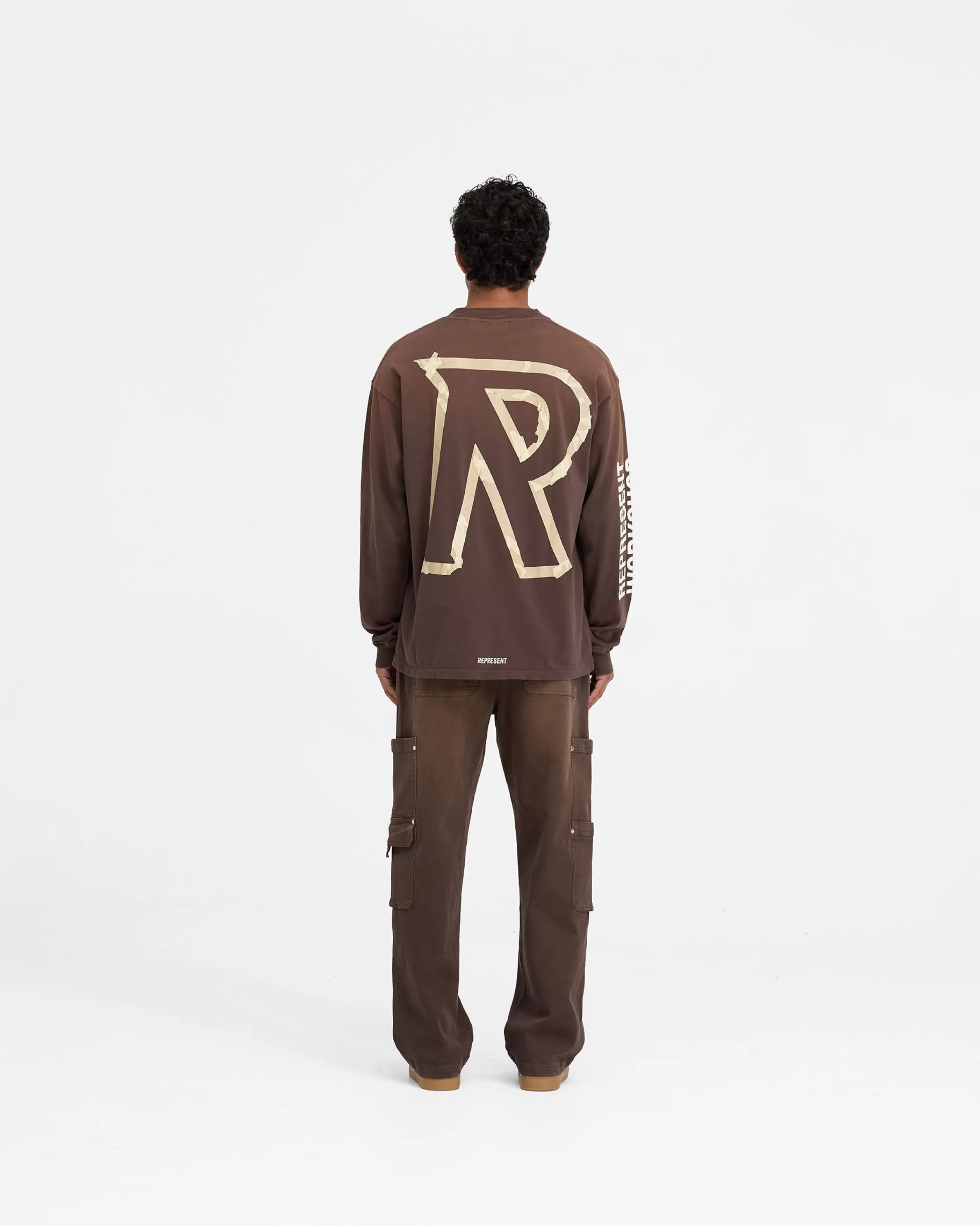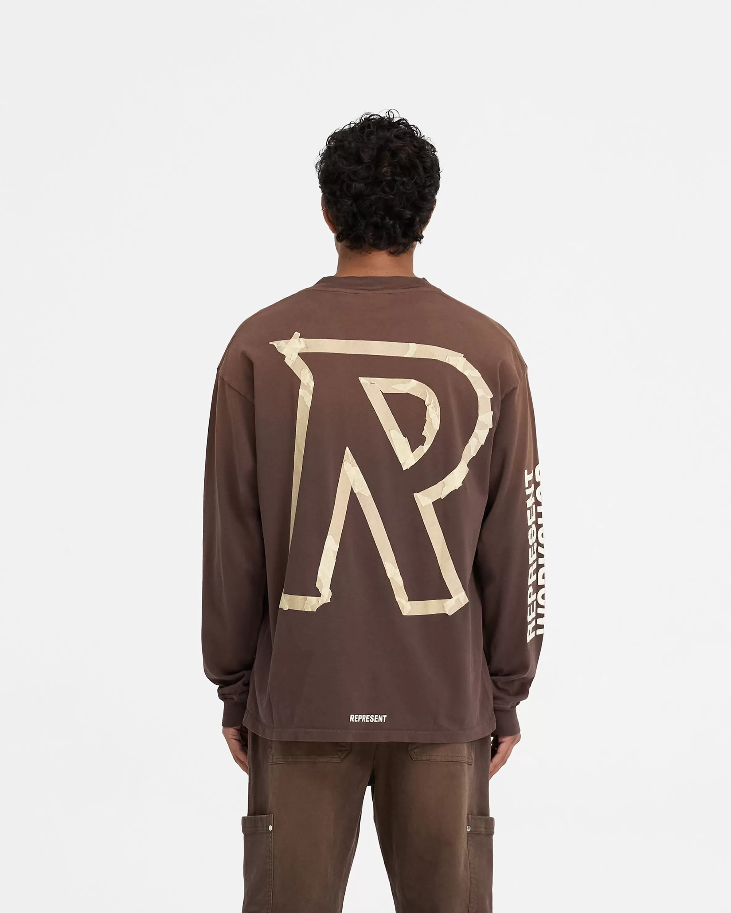 Introducing the Masking Tape Initial Long Sleeve T-Shirt in Cedar, a luxury slightly oversized t-shirt, crafted from medium weight jersey cotton. The t-shirt showcases a 3D masking tape effect Initial to the front and back, with a cracked print to the sleeve. It has a corrosion vintage spray applied to the fabric, creating a vintage hue to the hoodie, finished with a Represent metal bar to the hem. Cedar Long Sleeve T-Shirt Slightly Oversized 3D Masking Tape Effect Initial Cracked Print to Sleeve Corrosion Vintage Spray Represent Metal Bar Logo Composition: 100% Cotton Product Care: Mild wash inside out at 30 degrees celsius. Hang dry in shade. Do not bleach, dry clean, or tumble dry. Loss of cracked ink may occur with wash and wear Model is 188cm and 75kg wearing size MProduct