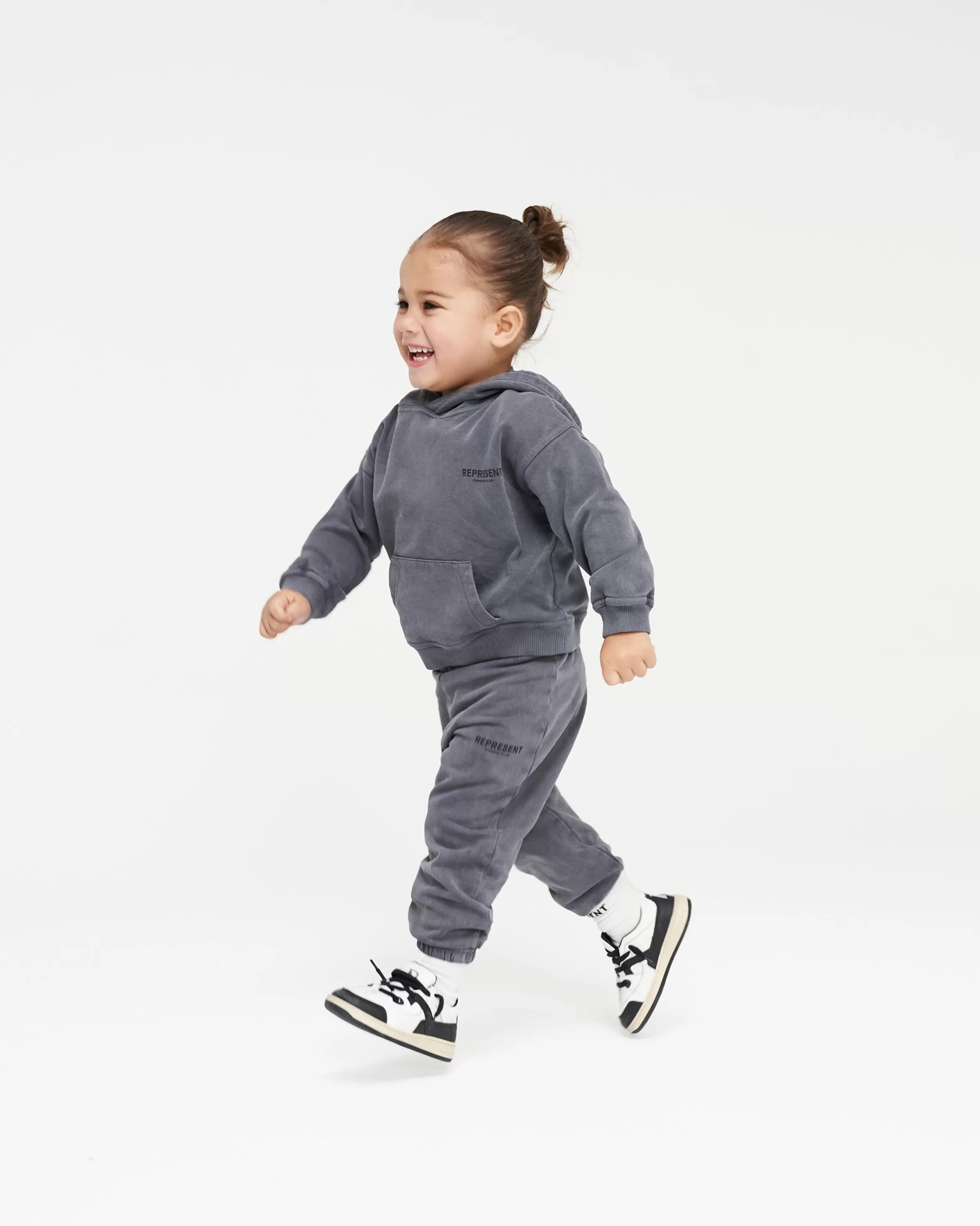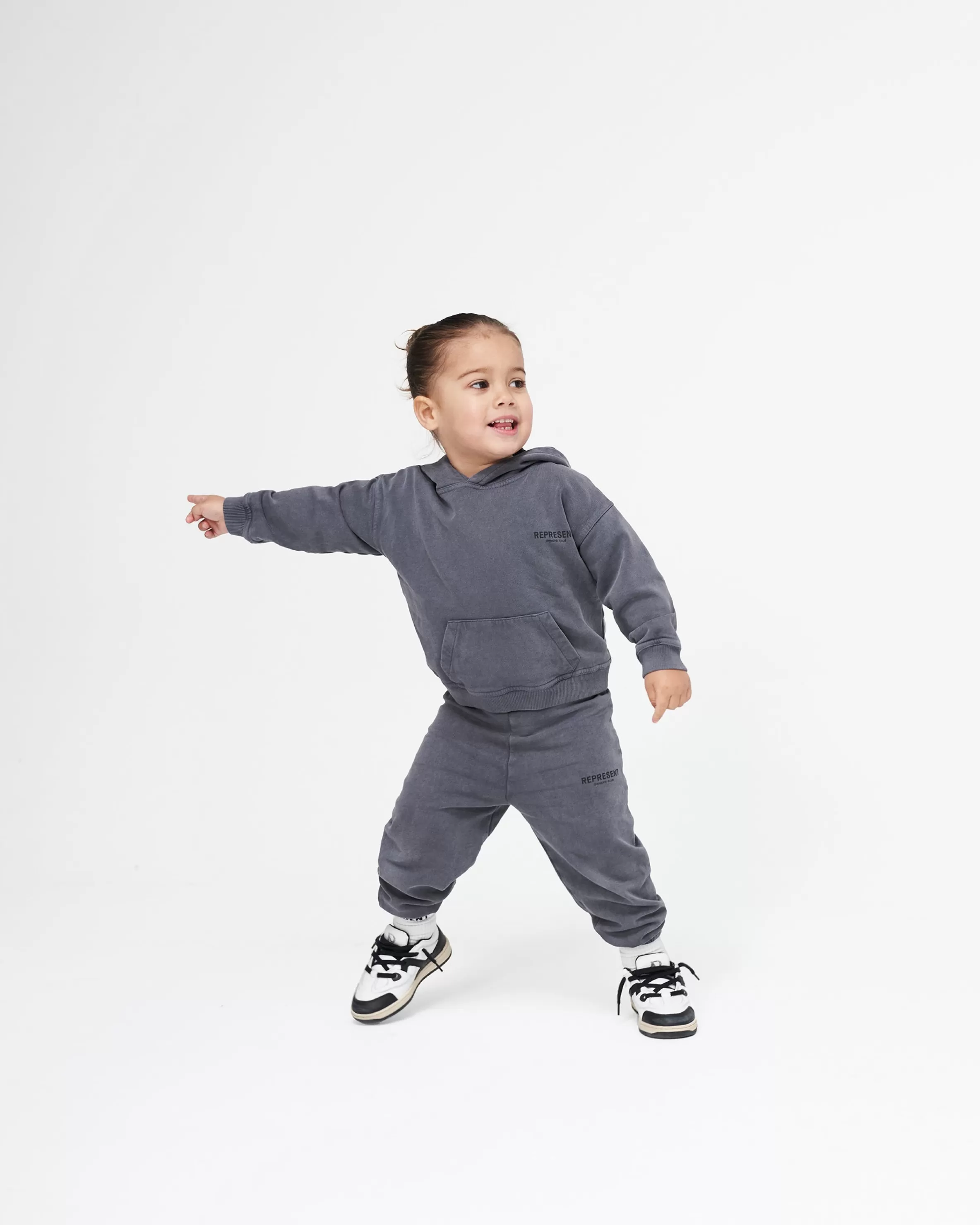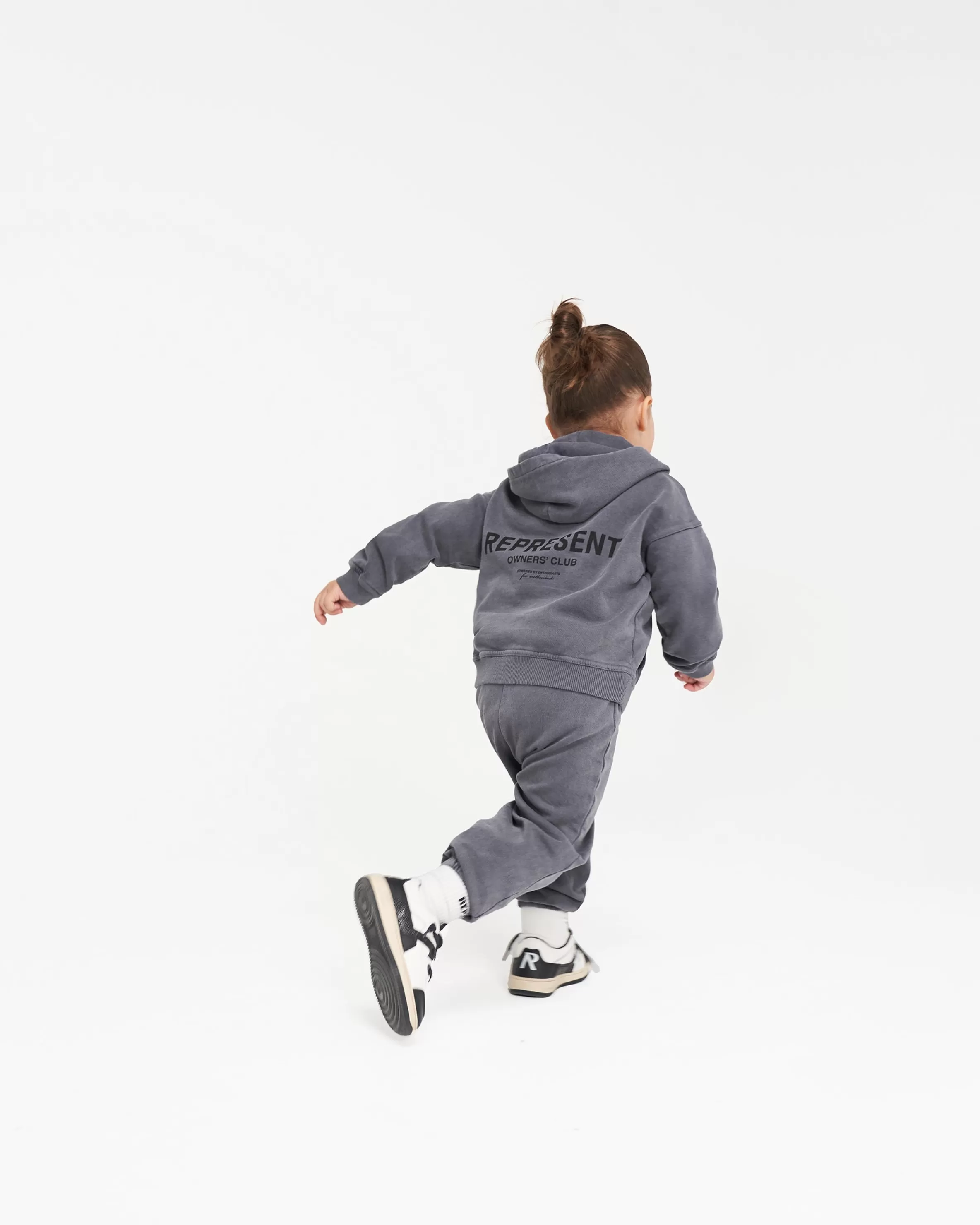 Introducing the Mini Owners’ Club Hoodie in Storm, crafted from heavy weight jersey cotton with a slightly oversized fit. The hoodie features ribbed hems and cuffs and is finished with Represent Owners’ Club branding to the chest and back.The wash on this hoodie is a pigment wash, an intensive process of taking pieces constructed with no colouring, and manually dying post-formation. The infusion of fabric and pigment ushers to propel the garments to a degree of unparalleled richness; a visual symphony of depth and texture, with dye accrued around areas such as seams, hem and hood, creating an illusion of natural fade on base elements of the clothing. Storm Kids Hoodie Oversized fit Ribbed trims Owners’ Club Branding Composition: 100% Cotton Made in PortugalProduct