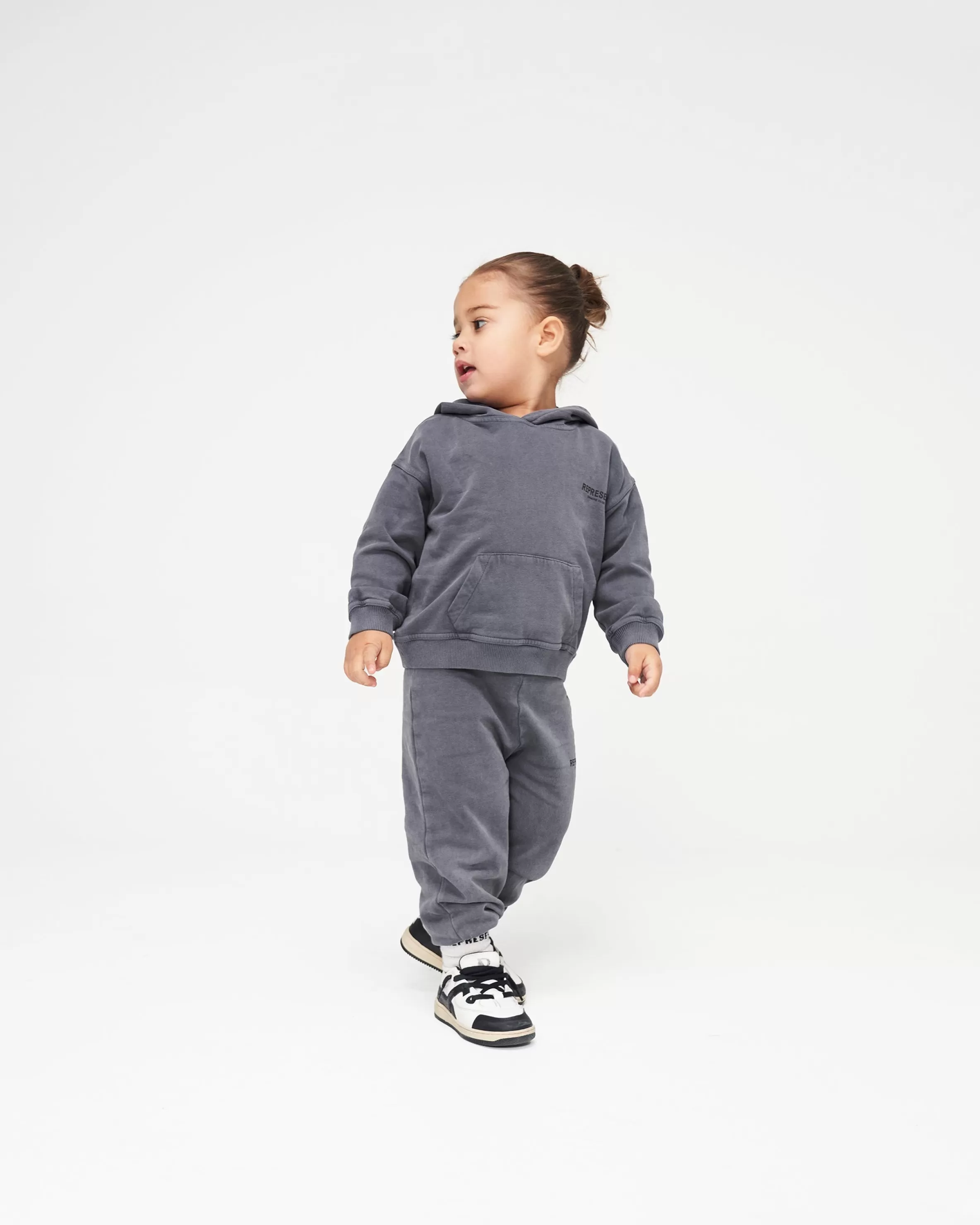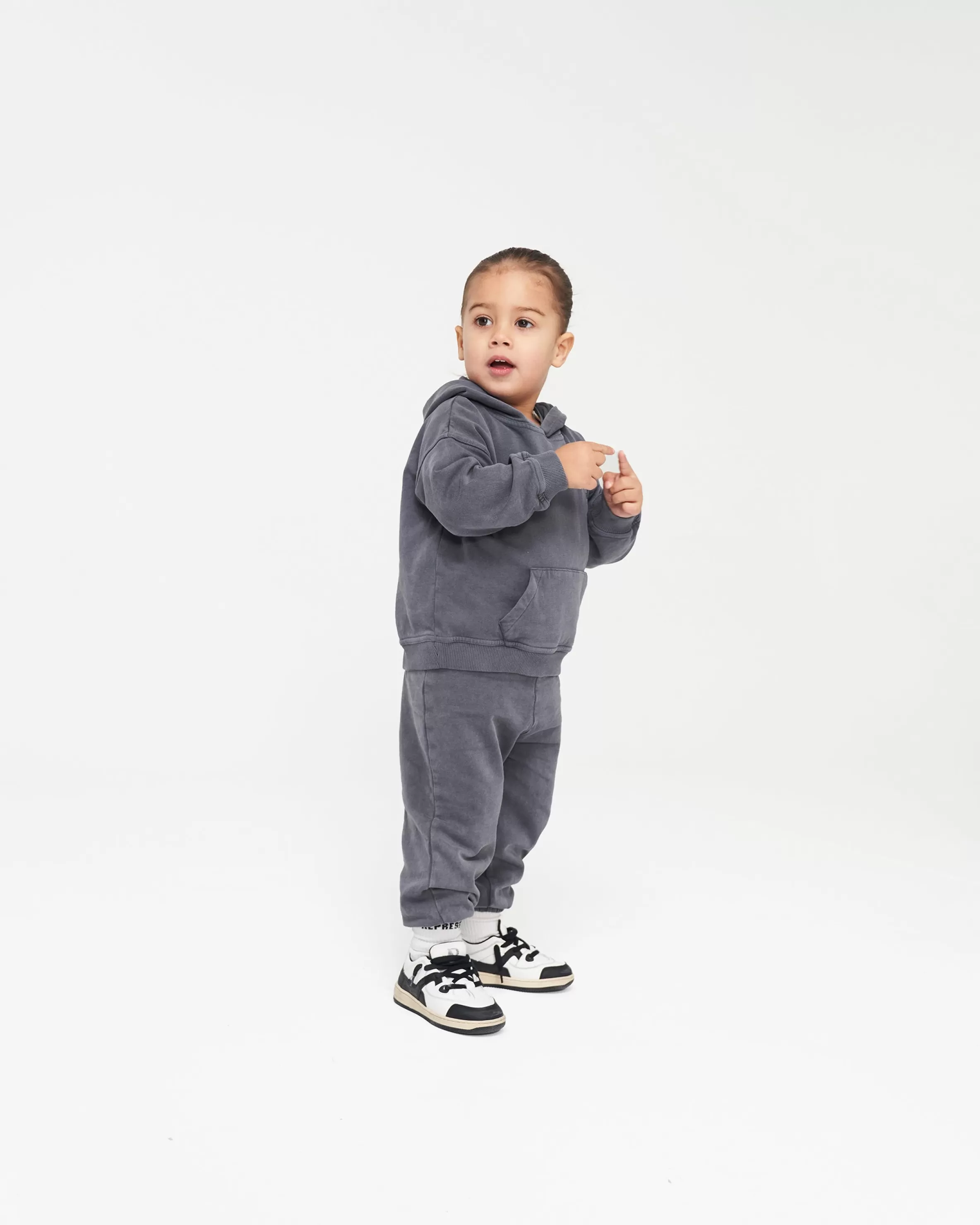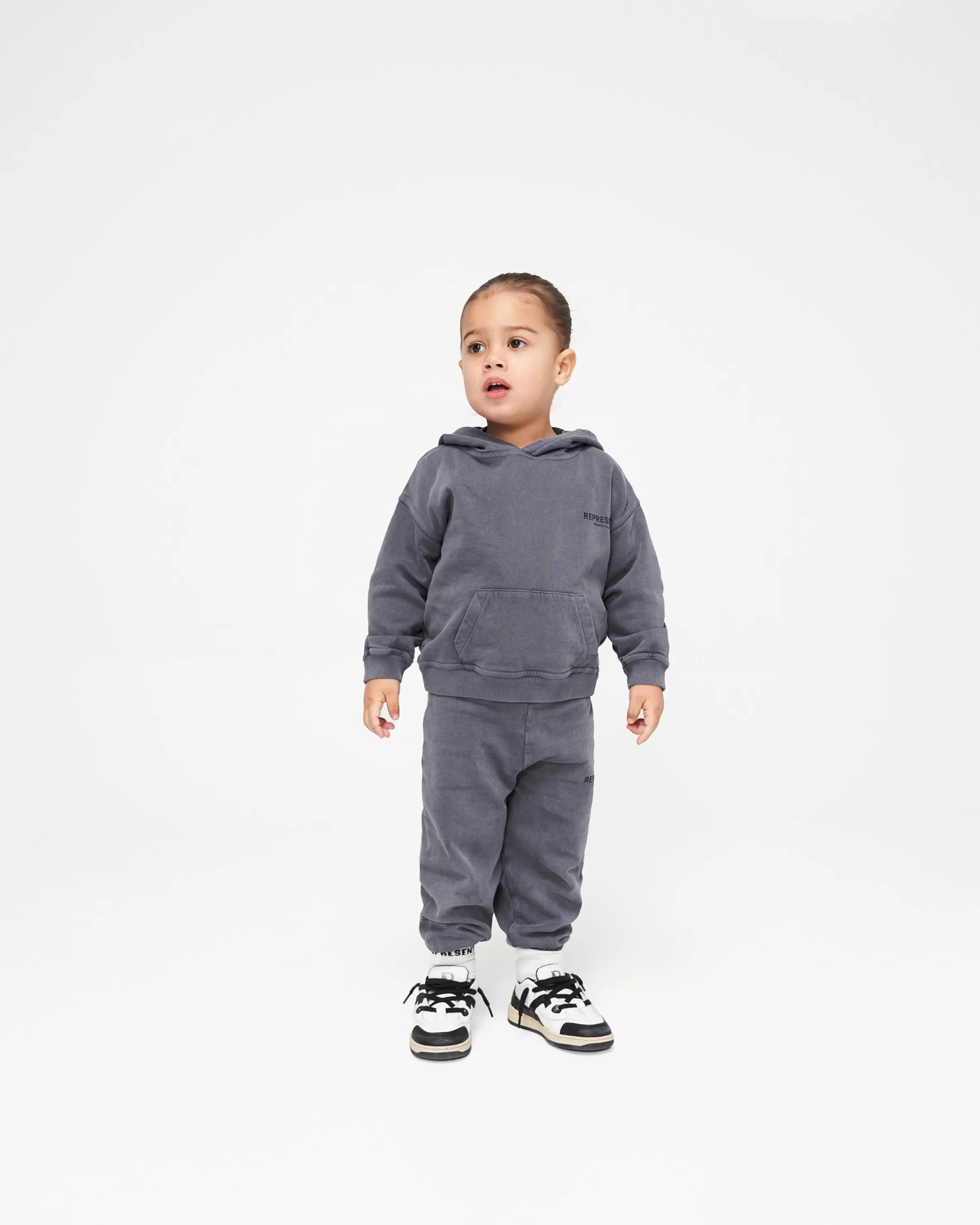 Introducing the Mini Owners’ Club Hoodie in Storm, crafted from heavy weight jersey cotton with a slightly oversized fit. The hoodie features ribbed hems and cuffs and is finished with Represent Owners’ Club branding to the chest and back.The wash on this hoodie is a pigment wash, an intensive process of taking pieces constructed with no colouring, and manually dying post-formation. The infusion of fabric and pigment ushers to propel the garments to a degree of unparalleled richness; a visual symphony of depth and texture, with dye accrued around areas such as seams, hem and hood, creating an illusion of natural fade on base elements of the clothing. Storm Kids Hoodie Oversized fit Ribbed trims Owners’ Club Branding Composition: 100% Cotton Made in PortugalProduct