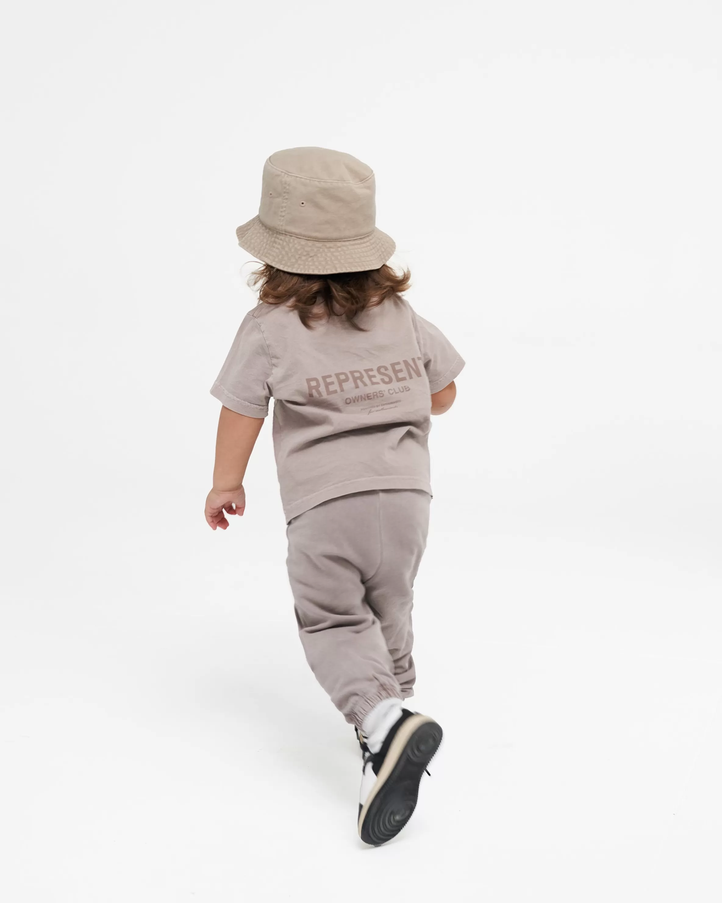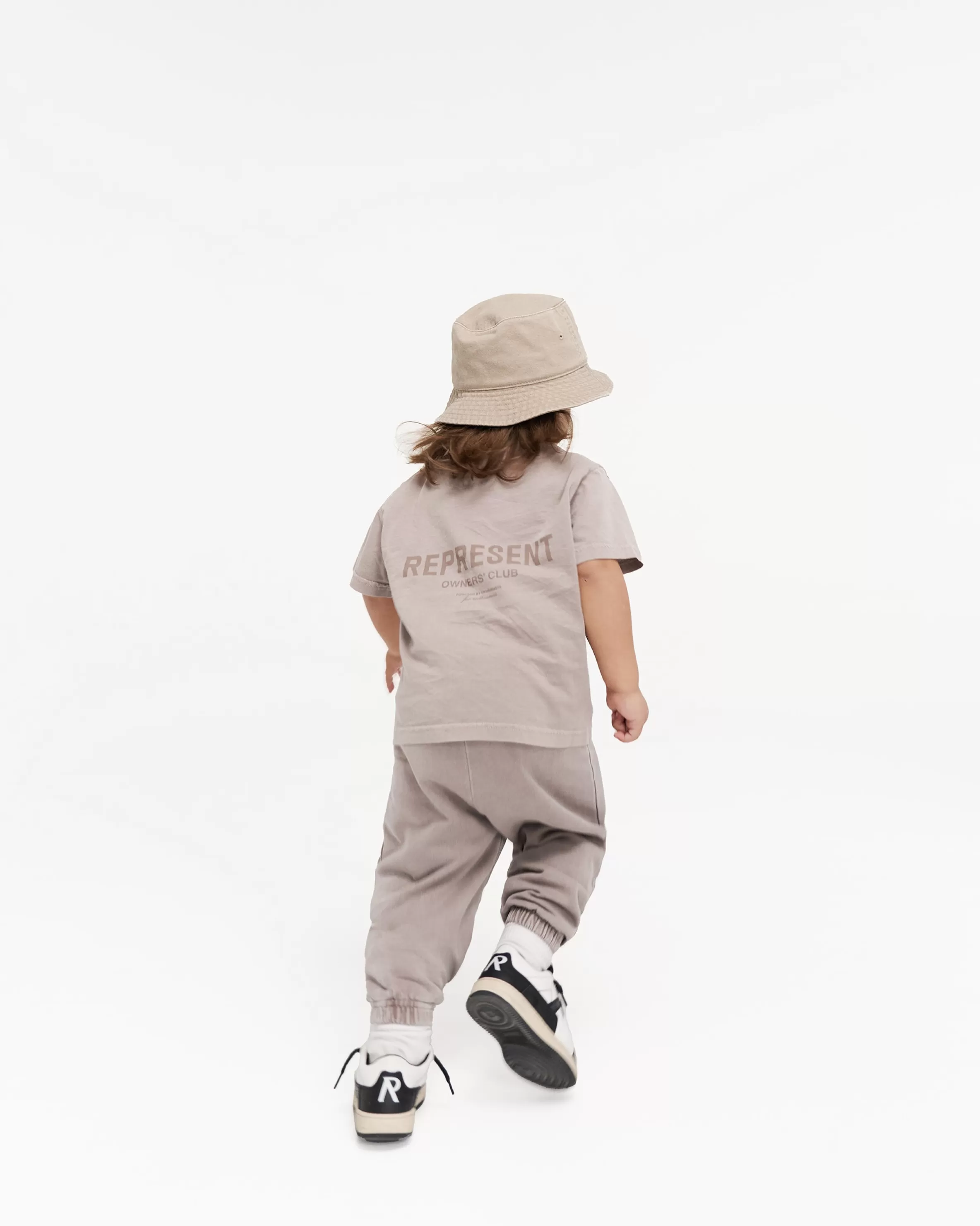 Introducing the Mini Owners’ Club Sweatpants in Mushroom. Based on our bestselling Owners’ Club Sweatpants, these children’s joggers are crafted with a relaxed silhouette in heavy fleeceback jersey cotton. They have an elasticated waistband and elasticated cuffs, and feature our Owners’ Club logo printed to the leg.The wash on these sweatpants is a pigment wash, an intensive process of taking pieces constructed with no colouring, and manually dying post-formation. The infusion of fabric and pigment ushers to propel the garments to a degree of unparalleled richness; a visual symphony of depth and texture, with dye accrued around areas such as seams and waistband, creating an illusion of natural fade on base elements of the clothing. Mushroom Sweatpants for Kids Elasticated Waistband Elasticated Cuffs Owners’ Club Branding Composition: 100% CottonProduct