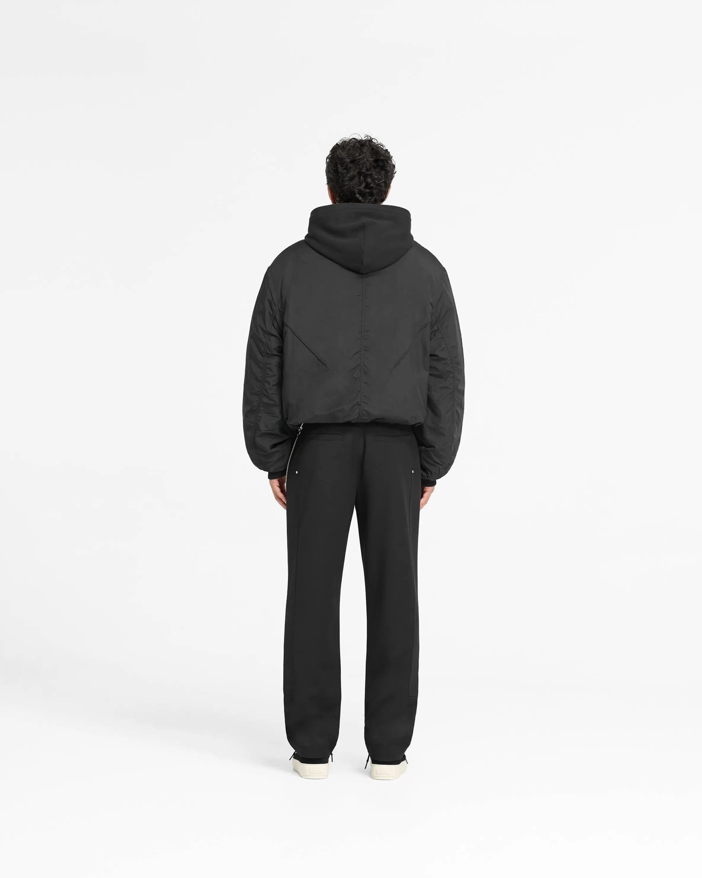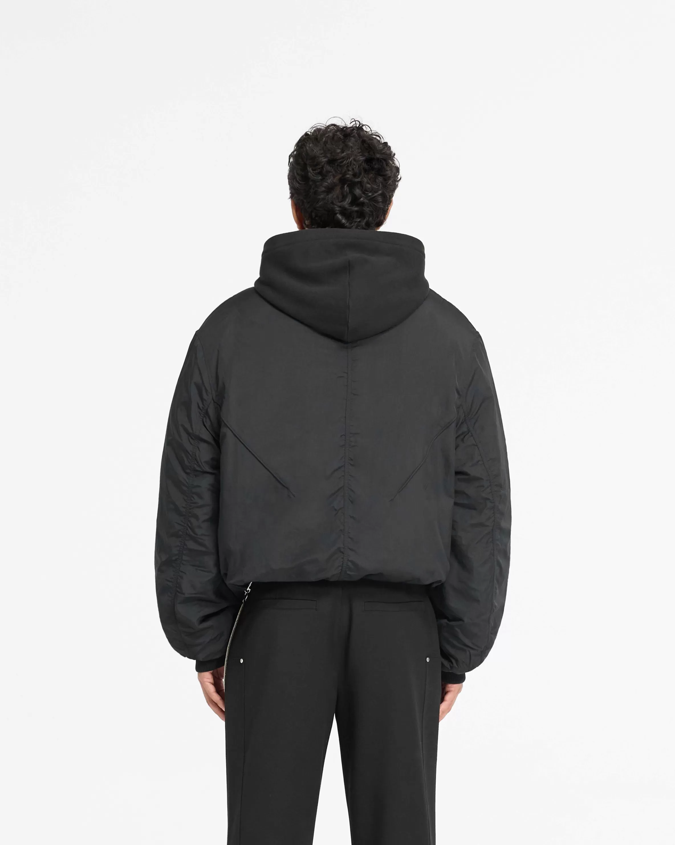 Introducing the Jersey Hood Bomber in Black, an oversized bomber silhouette with a nylon body, complemented with metal R…
