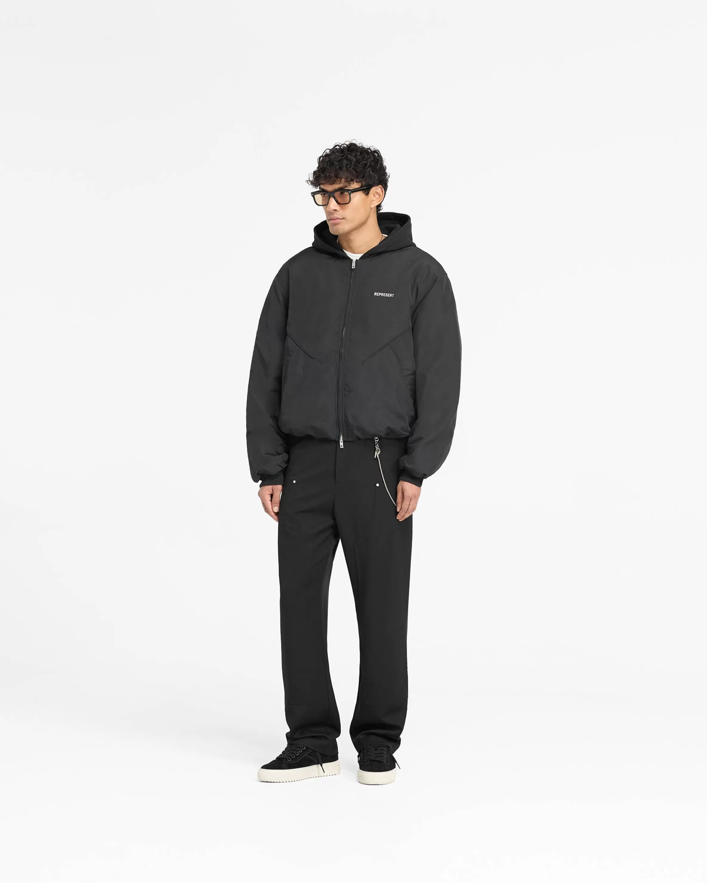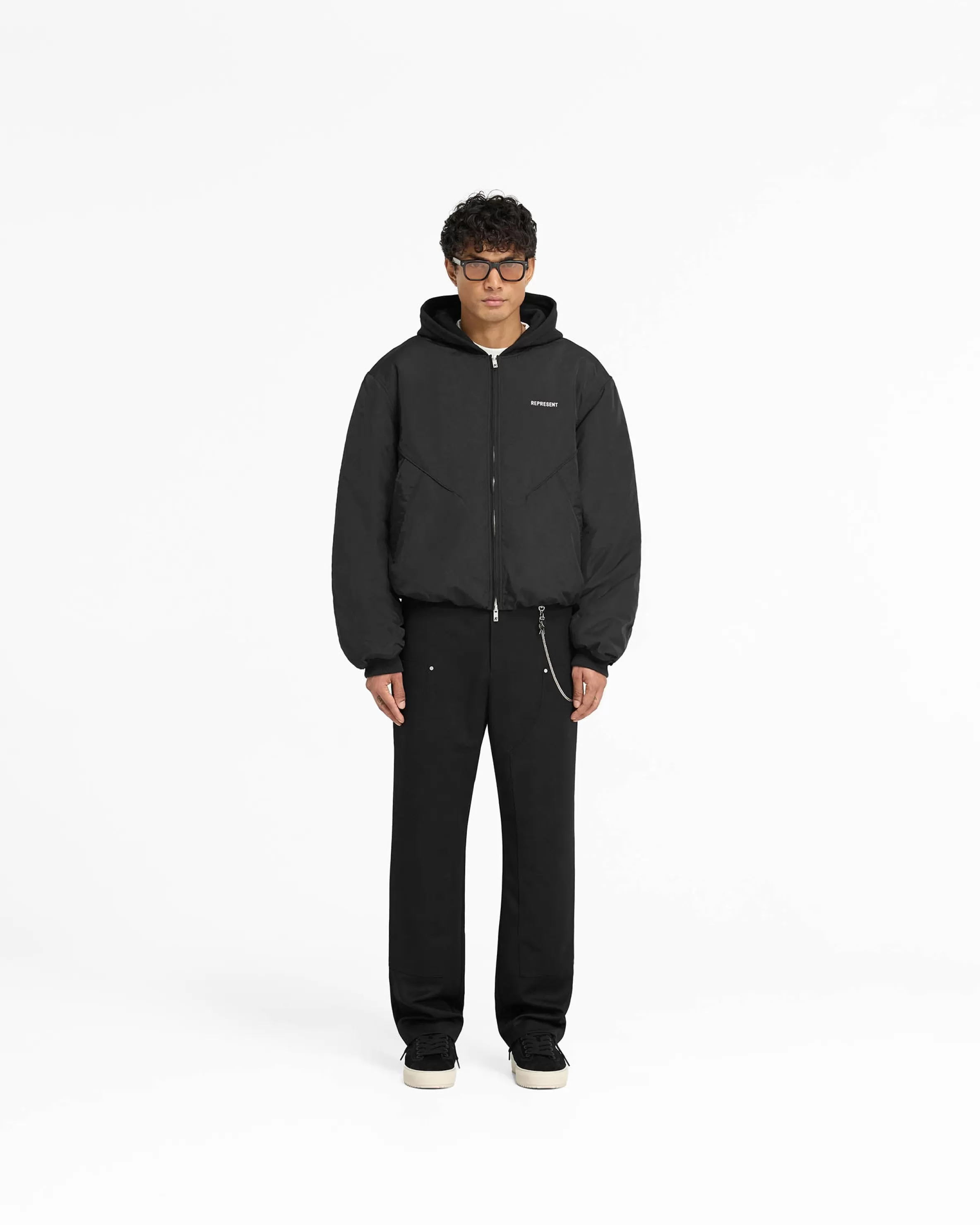 Introducing the Jersey Hood Bomber in Black, an oversized bomber silhouette with a nylon body, complemented with metal Represent lettering to the chest, and further details such as a gathered centre back seam, with an adjustable bungee cord hem and zip guard to the front, with a double ended front zip closure. It has angled seams to the front and welt pockets. The bomber is finished with Represent jacquard lining a soft jersey hood. Jersey Hooded Bomber Black Oversized Gathered Centre Back Seam Welt Pockets Adjustable Bungee Cord to Hem Double Front Zip Closure Metal Represent Lettering Composition: Body: 100% NylonHood: 100% CottonLining: 55% Polyester,Rib: 98% Polyester, 2% Elastane Product Care: Gentle machine wash at 30 degrees celsius. Do not bleach, tumble dry or dry clean. Iron on Reverse. Model is 188cm and 75kg wearing size MProduct