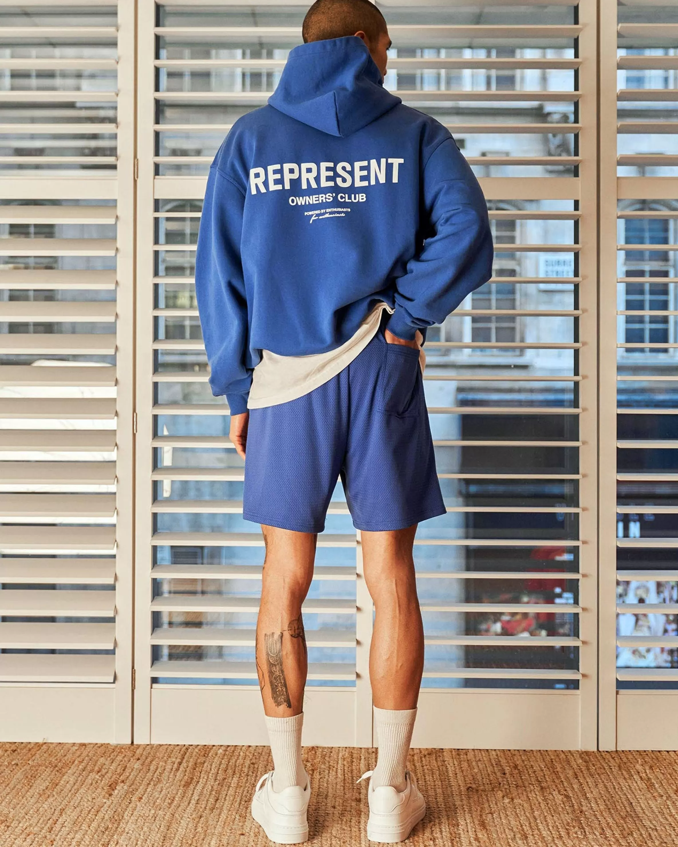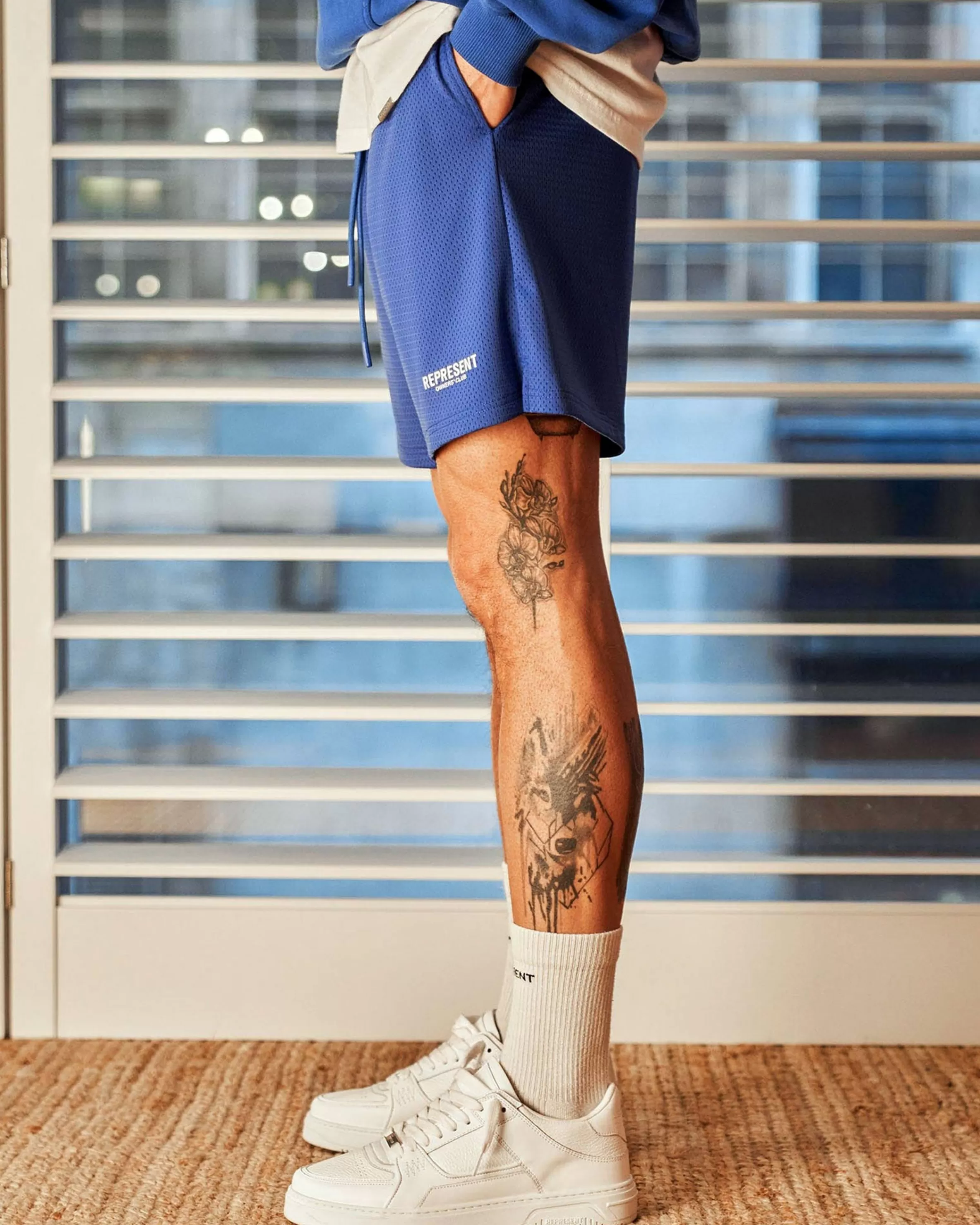 Represent Owners Club relaxed fit cobalt blue mesh shorts. Welt pockets u0026amp; an elasticated waist with draw cords….