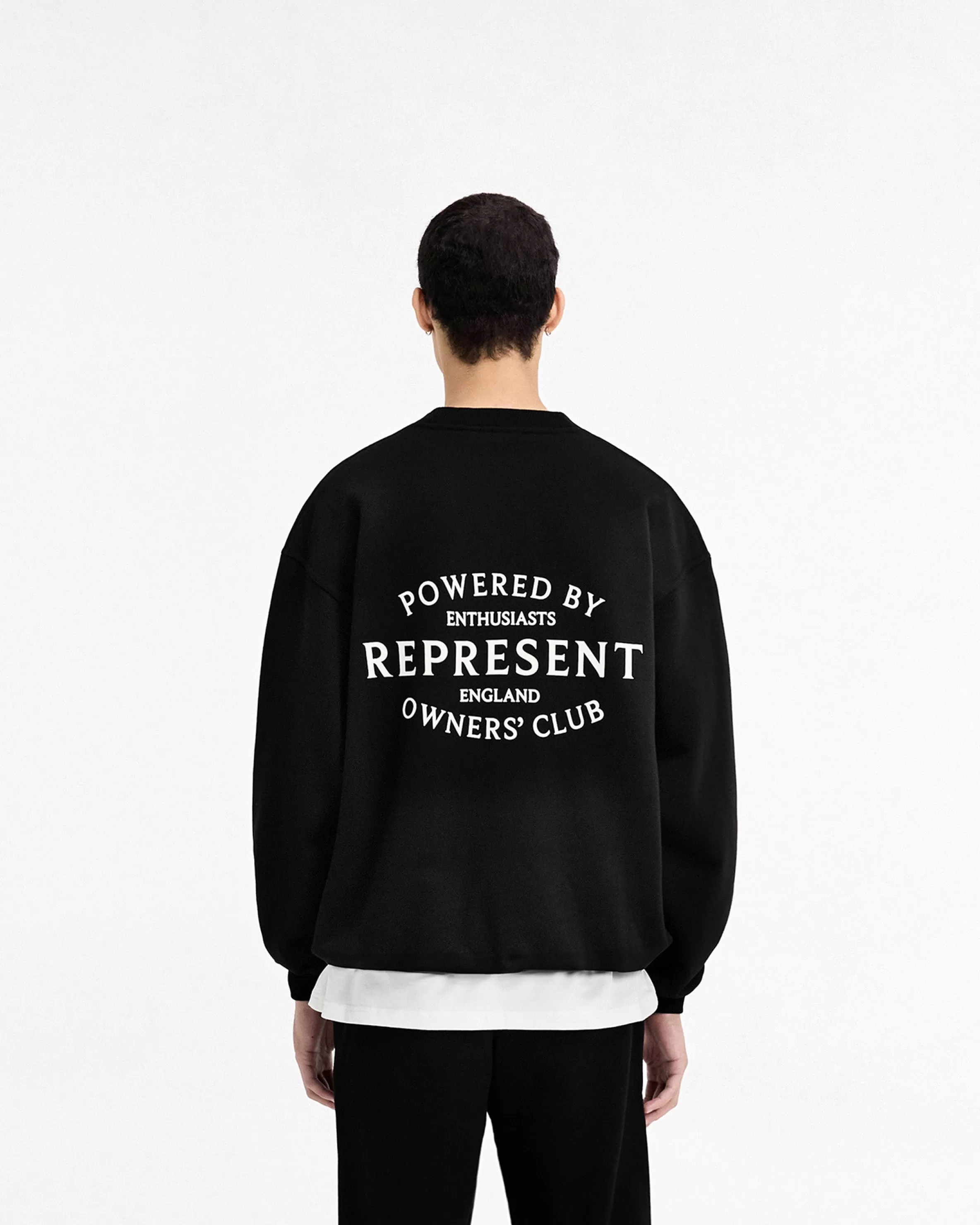 Introducing the Represent Owners’ Club Stamp Sweater in Jet Black, a clean and refreshed take on the classic Owners’ Club Sweater. Crafted from a heavy weight jersey cotton, with a slightly oversized fit, the sweater has a ribbed collar, hem and cuffs. It has our Represent metal bar logo to the hem, finished with our high build screen printed Stamp Owners’ Club branding to the chest and back. Jet Black Sweater Slightly Oversized Fit Ribbed Hem, Collar u0026amp; Cuffs High Build Branding Metal Bar Logo Composition: 100% Cotton480gsm Model is 187cm and 77kg wearing size MProduct