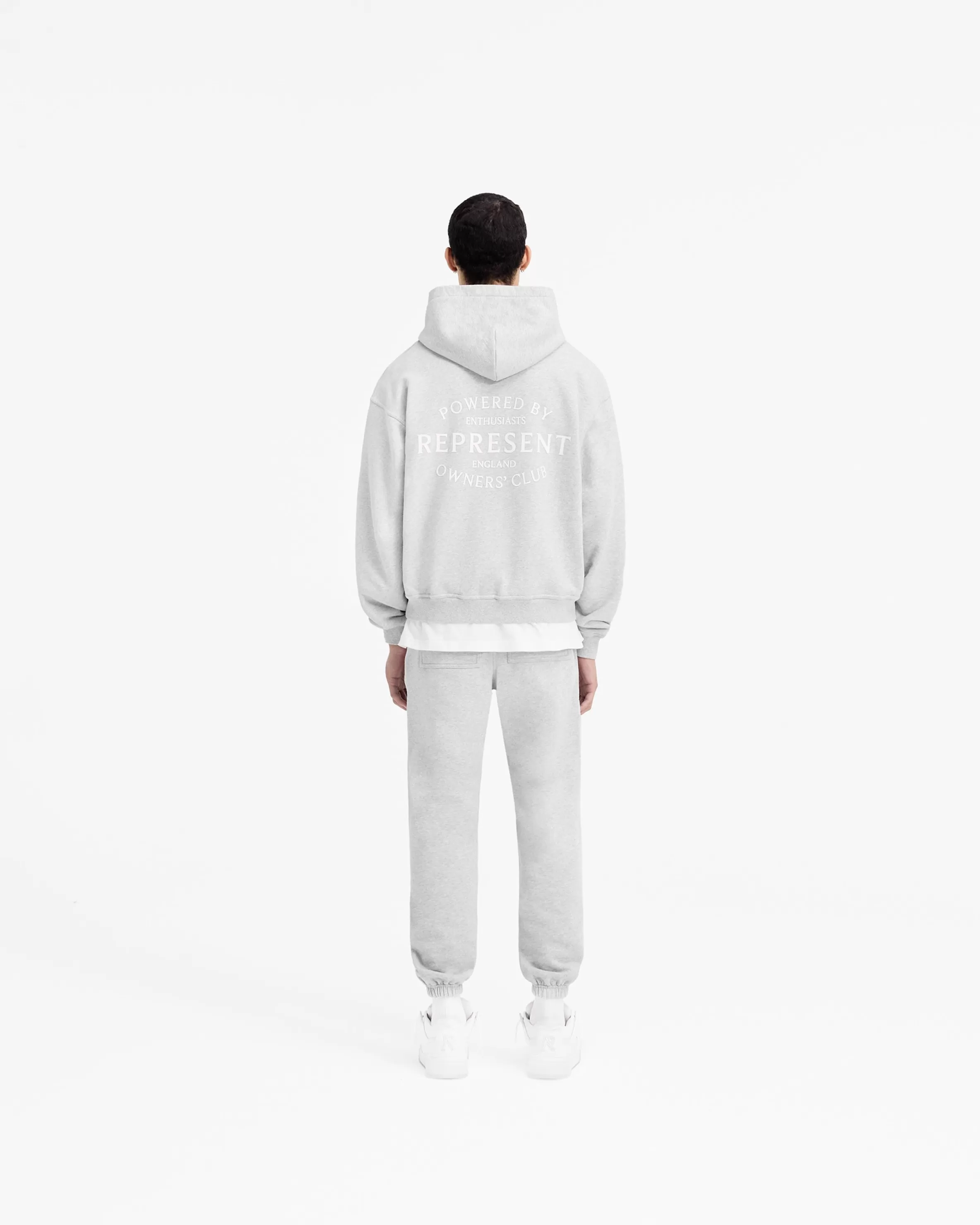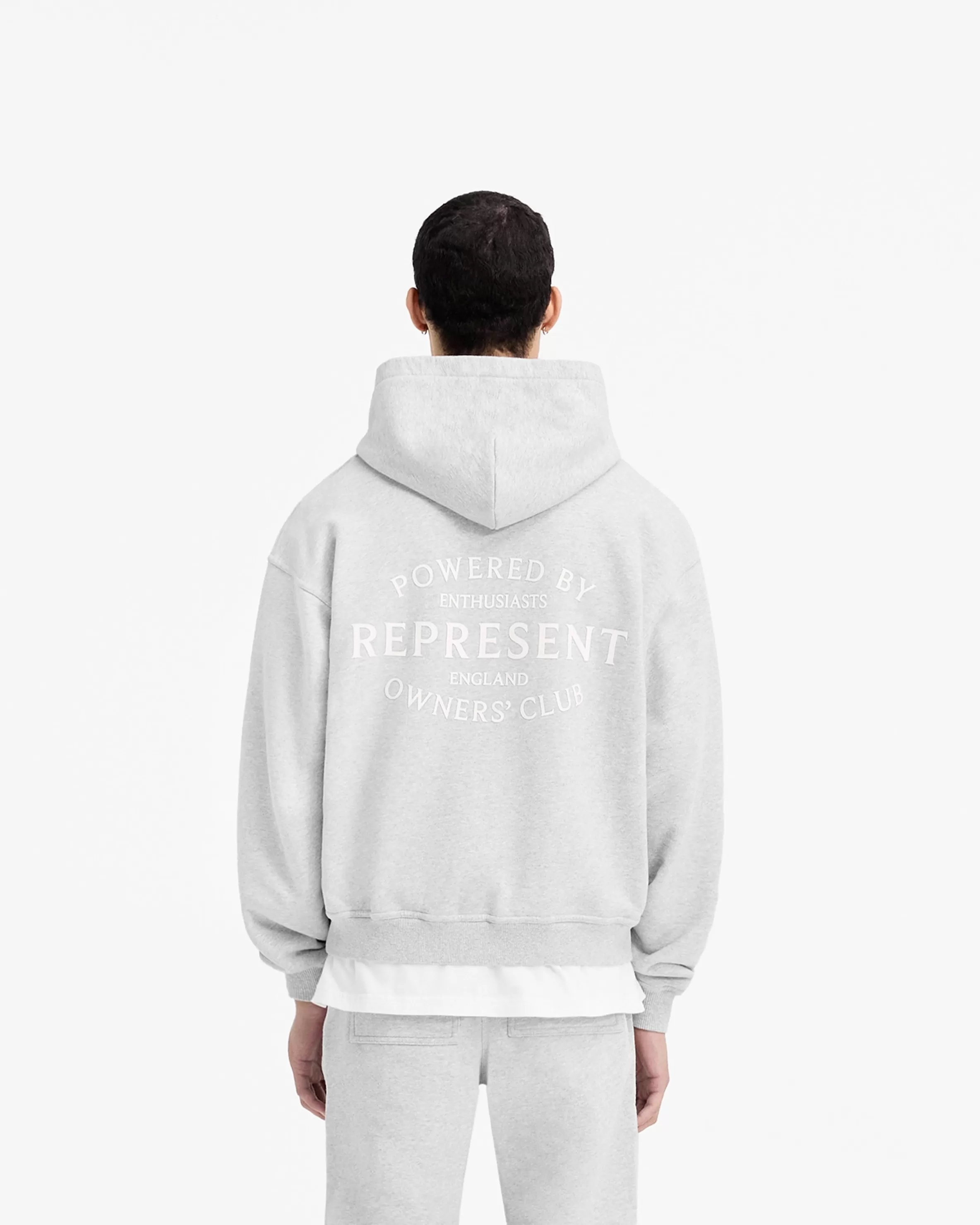 Introducing the Represent Owners’ Club Stamp Zip Up Hoodie in Ash Grey, a clean and refreshed take on the classic Owners’ Club Hoodie. Crafted from a heavy weight jersey cotton with a slightly oversized fit, the hoodie has a ribbed hem and cuffs, with a double ended RiRi zip to the front, and Represent metal bar logo to the pocket. It features our high build screen printed Stamp Owners’ Club branding to the chest and back. Ash Grey Zip Up Hoodie Slightly Oversized Fit Ribbed Hem u0026amp; Cuffs RiRi Double Ended Zip High Build Branding Metal Bar Logo Composition: 100% Cotton480gsm Model is 187cm and 77kg wearing size MProduct