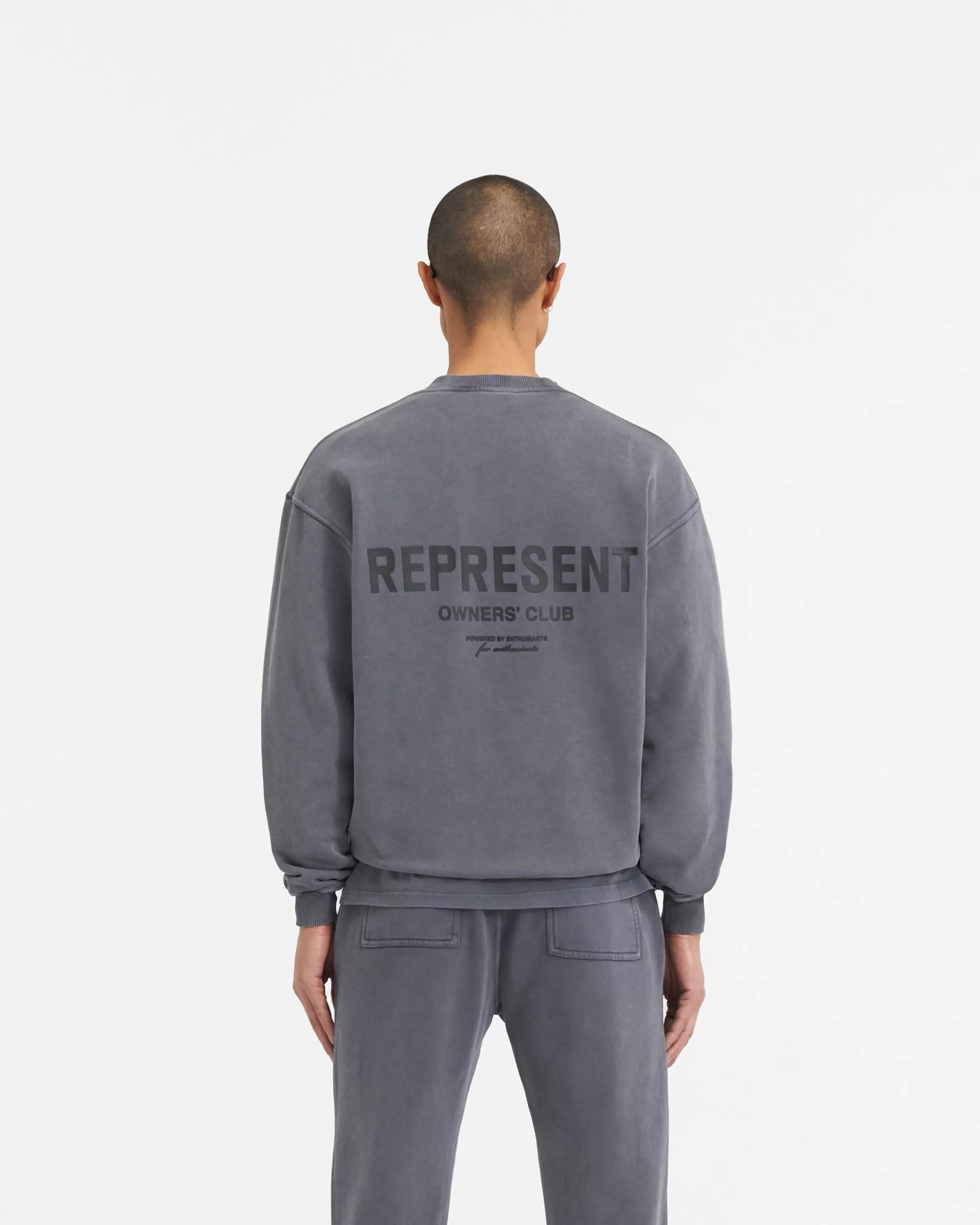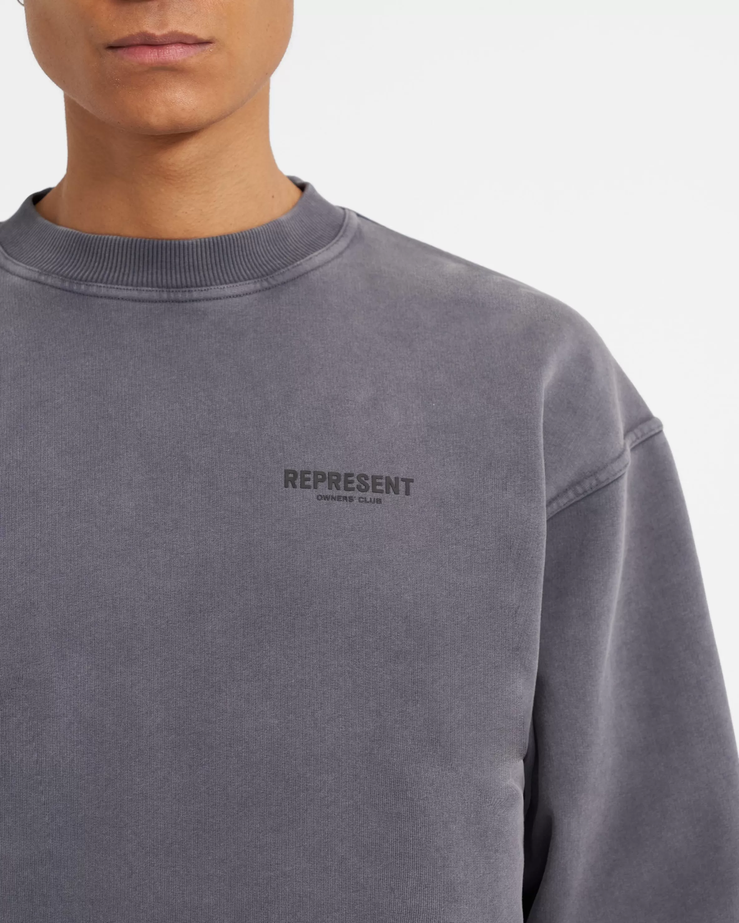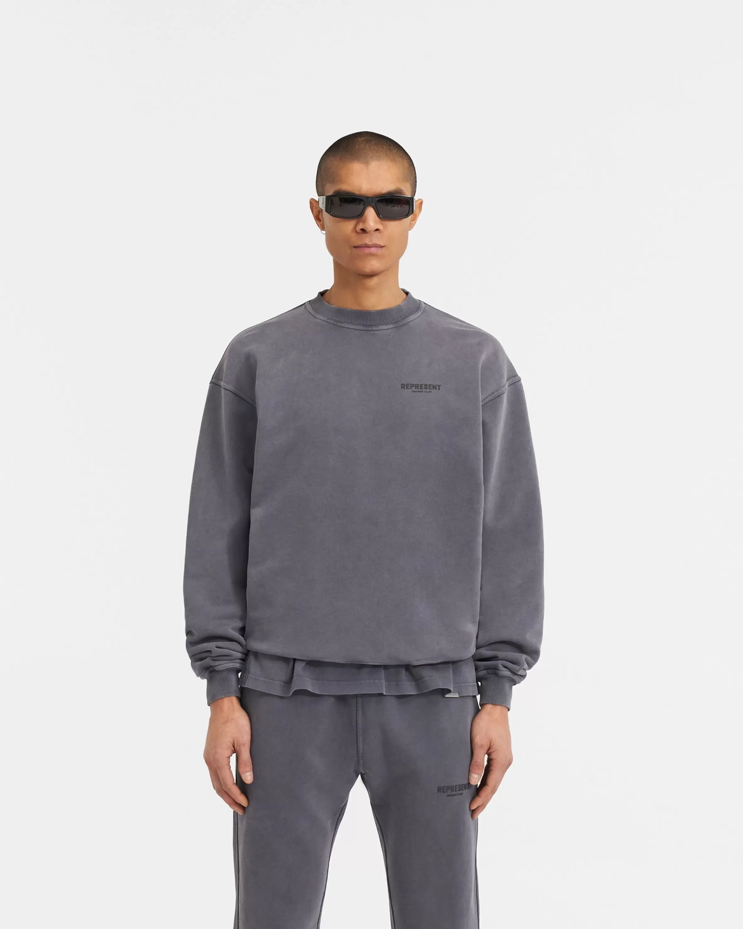 This item purchased in the Black Friday Sale is final sale and cannot be returned or exchanged. Introducing the Represent Owners’ Club Sweater in Storm, crafted with a slightly oversized fit in a heavy weight jersey cotton. The sweater has ribbed hem u0026amp; cuffs, with high build Owners’ Club print to the chest u0026amp; back. It is finished with a Represent metal bar to the hem. The wash on this sweater is a pigment wash, an intensive process of taking pieces constructed with no colouring, and manually dying post-formation. The infusion of fabric and pigment ushers to propel the garments to a degree of unparalleled richness; a visual symphony of depth and texture, with dye accrued around areas such as the seams and hem, creating an illusion of natural fade on base elements of the clothing. Storm Sweater Oversized Fit Crewneck Sweater Loopback Jersey Ribbed Trims High Build Branding Composition: 100% Cotton480gsmModel is 187cm and 76kg wearing size MediumMade in PortugalProduct