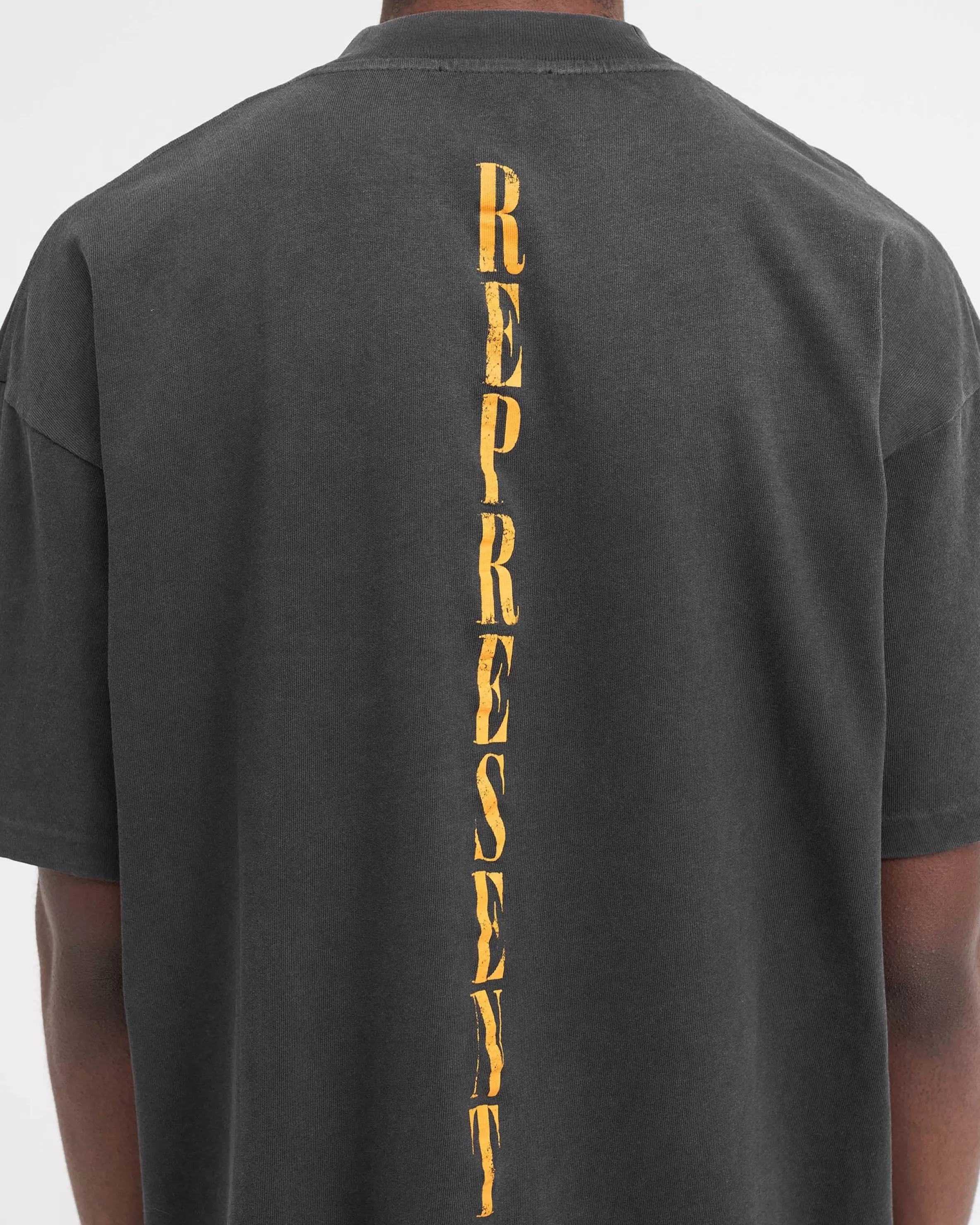 Reborn: a moment of resurgence, where the end evolves to a new beginning. Introducing the Reborn T-Shirt in Aged Black, a t-shirt crafted from luxury medium weight cotton, with a slightly oversized fit. It features our Reborn graphic to the front and Represent down the spine. The Reborn T-Shirt graphic carries inspirations from classic rock music. The design is formed from a beautiful composition of blended colours, with a slight distressing to the graphic itself. Aged Black T-Shirt Oversized Fit Round Neck Short Sleeves Reborn Graphic Composition: 100% Cotton220gsm Product