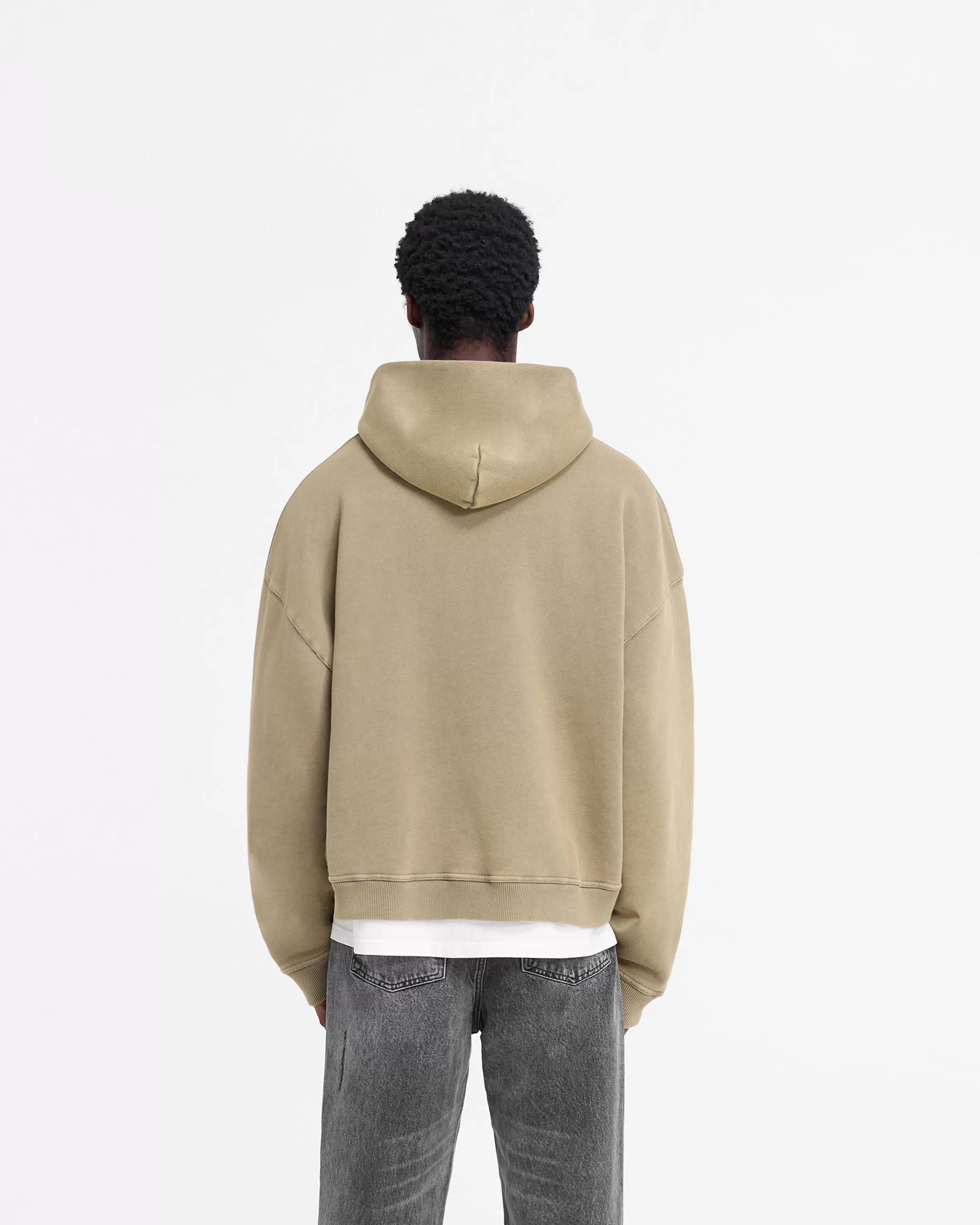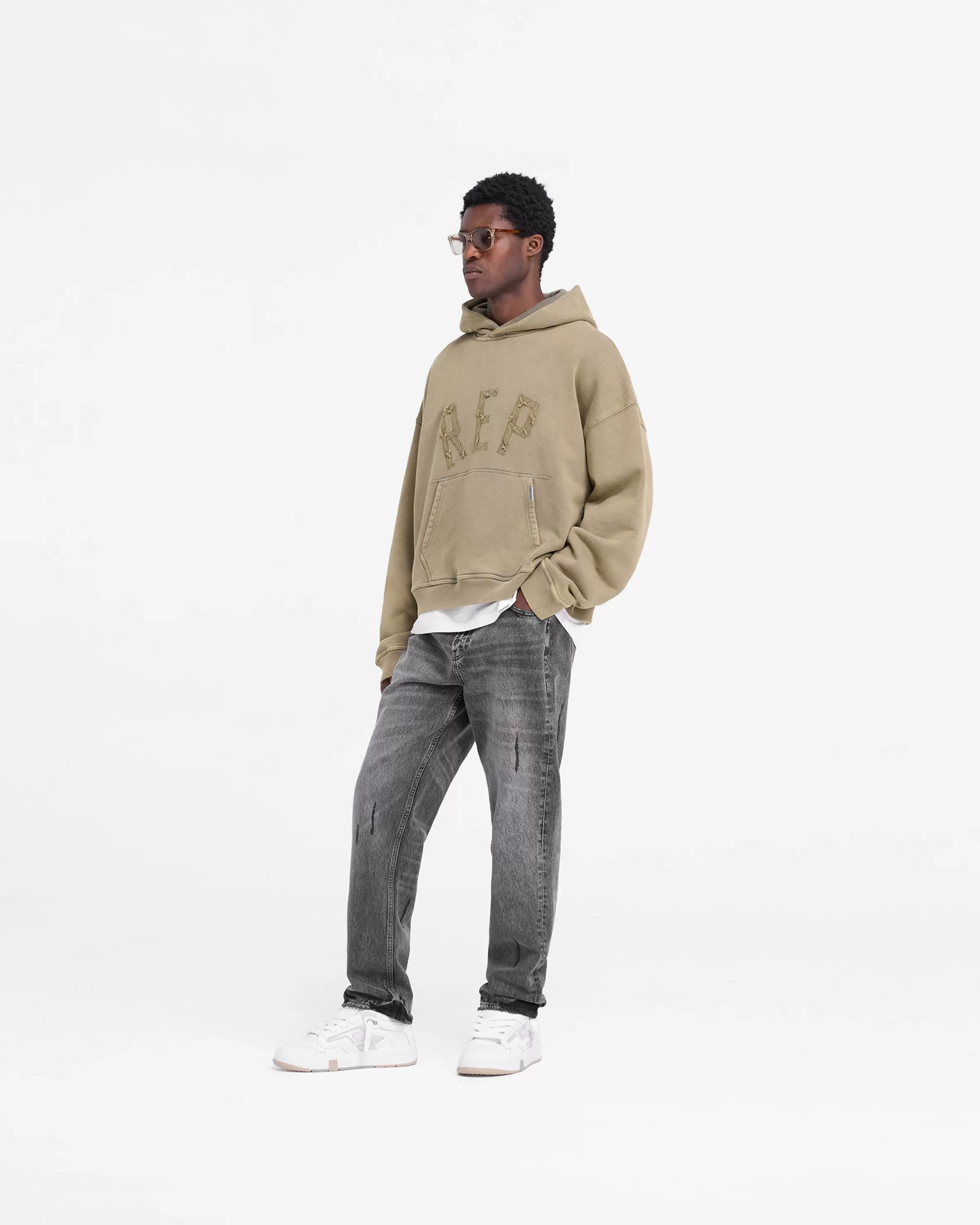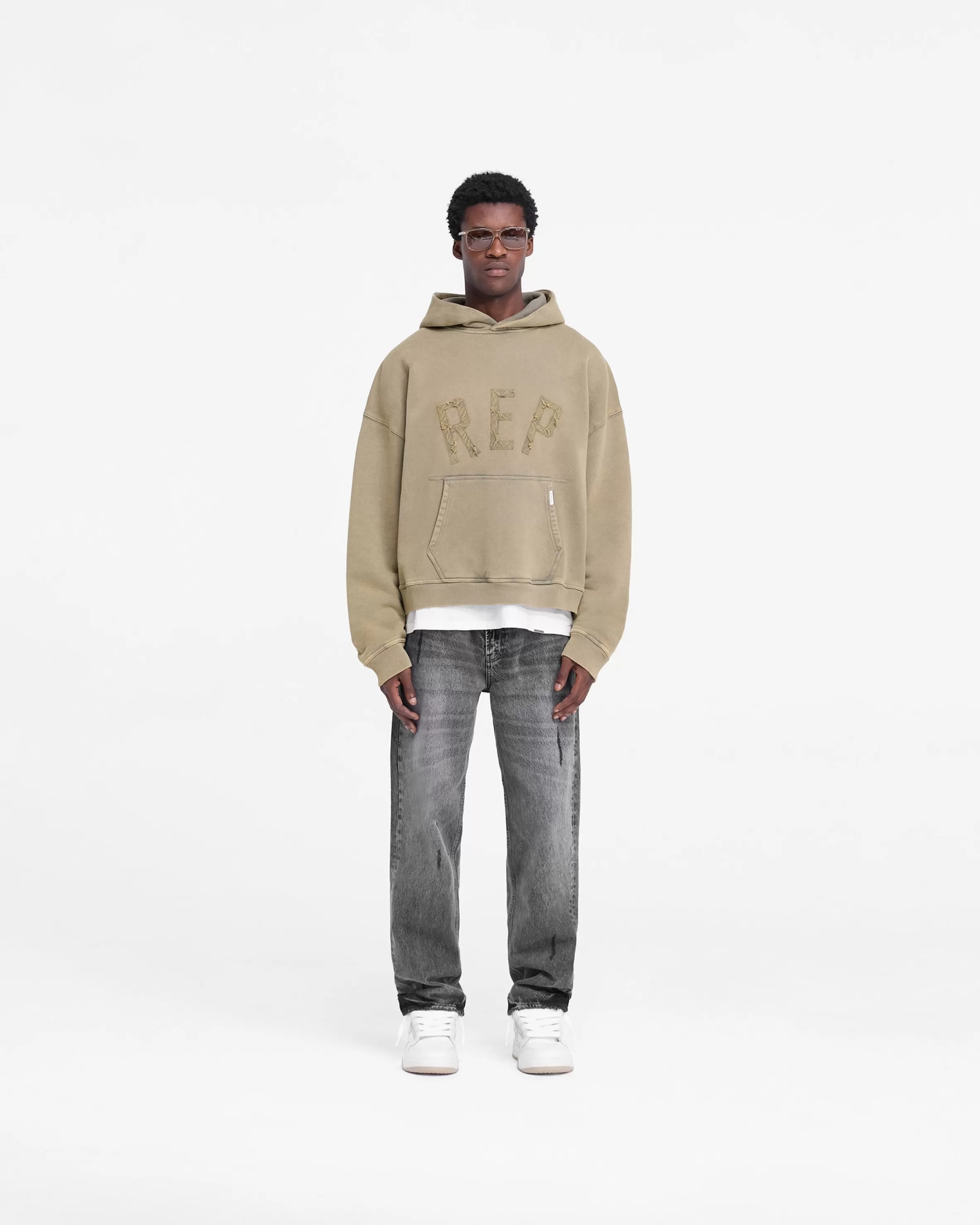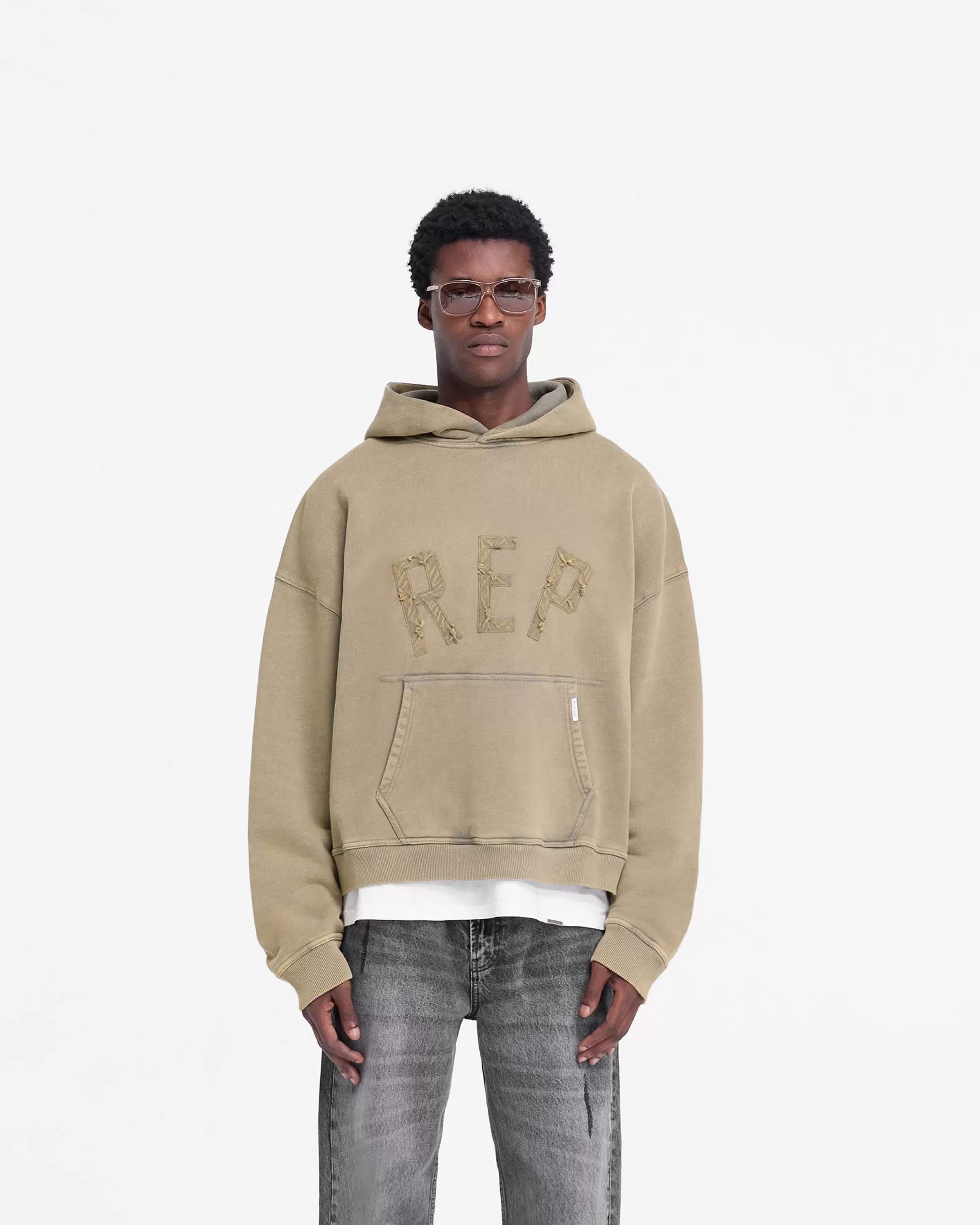 Introducing the Rep Applique Hoodie in Fawn, an oversized boxy sweater crafted from heavy weight jersey cotton, with a ribbed hem and cuffs and a sun fade wash. The hoodie showcases a distressed applique cotton twill Rep logo to the front and is finished with a Represent metal bar logo to the pocket. Fawn Hoodie Oversized Boxy Fit Sun Fade Wash Ribbed Hem u0026amp; Cuffs Represent Metal Bar Logo Composition: 100% Cotton Product Care: Mild wash inside out at 30 degrees celsius. Hang dry in shade. Do not bleach, dry clean or tumble dry. Cool Iron on Reverse Model is 188cm and 75kg wearing size MProduct
