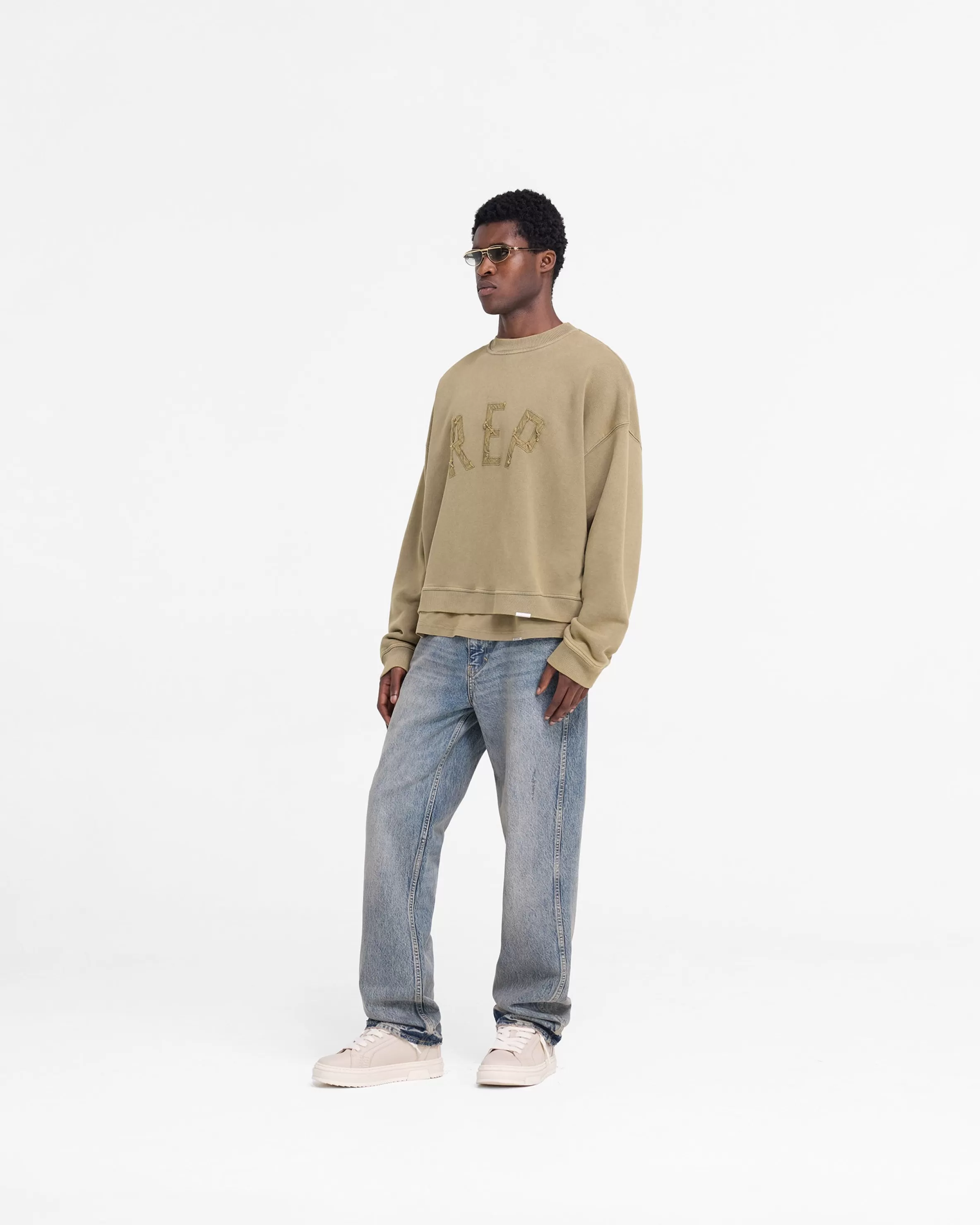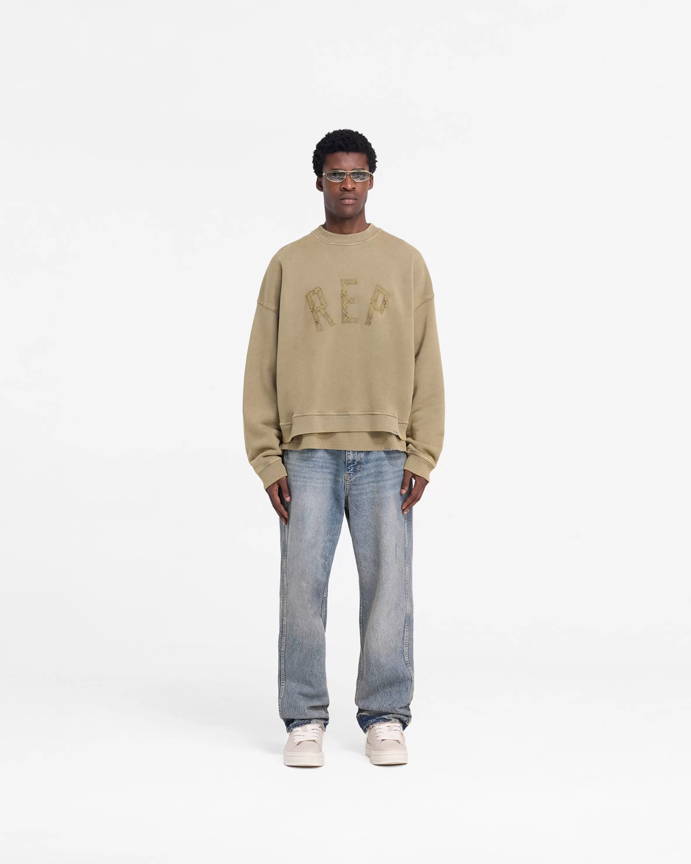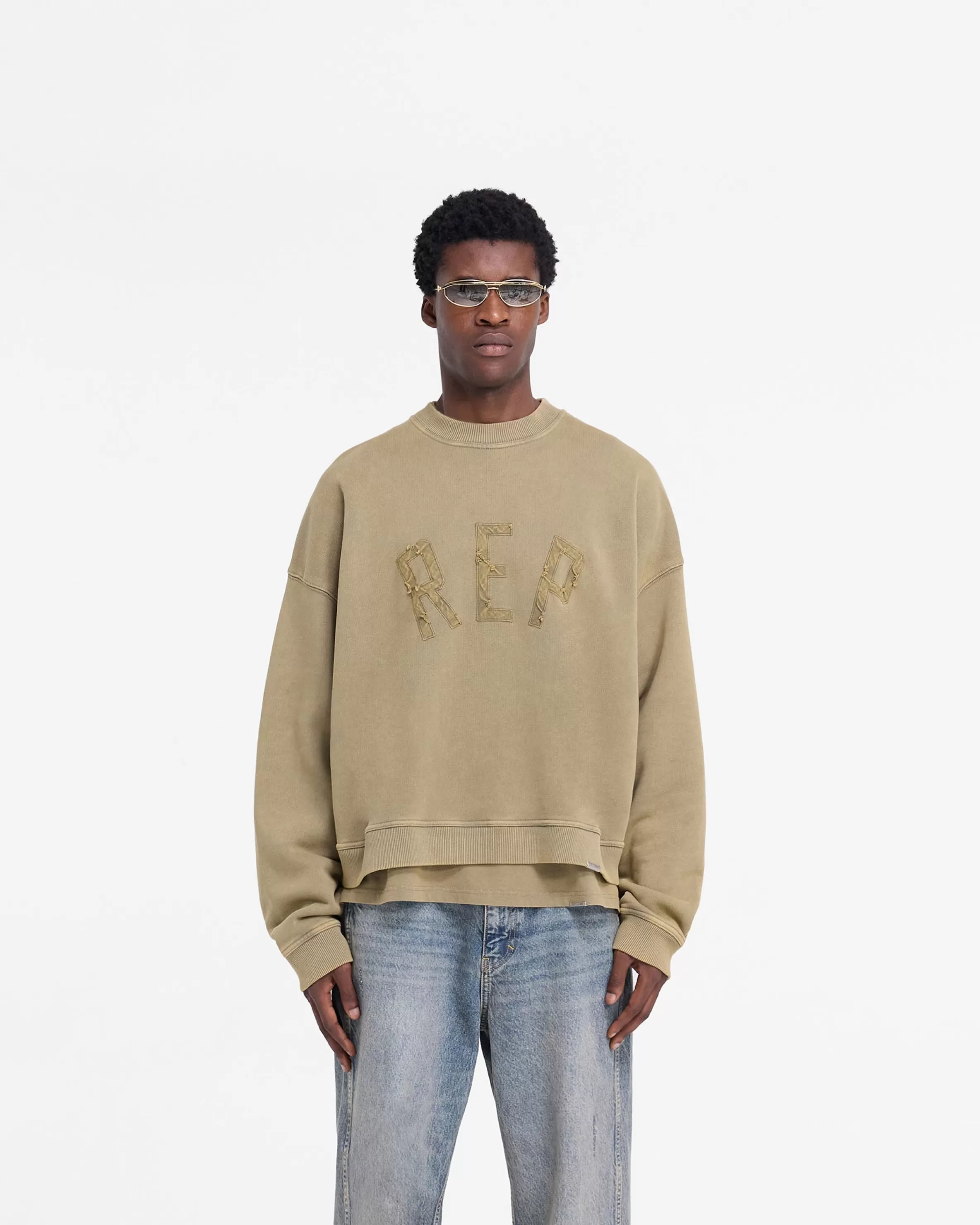 Introducing the Rep Applique Sweater in Fawn, an oversized boxy sweater crafted from heavy weight jersey cotton, with a ribbed hem and cuffs and a sun fade wash. The sweater has a distressed applique cotton twill Rep logo to the front and is finished with a Represent metal bar logo to the hem. Fawn Rep Sweater Oversized Boxy Fit Sun Fade Wash Ribbed Hem u0026amp; Cuffs Represent Metal Bar Logo Composition: 100% Cotton Product Care: Mild wash inside out at 30 degrees celsius. Hang dry in shade. Do not bleach, dry clean or tumble dry. Cool Iron on Reverse Model is 188cm and 75kg wearing size MProduct