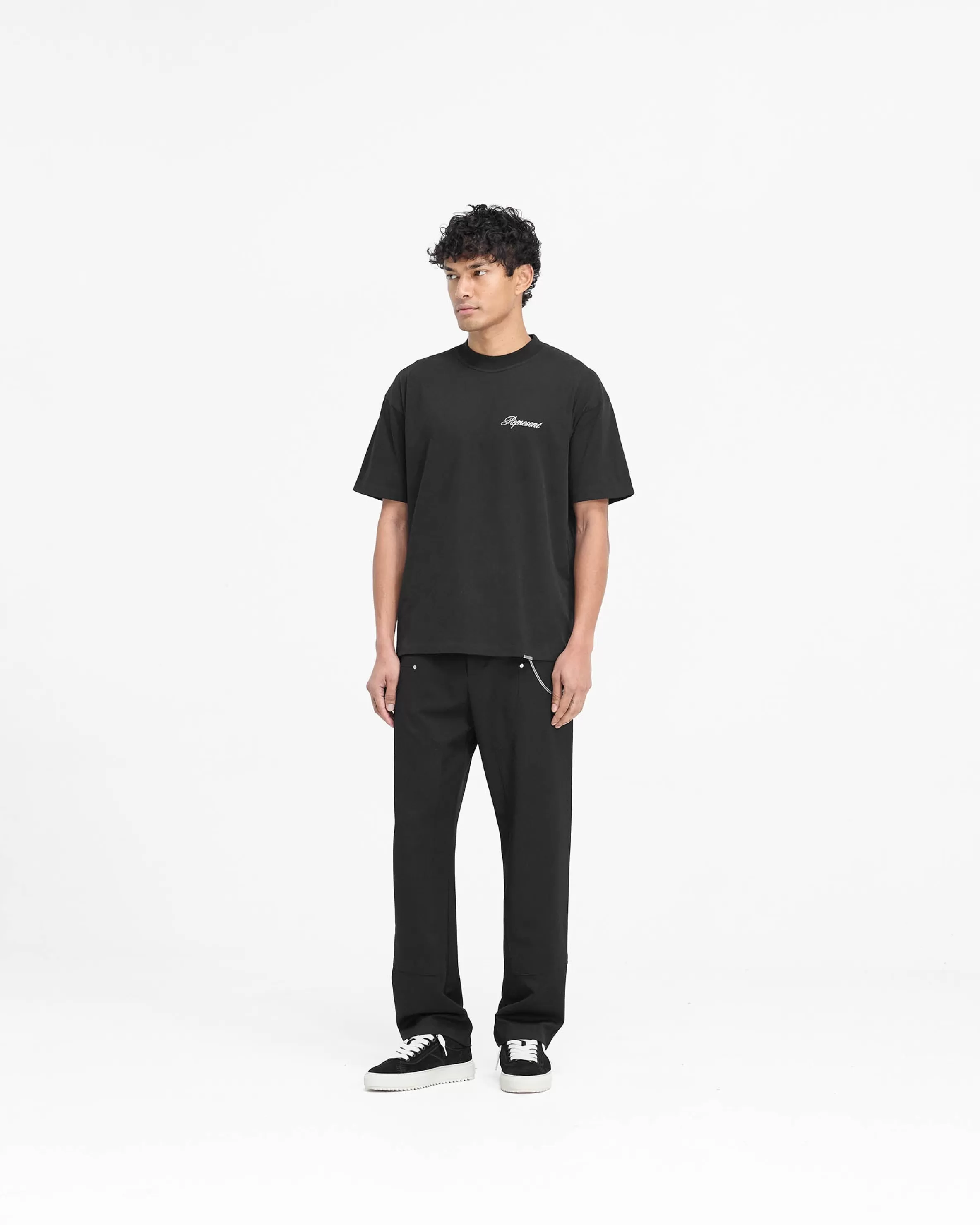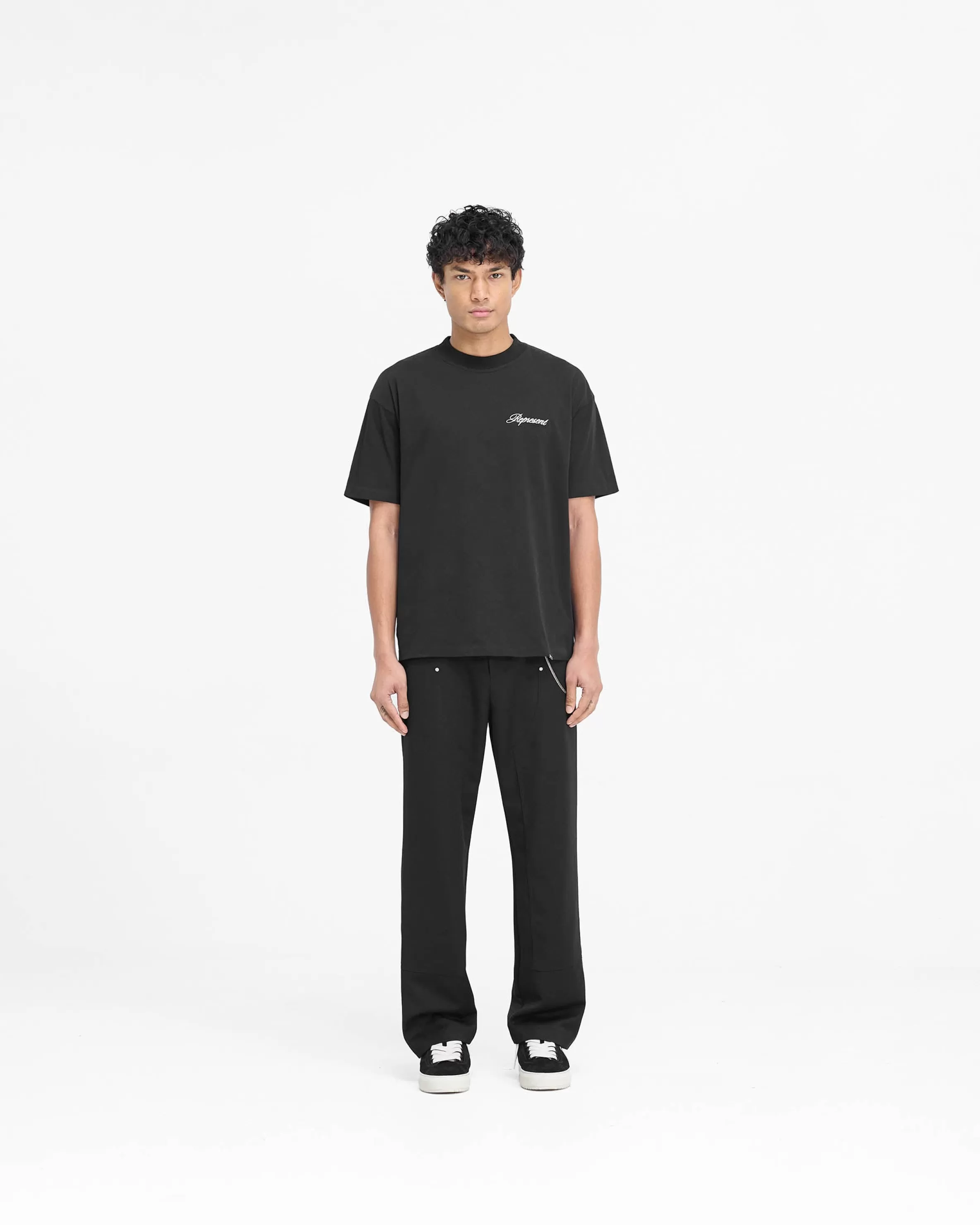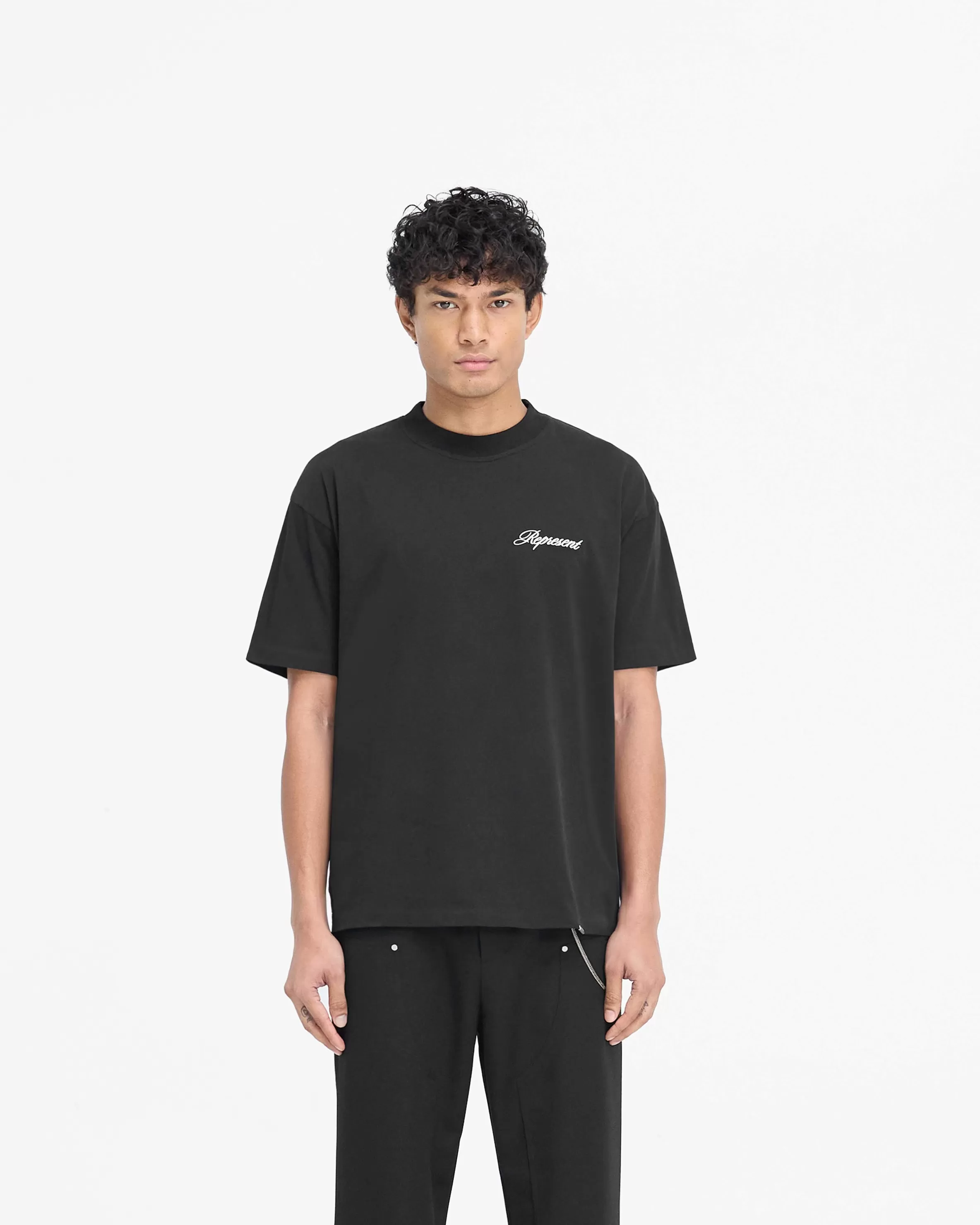 Introducing the Script Logo T-Shirt in Black, a slightly oversized t-shirt crafted from 100% jersey cotton with a carbon finish for a super soft hand feel. The t-shirt has a blind hem for a minimalist finish, with high build embroidered script branding to the front. It is finished with a Represent metal bar to the hem. Script Logo T-Shirt Black Slightly Oversized Super Soft Finish High Build Embroidery Represent Metal Bar Logo Composition: 100% Cotton Product Care: Mild Wash at 30 Degrees Celsius. Do not bleach, do not tumble dry, do not dry clean. Line dry in shade. Cool iron on reverse. Model is 188cm and 75kg wearing size MProduct