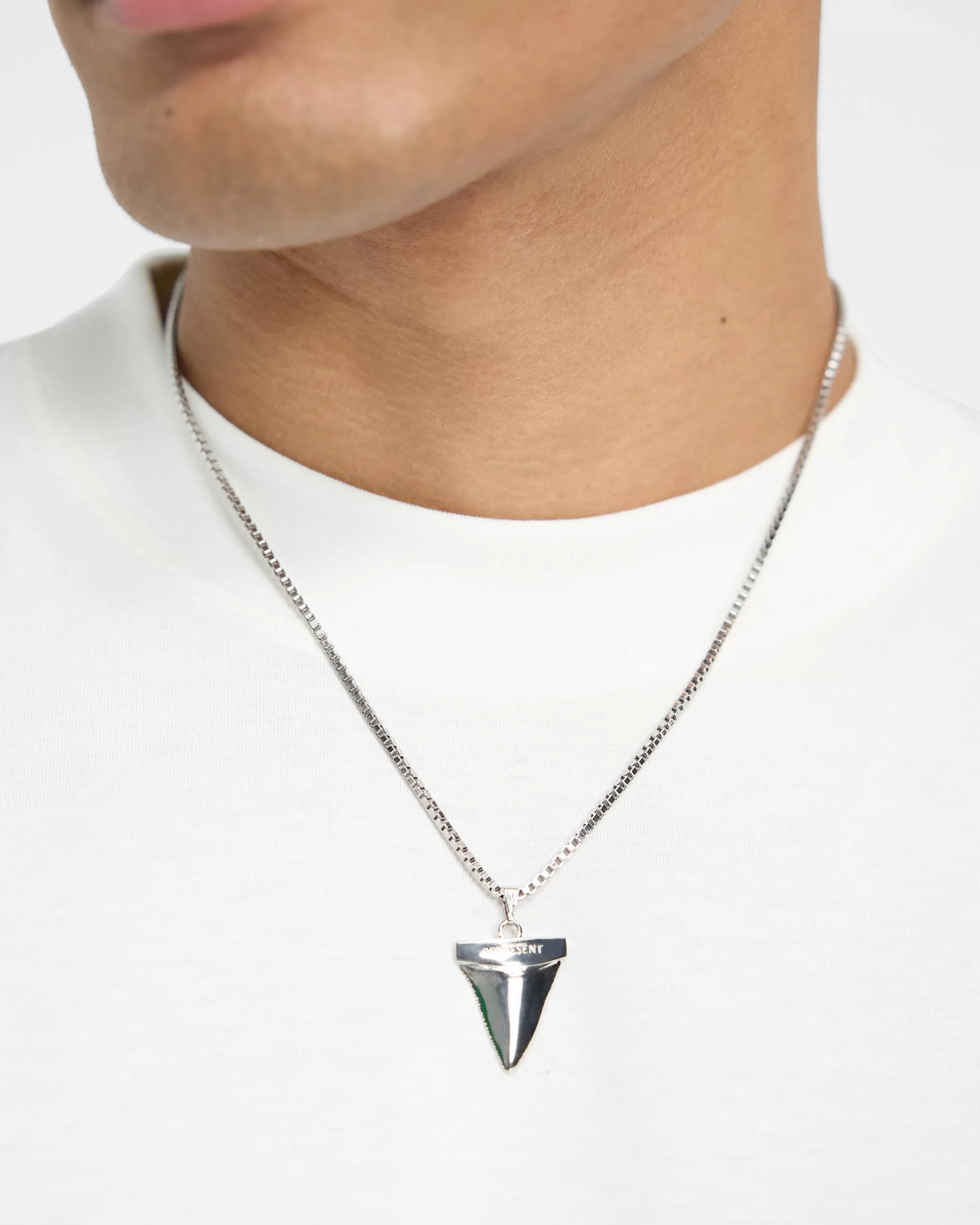 Introducing the Shark Tooth Necklace in Silver, a luxury maximalist jewellery piece, crafted from sterling silver coated brass with a 16 inch rolo link chain with an oval lobster trigger clap. It is finished with Represent debossed branding to the front and an Initial to the back. Shark Tooth Necklace Sterling Silver Plated Brass 16 Inch Rolo Link Chain Lobster Clasp Debossed Branding Composition: Sterling Silver Plated Brass Product