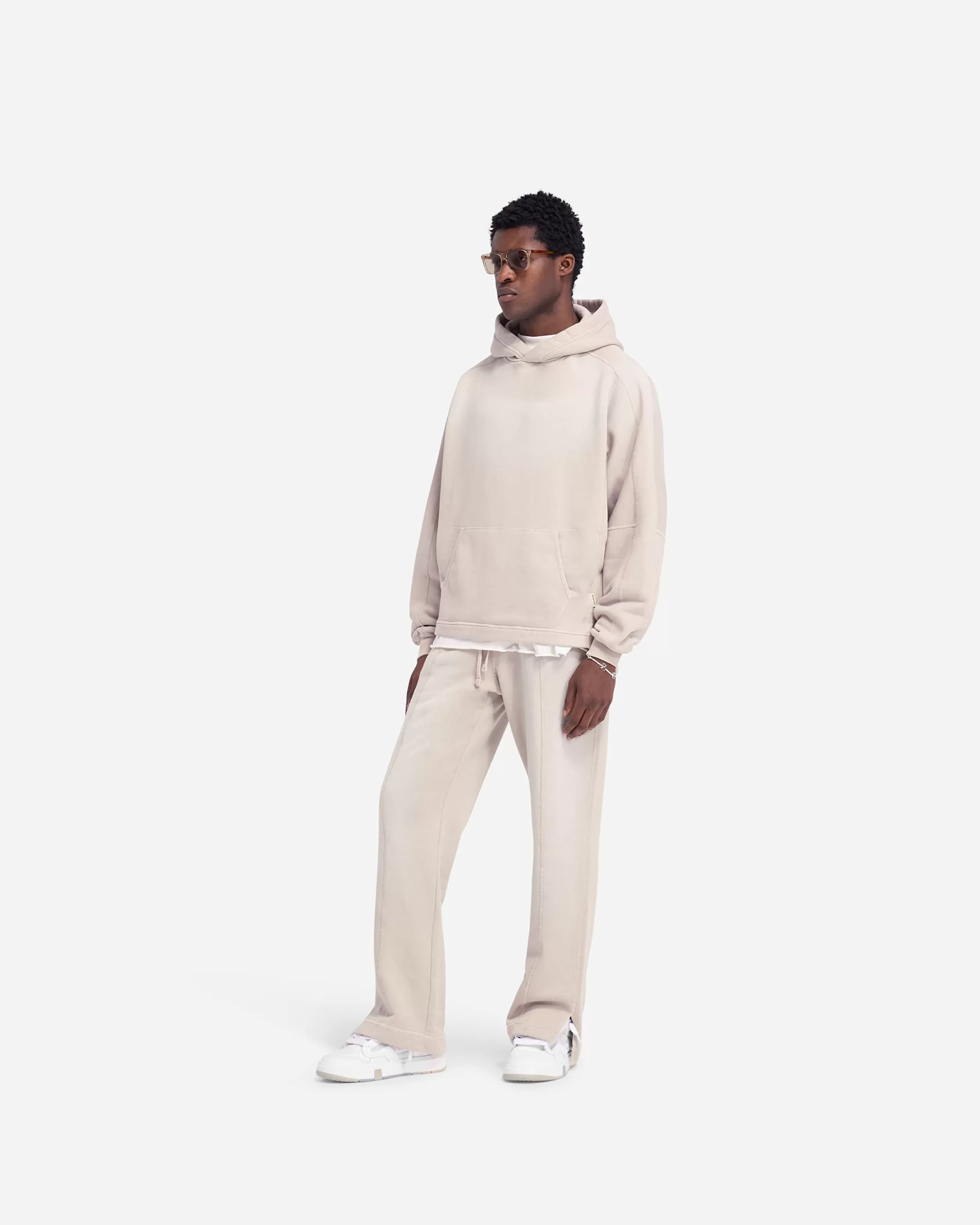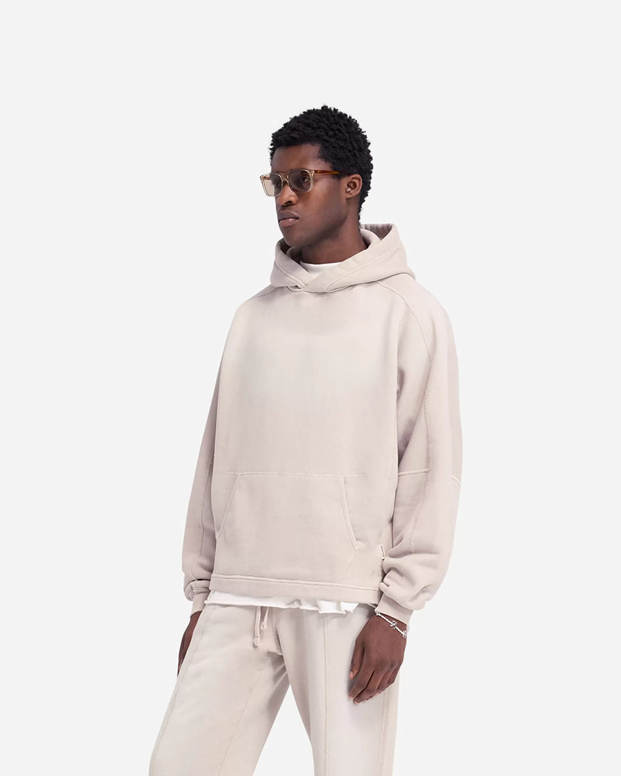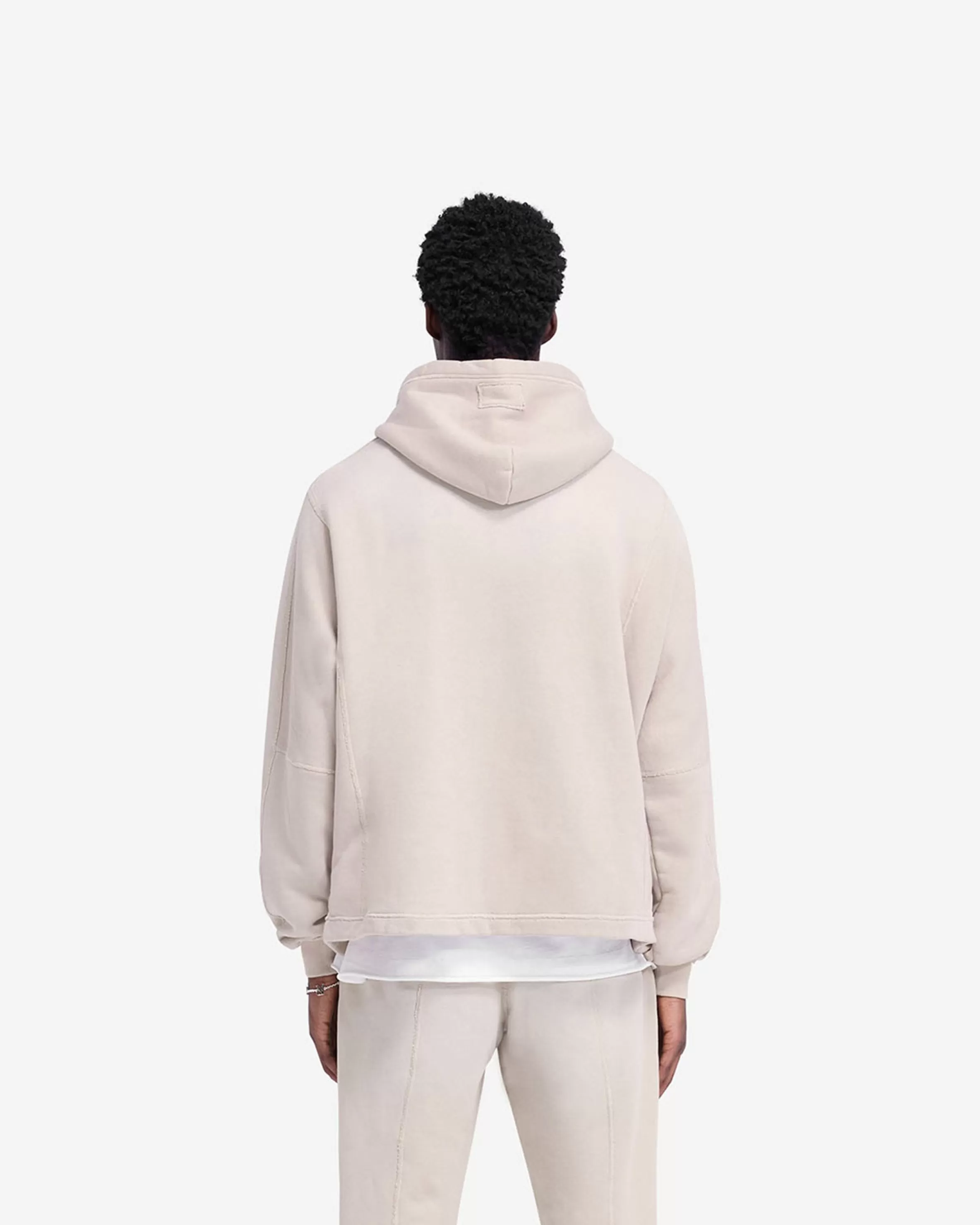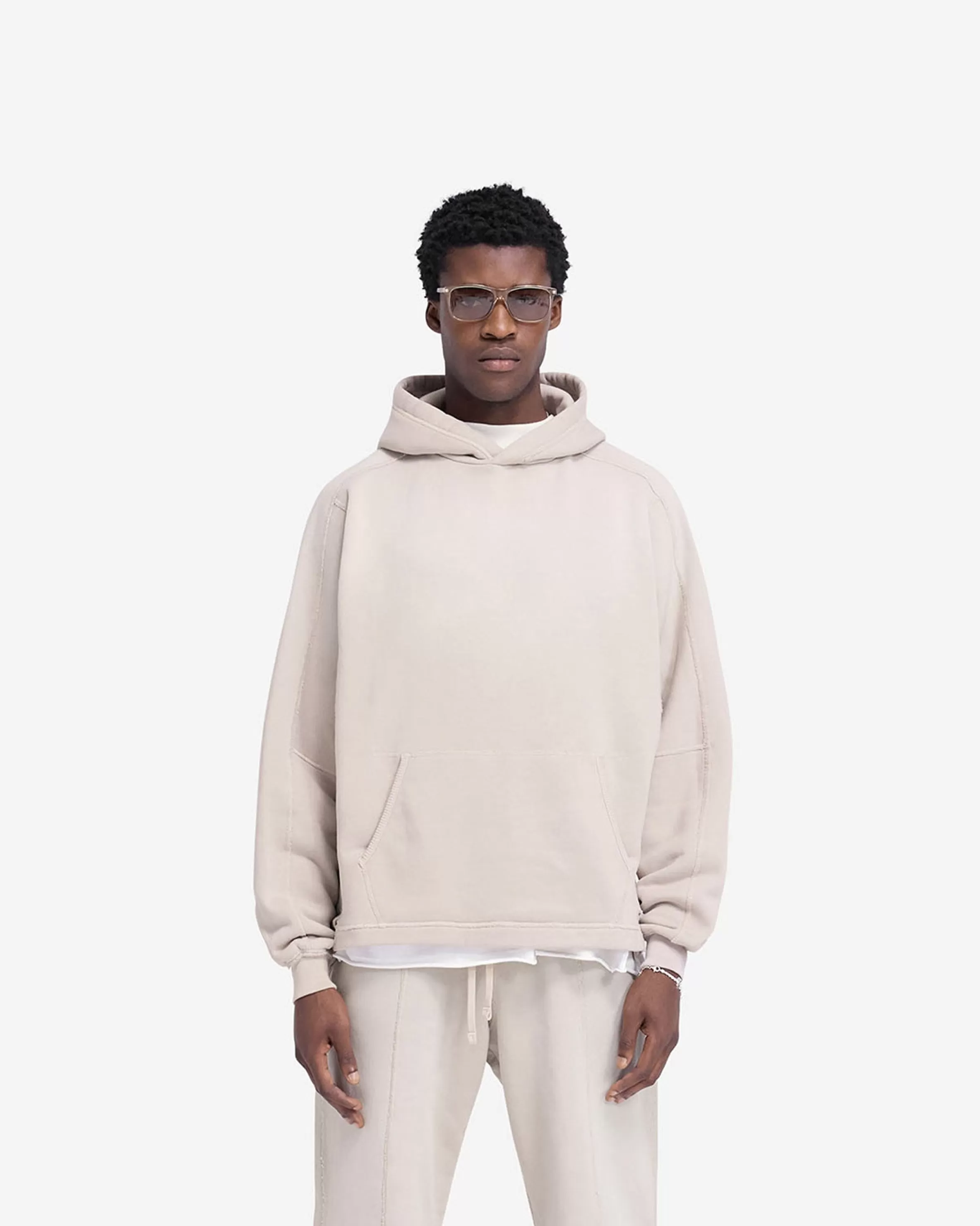 Introducing the Stepped Hem Hoodie in Oat, a luxury oversized hoodie crafted with a sun fade wash for an authentic vinta…