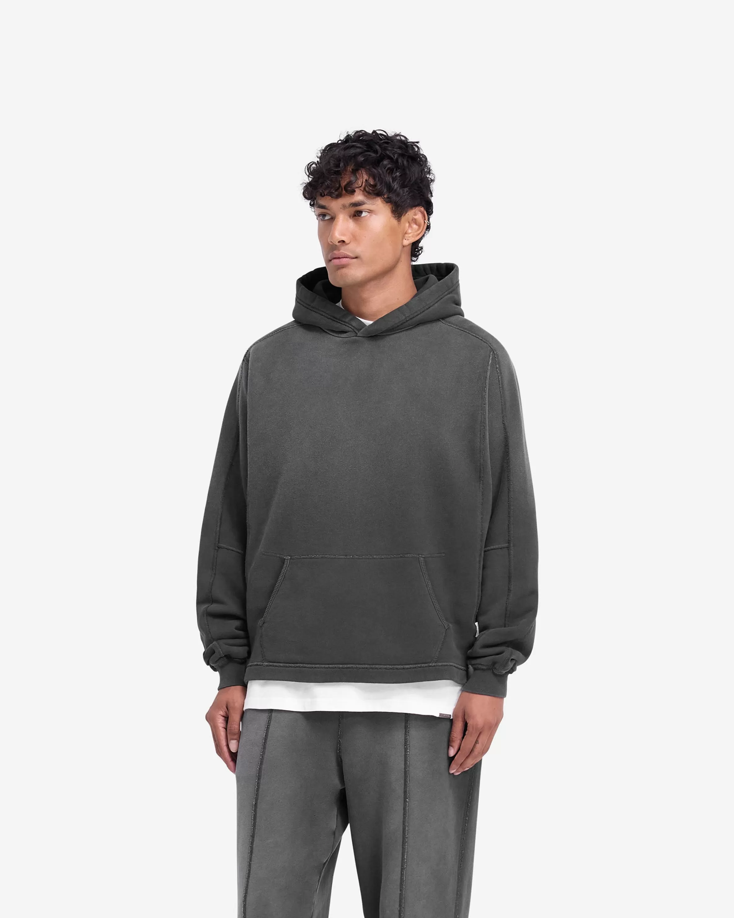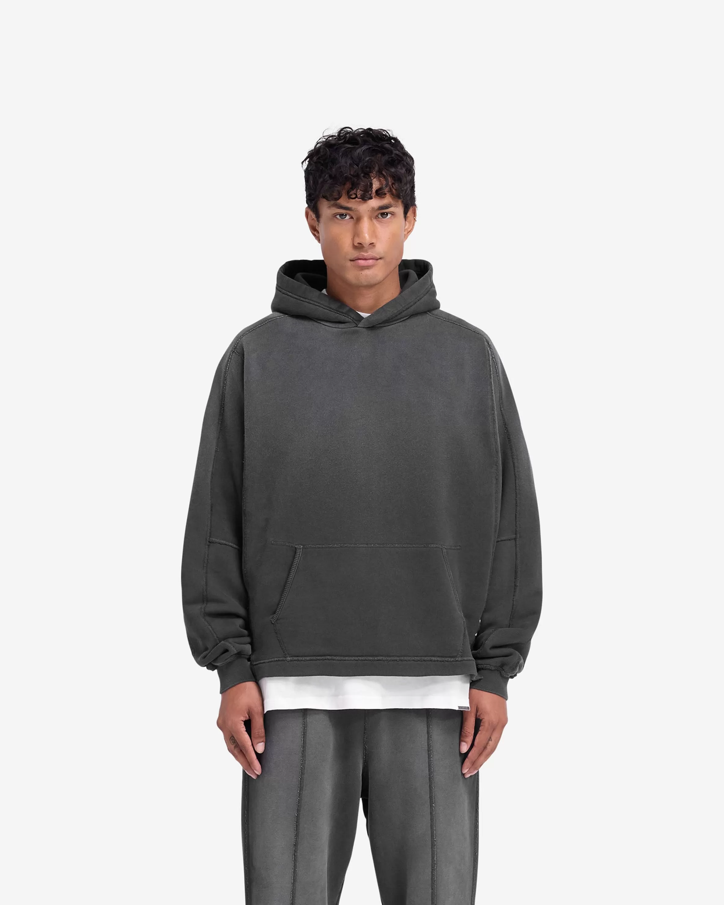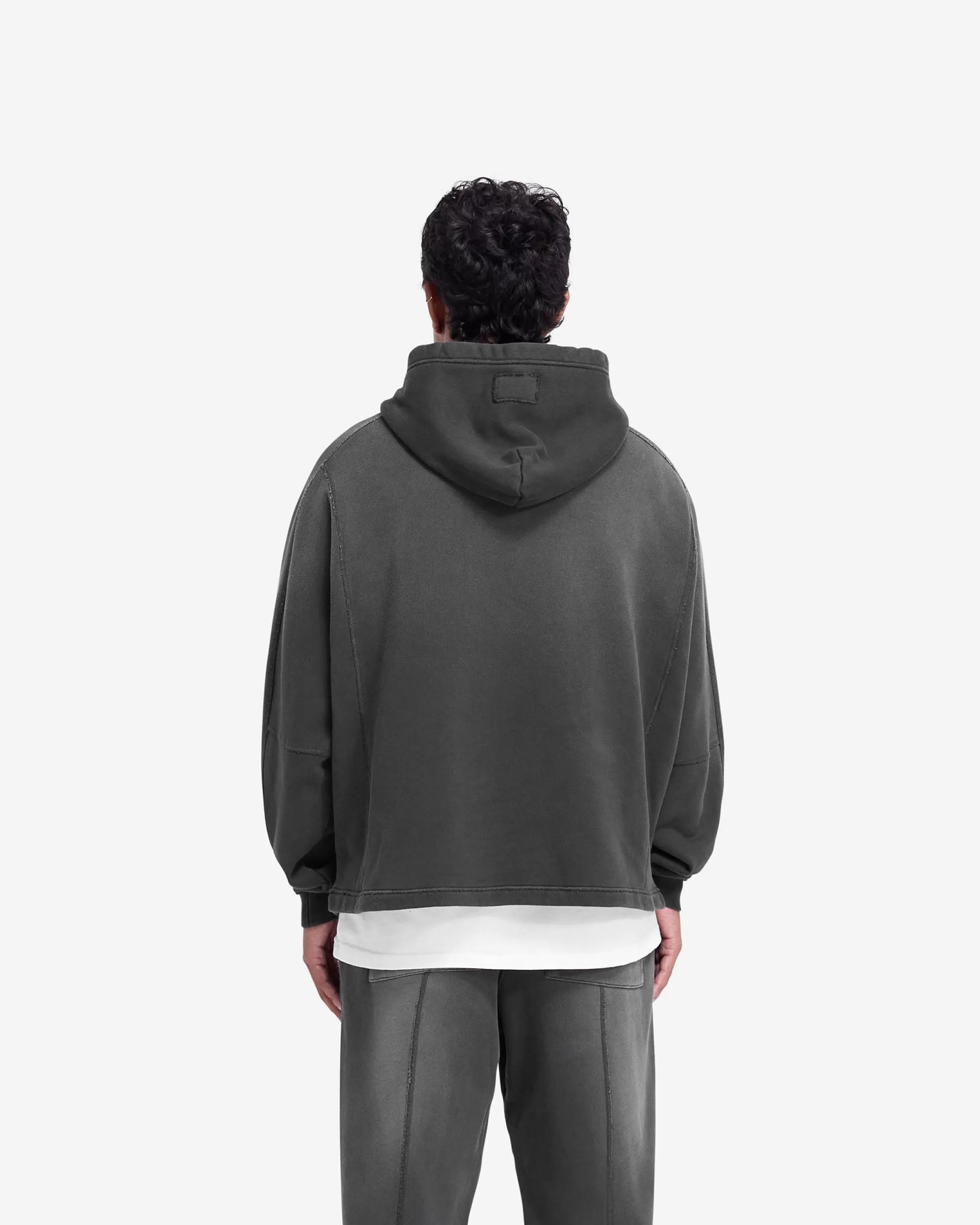 Introducing the Stepped Hem Hoodie in Stained Black, a luxury oversized hoodie crafted with a fade out wash for an authe…
