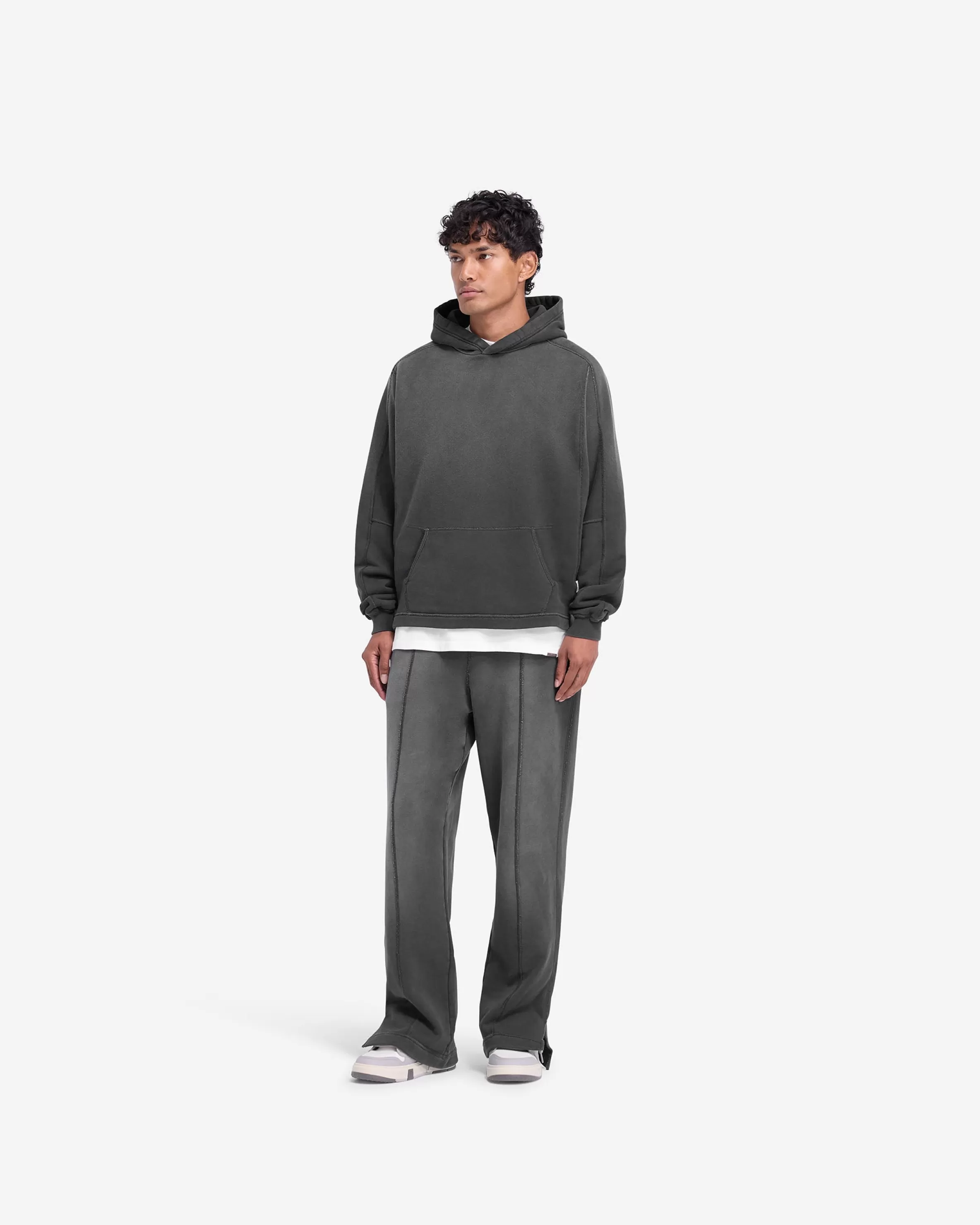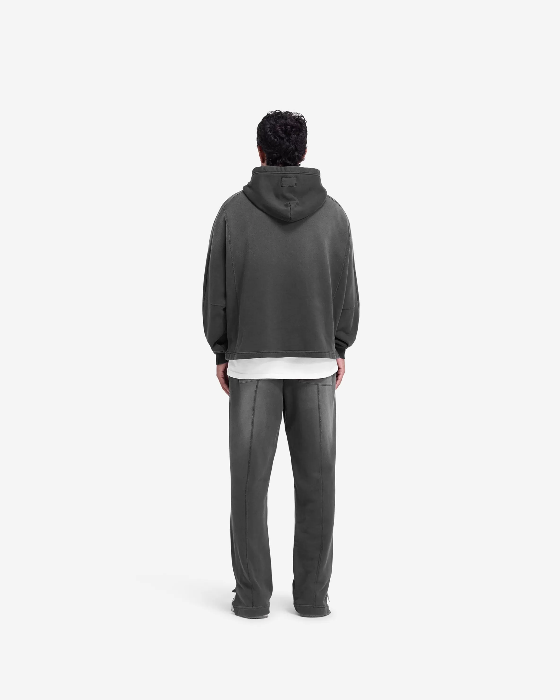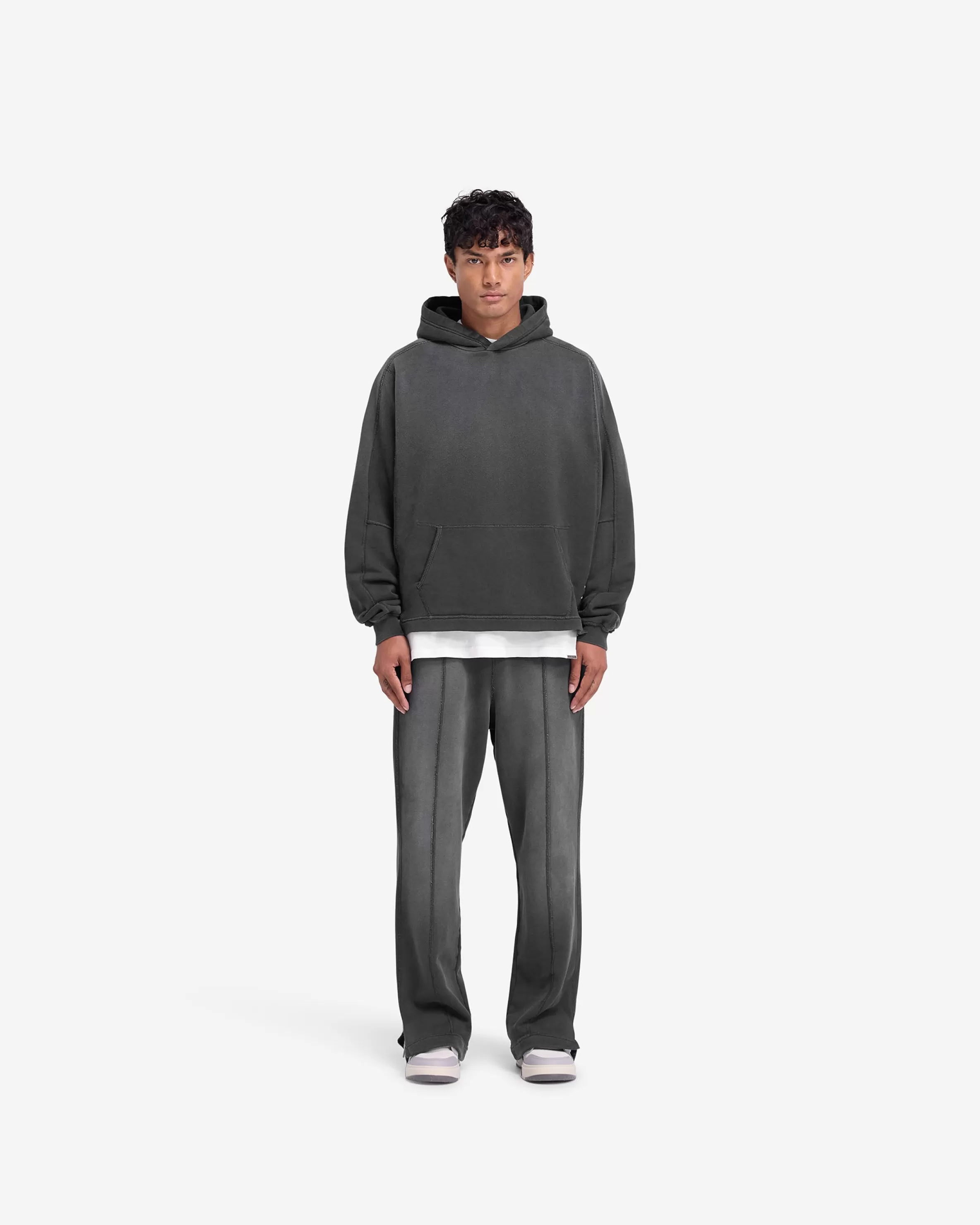 Introducing the Stepped Hem Hoodie in Stained Black, a luxury oversized hoodie crafted with a fade out wash for an authe…