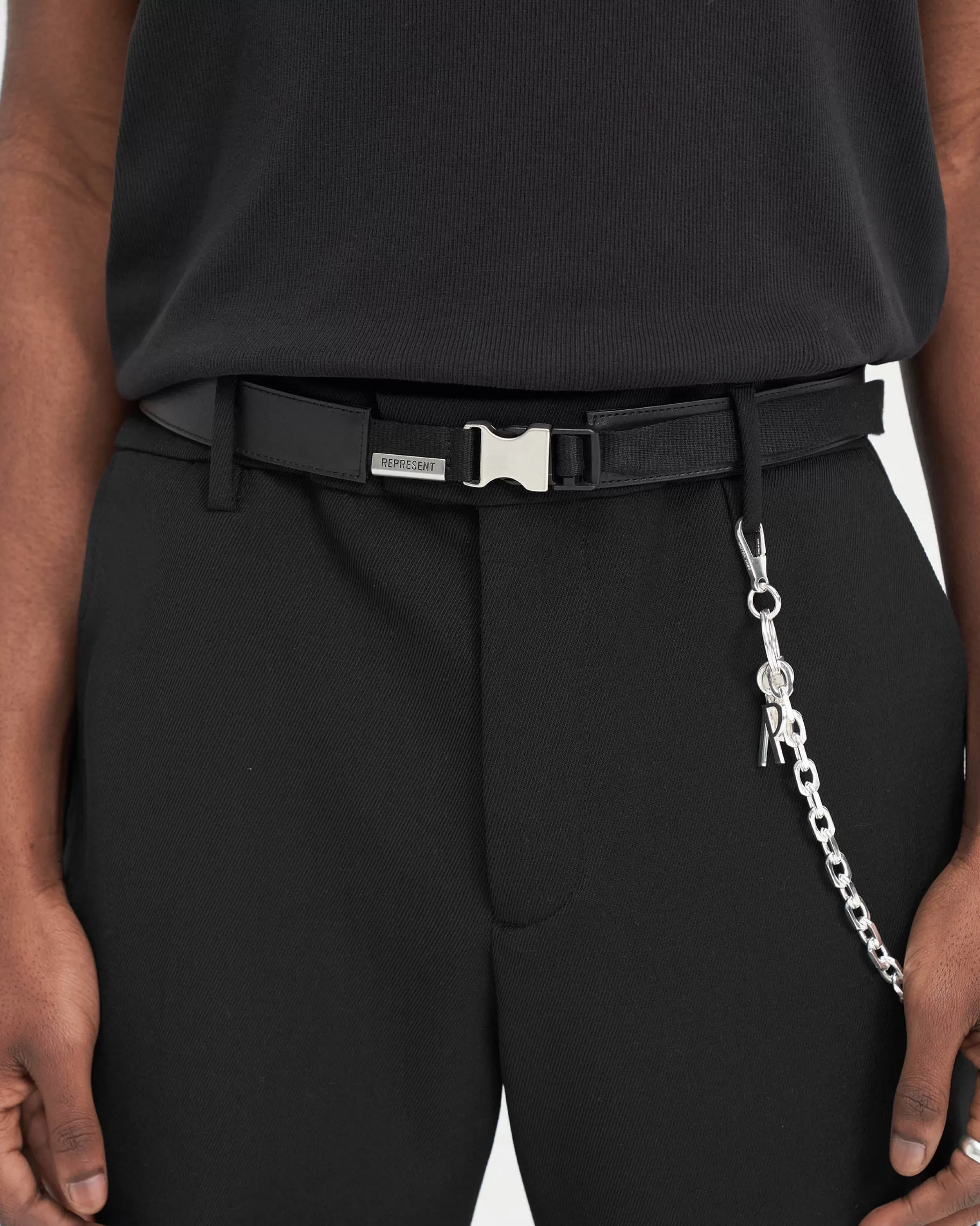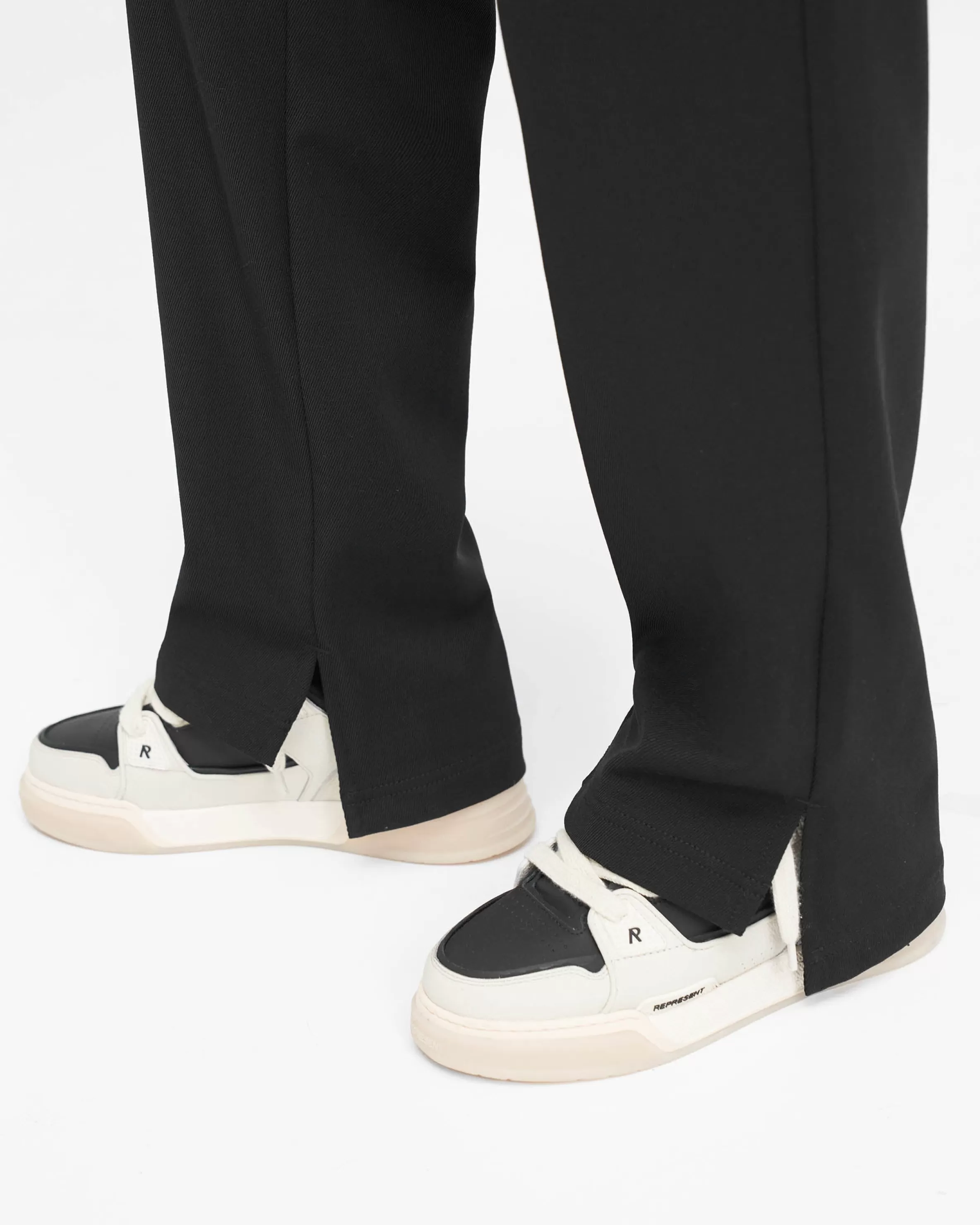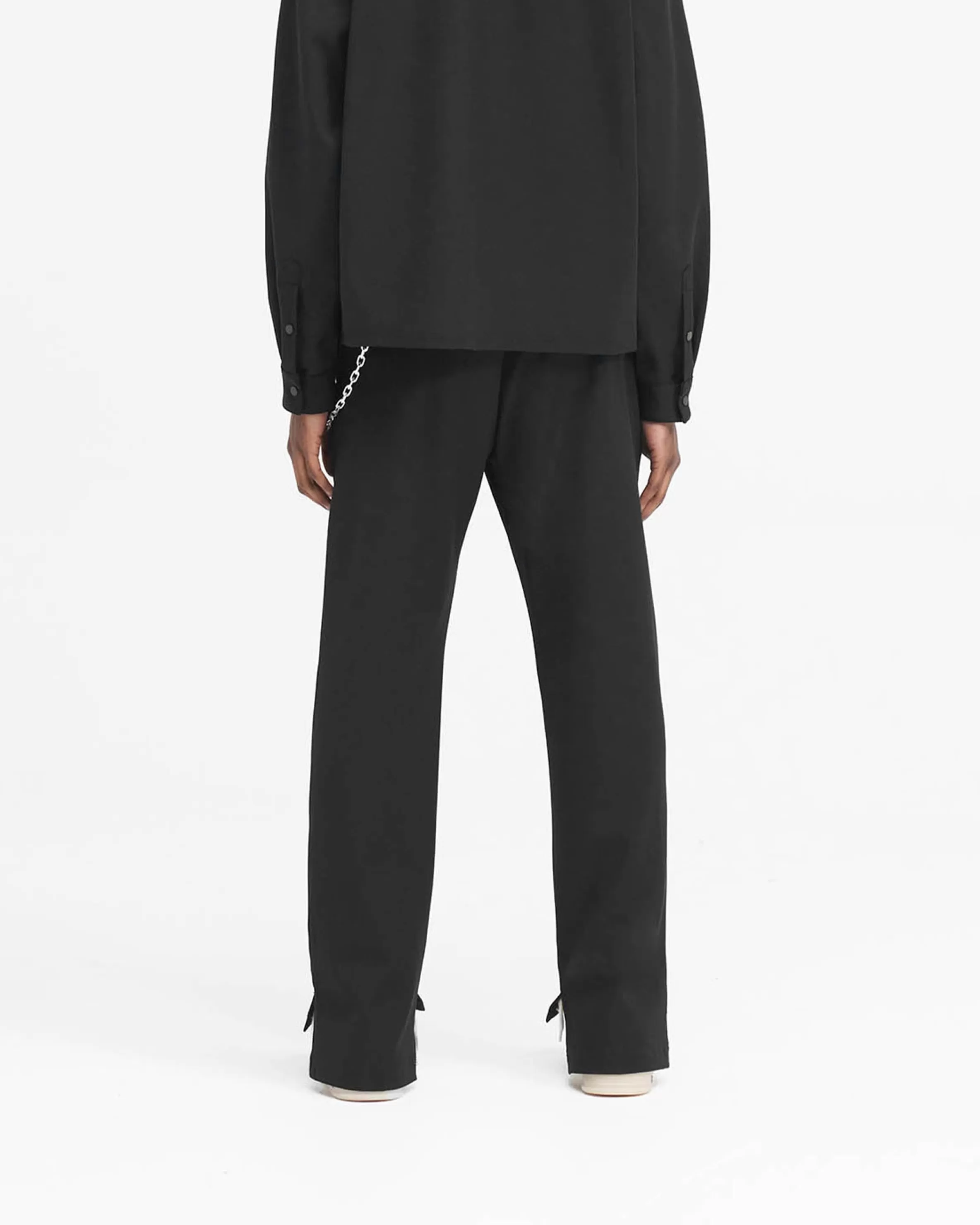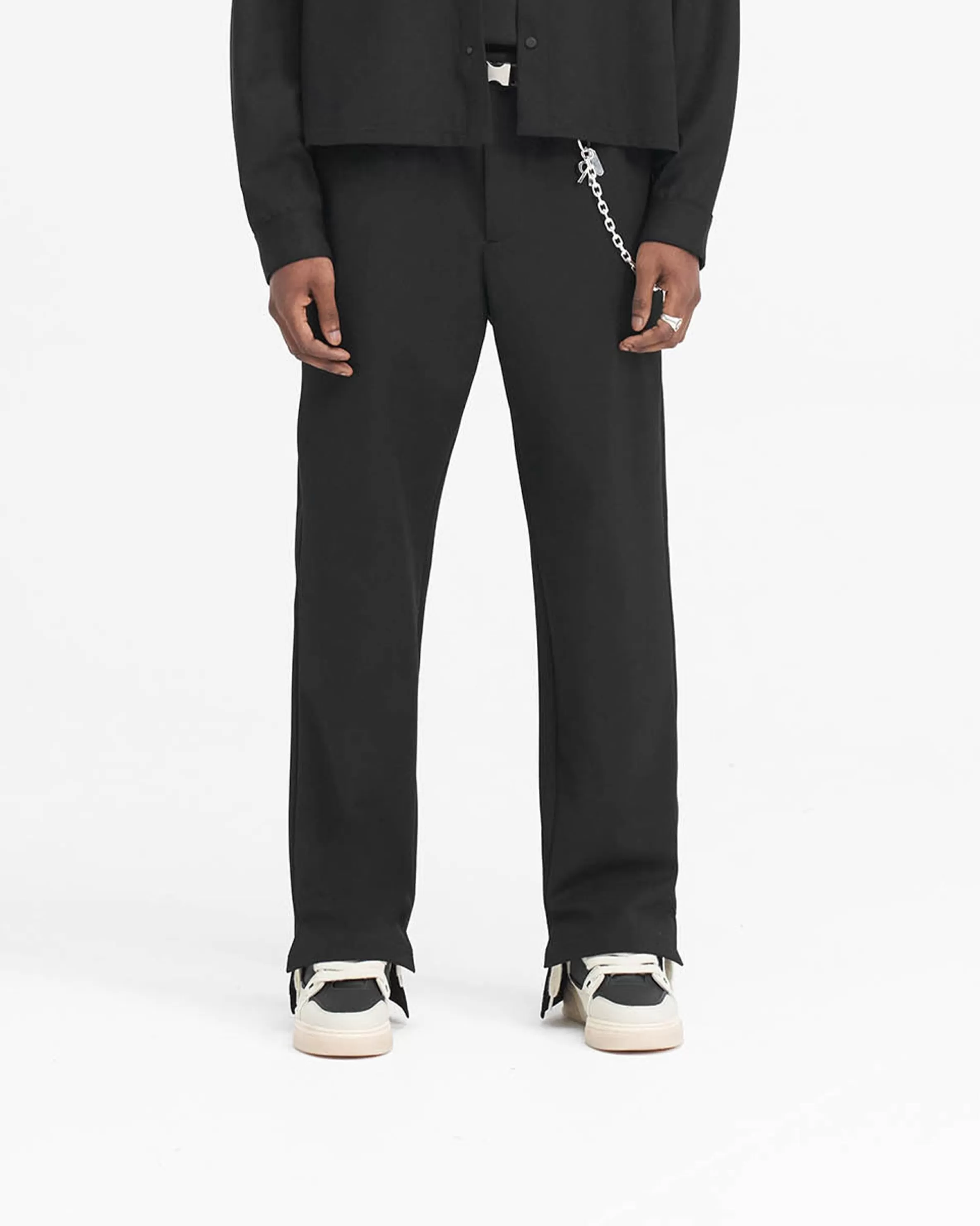 Introducing the Stepped Hem Pant in Black, a luxury pant style designed to be paired with our Dress Shirt. These pants have a slightly wide leg with a stepped hem to the bottom with side splits. There is a slight stretch to the fabric, with a twill finish. The pants have slanted hand pockets with faux welt pockets to the back. They are finished with Represent metal branding to the back belt loop. Black Stepped Hem Pants Wide Leg Split Hem Twill Finish Product