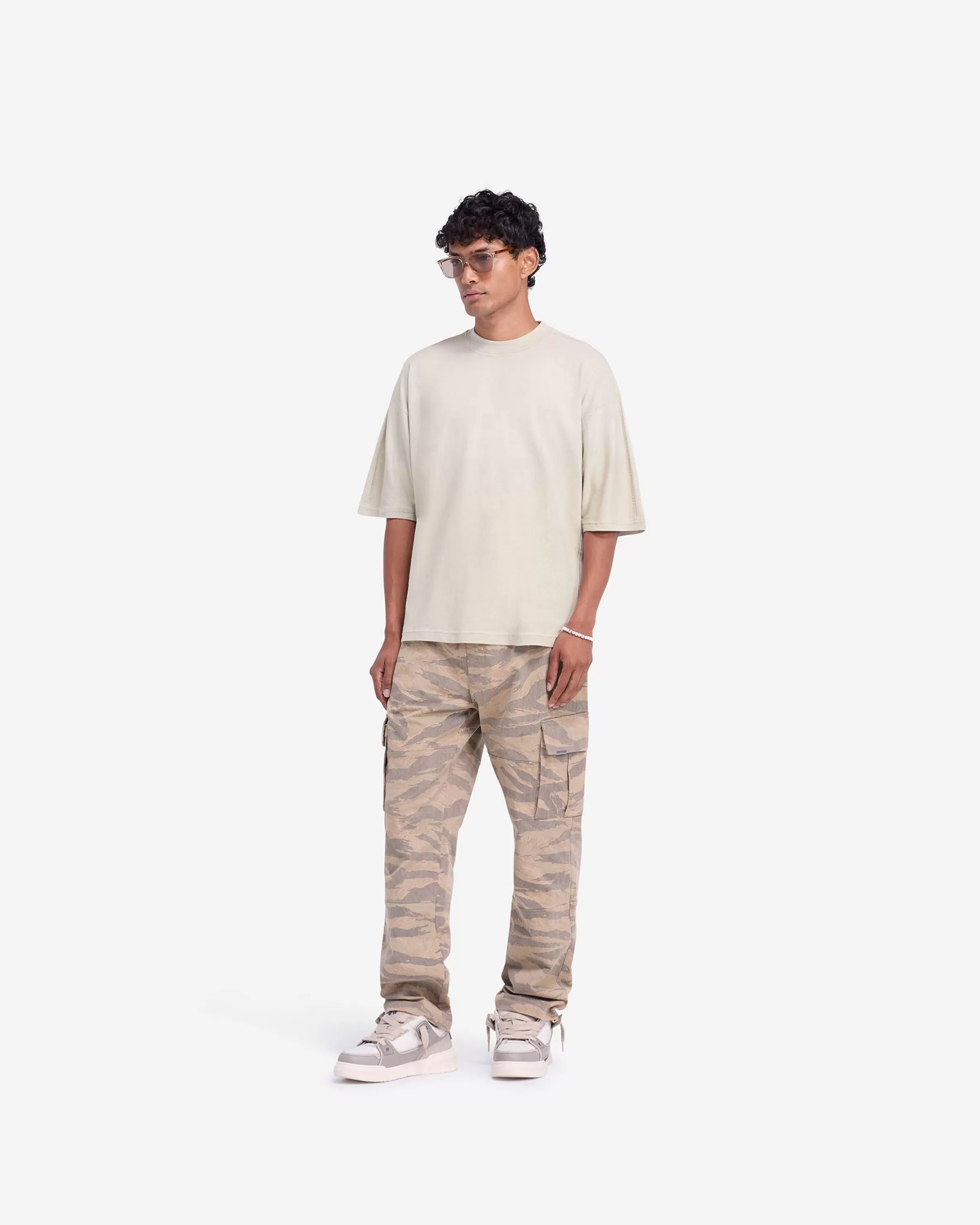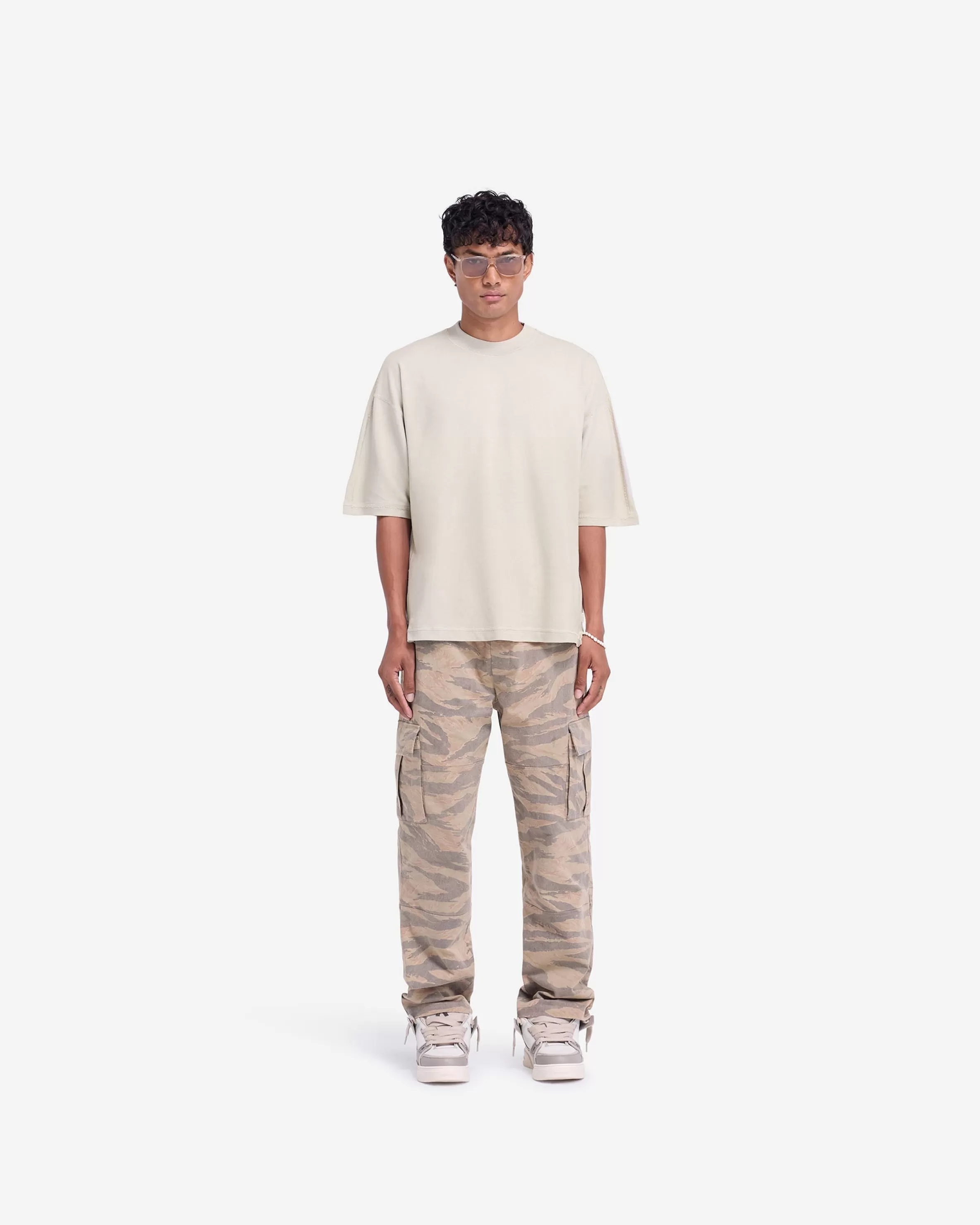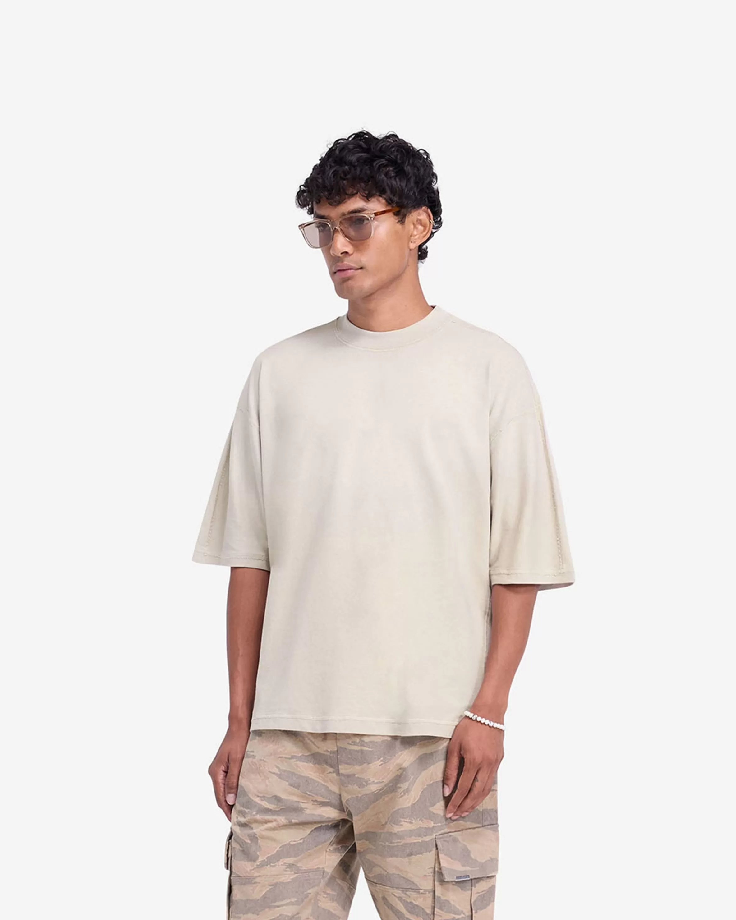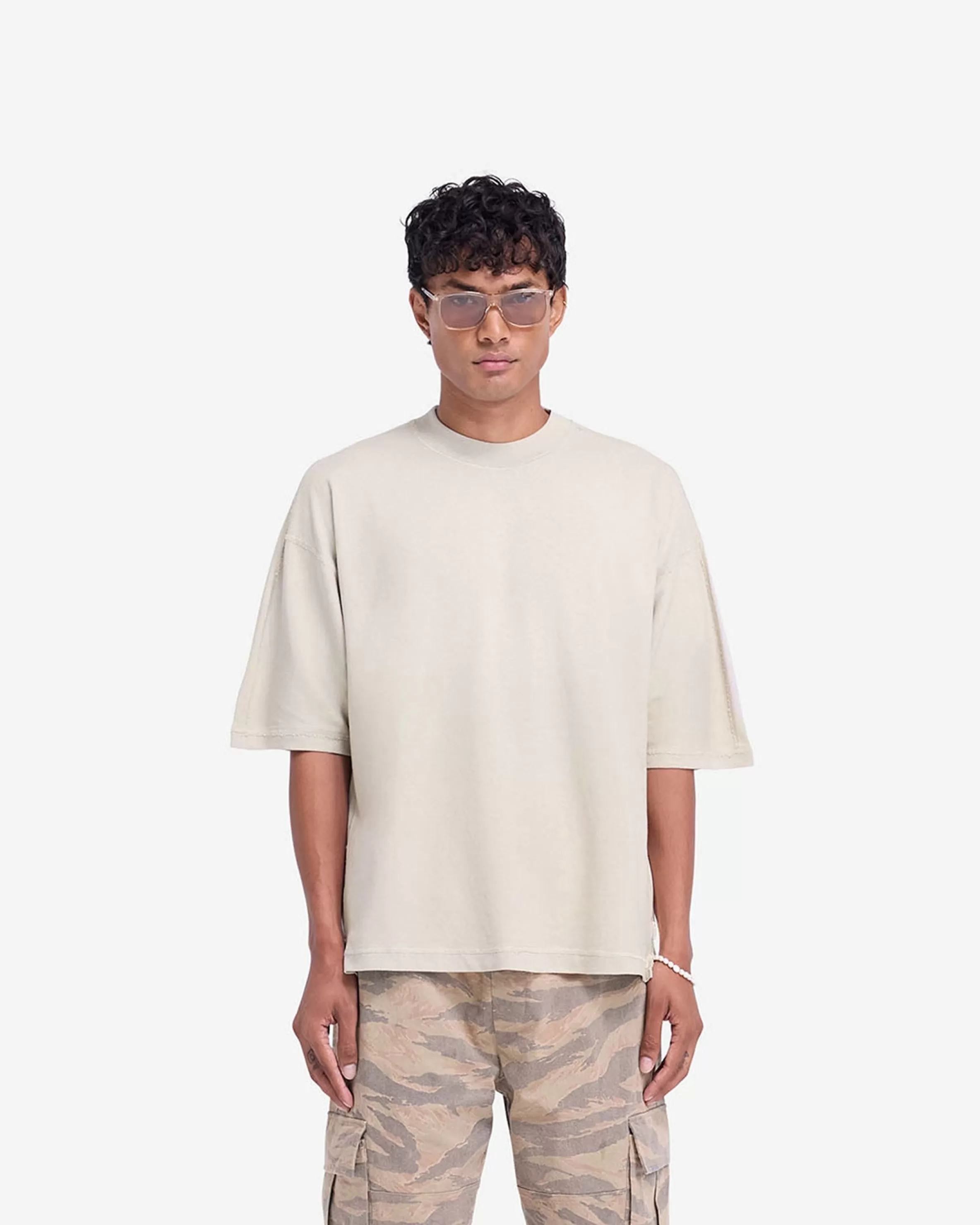 Introducing the Stepped Hem T-Shirt in Oat, a luxury oversized boxy t-shirt crafted with a sun fade wash for an authenti…