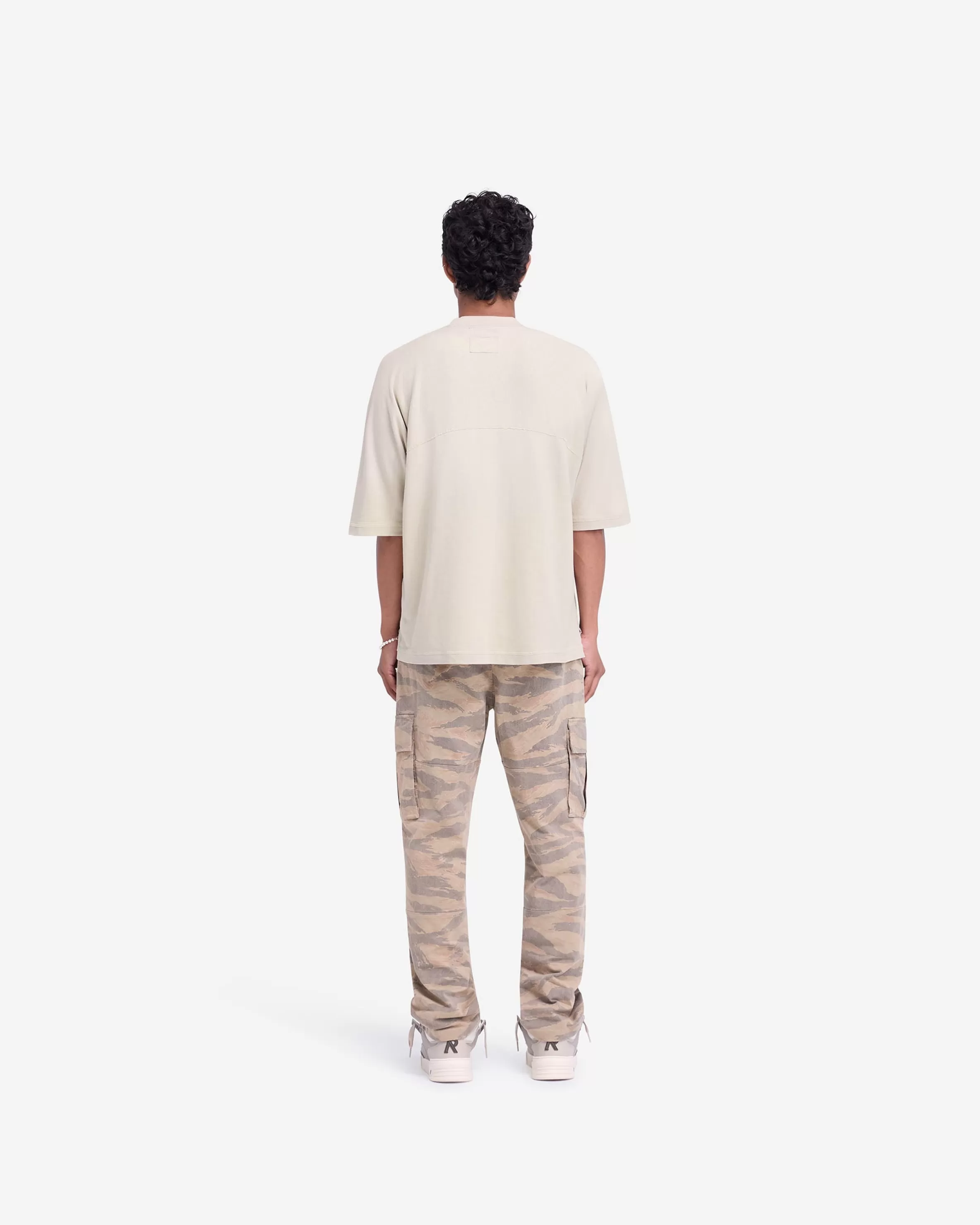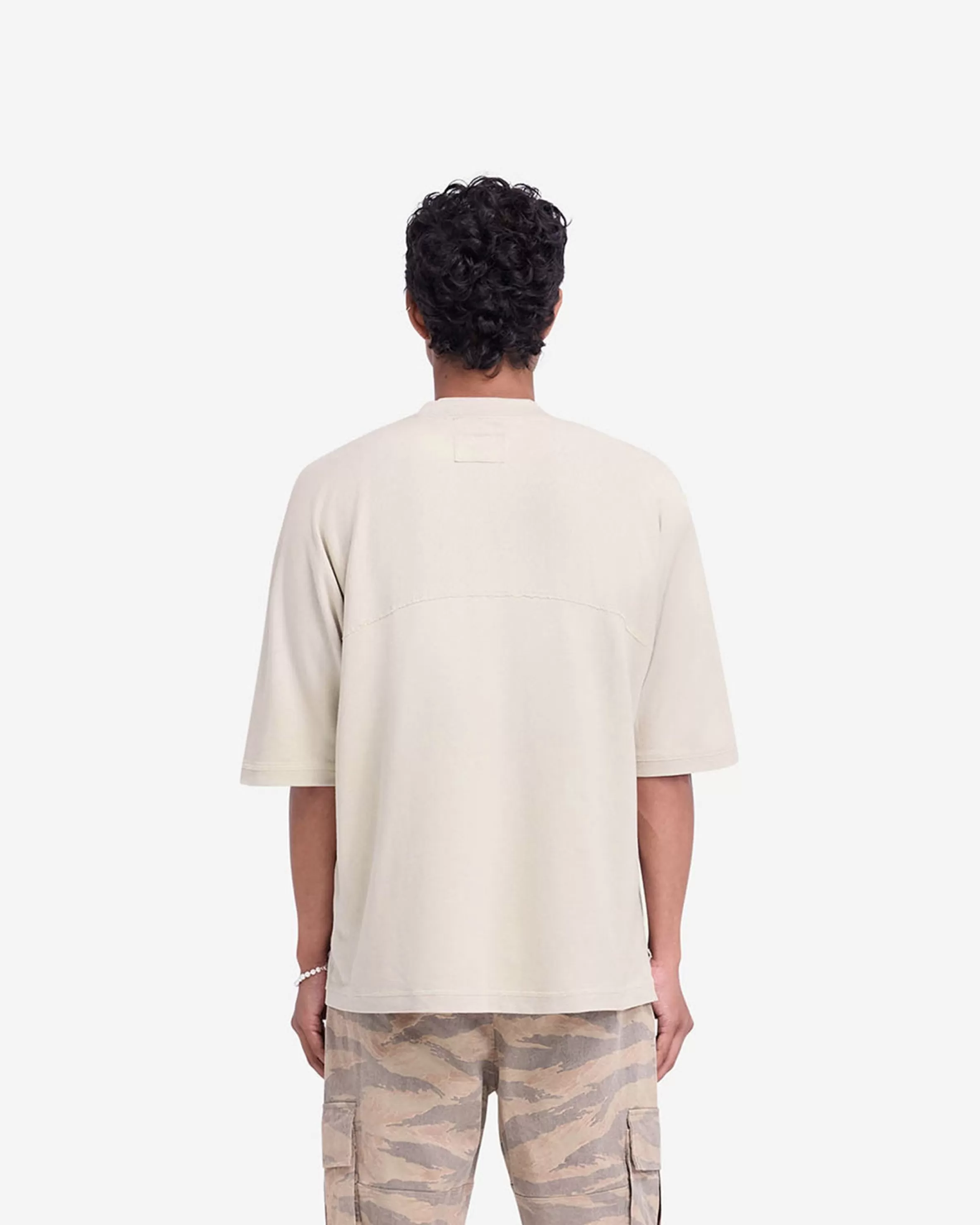Introducing the Stepped Hem T-Shirt in Oat, a luxury oversized boxy t-shirt crafted with a sun fade wash for an authentic vintage look. The t-shirt showcases a split stepped hem, with overlock seam detailing. It is finished with a self fabric raw edge patch to the back neck, and a Represent branding tab to the side seam. Stepped Hem T-Shirt Oversized Boxy Fit Sun Fade Wash Split Stepped Hem Overlock Seams Represent Tab Composition: 100% Cotton Product Care: Mild wash inside out at 30 degrees celsius. Hang dry in shade. Do not bleach, dry clean, or tumble dry. Model is 188cm and 75kg wearing size MProduct