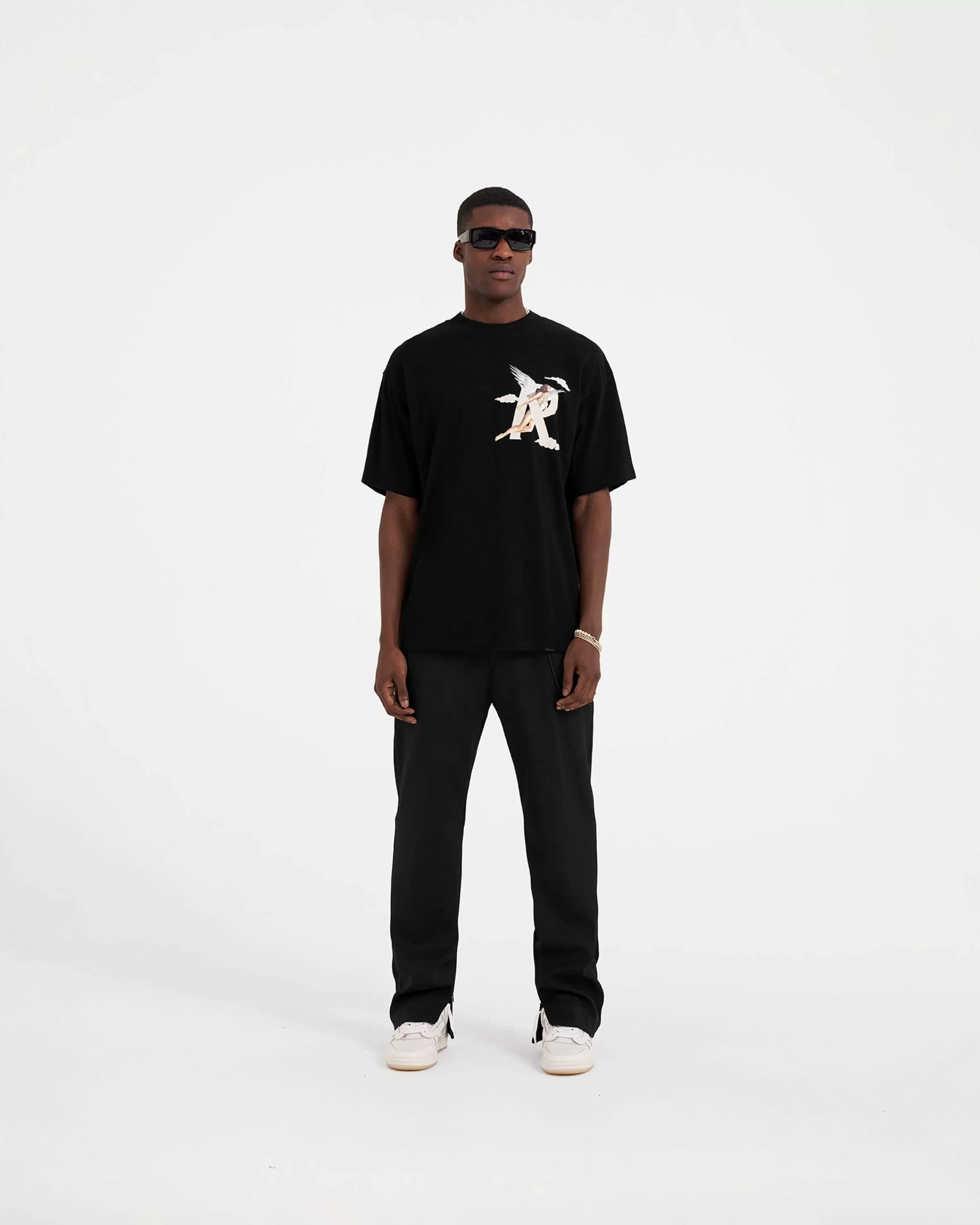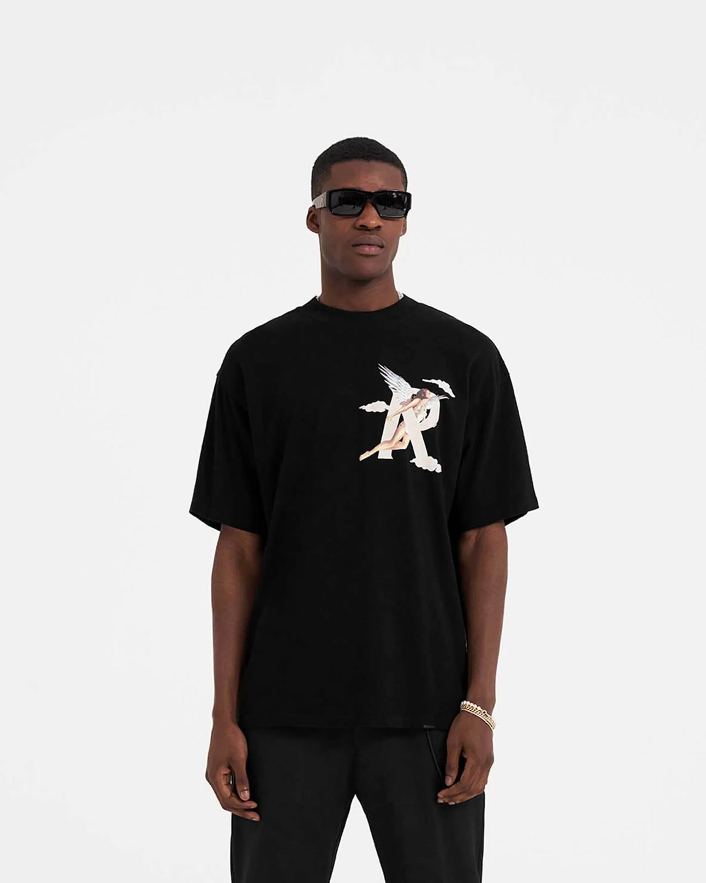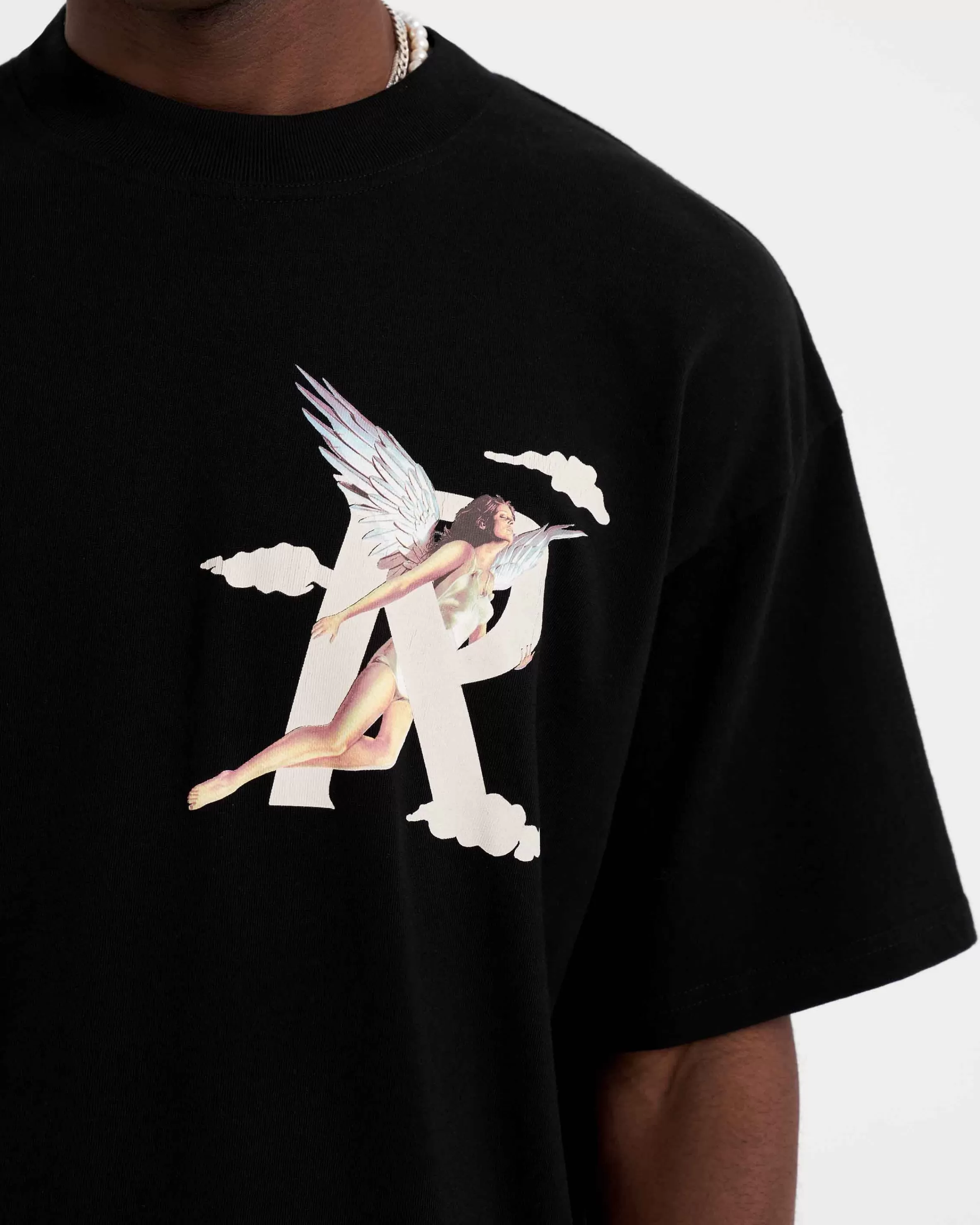 Short Sleeve Black T-Shirt with a slightly oversized fit, crafted from medium weight cotton. The Storms in Heaven T-Shirt features a ribbed crewneck collar and in-house designed graphic to the chest and back. Black Graphic T-Shirt Screen Printed Round Neck Short Sleeves Oversized fit Chest u0026amp; Back Graphics Composition: 100% Cotton220gsmModel is 186cm and 74kg wearing size MediumProduct
